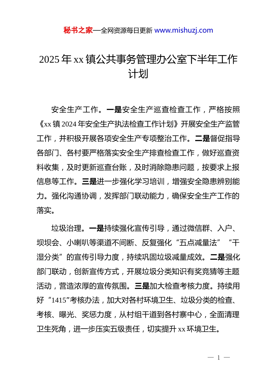 秘书之家—全网资源每日更新 www.mishuzj.com2025 年 xx 镇公共事务管理办公室下半年工作计划安全生产工作。一是安全生产巡查检查工作,严格按照《xx 镇 2024 年安全生产执法检查工作计划》开展安全生产监管工作,并积极开展各项安全生产专项整治工作。二是督促指导各部门、各村要严格落实安全生产排查检查工作,做好巡查资料收集,及时更新巡查台账,及时消除隐患问题,按要求上报信息等工作。三是进一步强化学习培训,增强安全隐患辨别能力。强化沟通协调,发挥部门联动能力,确保安全生产工作的落实。垃圾治理。一是持续强化宣传引导,通过微信群、入户、坝坝会、小喇叭等渠道不间断、反复强化“五点减量法”“干湿分类”的宣传引导力度,持续巩固垃圾减量成效。二是强化部门联动,创新宣传方式,开展垃圾分类知识有奖竞猜等主题活动,营造浓厚的宣传氛围。三是加大检查考核力度。持续用好“1415”考核办法,加大对各村环境卫生、垃圾分类的检查、考核、曝光、奖惩力度,从村组干道到各村寨中心,全面清理卫生死角,进一步压实五级责任,切实提升 xx 环境卫生。— 1 —秘书之家—全网资源每日更新 www.mishuzj.com治房及村镇建设。一是强化安全巡查。组织专人开展房屋安全常态化巡查,督促各村落实属地管理责任,定期排查隐患并及时上报。二是明确责任分工。实行专人专岗管理,细化部门职责分工,确保工作高效有序推进。三是统筹项目推进。围绕宜居农房、旅居农房等重点项目,加强向上级部门对接,科学谋划实施方案,确保项目落地见效。生态环保及治水工作。一是强化宣传引导。积极开展农村“治水”宣传教育,借助手机、广播、宣传手册等媒介,宣传普及农村供水保障工程、生活污水处理设施、生态环境等运维知识,形成人人参与保护生态环境的主体意识。二是强化日常巡查、监管。加大对辖区内污水乱排现象、规模养殖场及散养户的巡查力度,对乱排农户进行引导、劝诫;三是强化考核管理。加大检查、曝光、考核力度,确保整改措施落实到位,工作专班将定期对辖区内各村“治水”及生态环境保护工作开展情况进行督导检查,对存在的问题会及时督促涉及部门限期整改。武装及征兵工作。一是加强民兵军事训练。严格按照省市县训练计划要求,积极组织民兵参加各种军事训练,组织专武干部和民兵应急分队人员参加上级组织的军事训练和理论培训。— 2 —秘书之家—全网资源每日更新 www.mishuzj.com二是进一步摸清适龄青年底数,掌握去向,了解情况,争取在征兵开始前达到报名人数要求,为征兵打好基础;同时征兵中要严把初审关,提高体检政审合格率,为部队多输送合格士兵。三是加强队伍建设。充分发挥民兵队伍主力军、突击队作用,协助各部门做好应急处突和信访维稳工作,完成各级交办的急难险重任务。文化旅游体育工作。一是抓实项目建设。全力保障大洪村文化站项目、水头村全民健身路径项目资金到位后顺利实施,改善旅居点及周边村民健身条件。二是补齐短板着力发展四季旅游。不断深化四季旅居模式,加快落地避暑+采摘+观光+研学模式,围绕规划路线及重点区域,打造四季有吸引力的项目,策划举办风情旅游节等主题活动,有效分流客源,缓解季节压力。三是积极向上争取资金优化基础设施;推出供给适应型亲子活动项目、康养群体医养结合活动、研学团队文化体验的旅居产品。教育工作。一是做好向上对接,争取上级资金注入,改善办学条件,有计划地增添现代化教学设备,不断美化亮化校园环境;二是加大教师队伍建设力度,鼓励加大教师培训力度,多争取机会和创造机会让老师多学习,常提升,让所有教师都— 3 —秘书之家—全网资源每日更新 www.mishuzj.com能适应新课标,全力向课堂要质量,全方位提高课堂教学效果。— 4 —