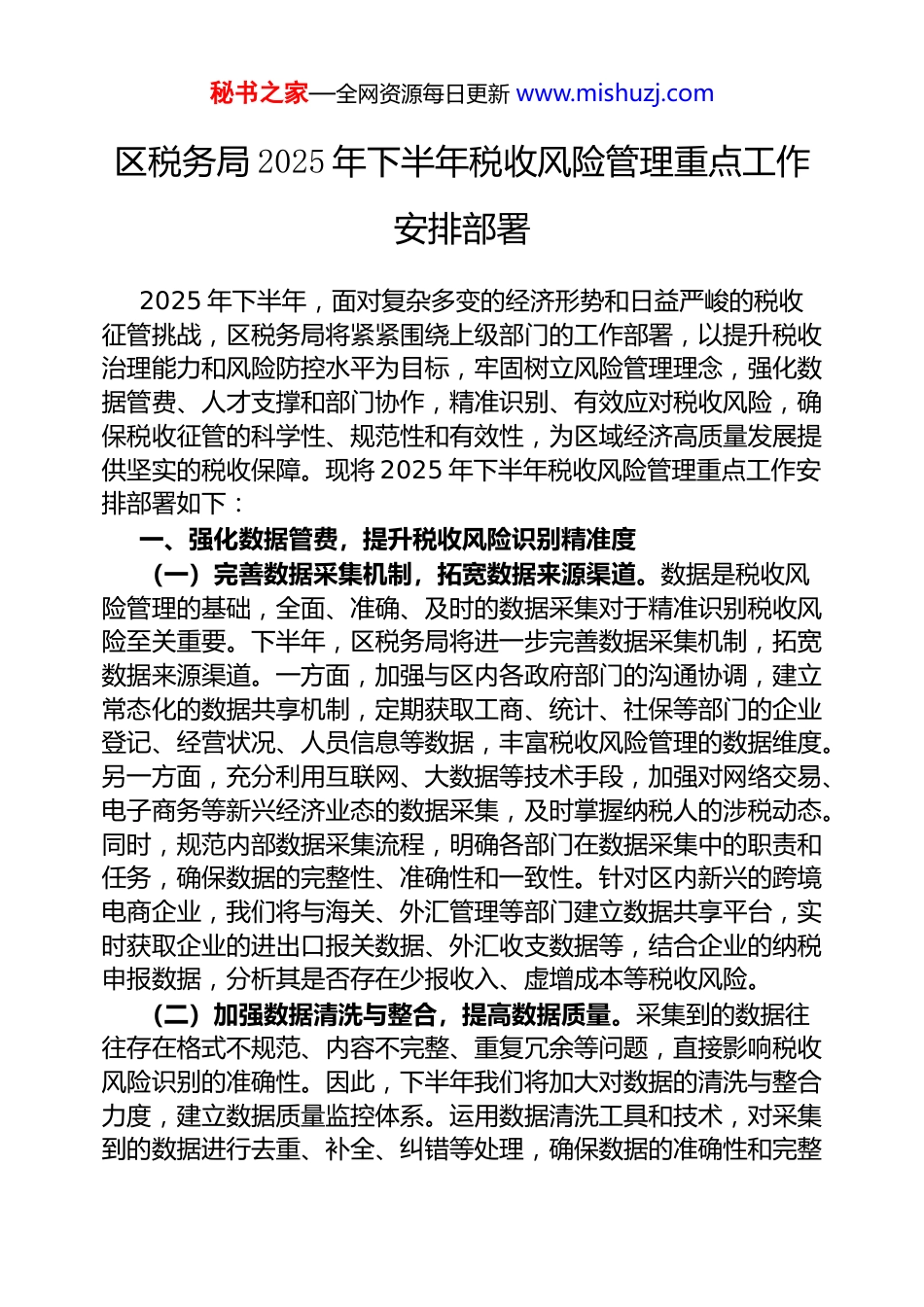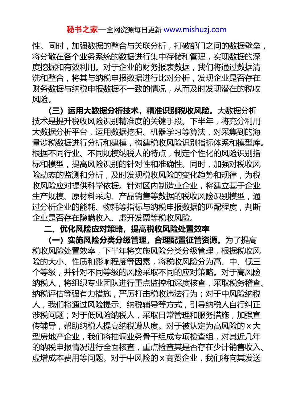 秘书之家—全网资源每日更新 www.mishuzj.com区税务局 2025 年下半年税收风险管理重点工作安排部署2025 年下半年,面对复杂多变的经济形势和日益严峻的税收征管挑战,区税务局将紧紧围绕上级部门的工作部署,以提升税收治理能力和风险防控水平为目标,牢固树立风险管理理念,强化数据管费、人才支撑和部门协作,精准识别、有效应对税收风险,确保税收征管的科学性、规范性和有效性,为区域经济高质量发展提供坚实的税收保障。现将 2025 年下半年税收风险管理重点工作安排部署如下:一、强化数据管费,提升税收风险识别精准度(一)完善数据采集机制,拓宽数据来源渠道。数据是税收风险管理的基础,全面、准确、及时的数据采集对于精准识别税收风险至关重要。下半年,区税务局将进一步完善数据采集机制,拓宽数据来源渠道。一方面,加强与区内各政府部门的沟通协调,建立常态化的数据共享机制,定期获取工商、统计、社保等部门的企业登记、经营状况、人员信息等数据,丰富税收风险管理的数据维度。另一方面,充分利用互联网、大数据等技术手段,加强对网络交易、电子商务等新兴经济业态的数据采集,及时掌握纳税人的涉税动态。同时,规范内部数据采集流程,明确各部门在数据采集中的职责和任务,确保数据的完整性、准确性和一致性。针对区内新兴的跨境电商企业,我们将与海关、外汇管理等部门建立数据共享平台,实时获取企业的进出口报关数据、外汇收支数据等,结合企业的纳税申报数据,分析其是否存在少报收入、虚增成本等税收风险。(二)加强数据清洗与整合,提高数据质量。采集到的数据往往存在格式不规范、内容不完整、重复冗余等问题,直接影响税收风险识别的准确性。因此,下半年我们将加大对数据的清洗与整合力度,建立数据质量监控体系。运用数据清洗工具和技术,对采集到的数据进行去重、补全、纠错等处理,确保数据的准确性和完整秘书之家—全网资源每日更新 www.mishuzj.com性。同时,加强数据的整合与关联分析,打破部门之间的数据壁垒,将分散在各个业务系统的数据进行集中存储和管理,实现数据的深度挖掘和有效利用。对于企业的财务报表数据,我们将通过数据清洗和整合,将其与纳税申报数据进行比对分析,发现企业是否存在财务数据与纳税申报数据不一致的情况,从而及时发现潜在的税收风险。(三)运用大数据分析技术,精准识别税收风险。大数据分析技术是提升税收风险识别精准度的关键手段。下半年,将充分利用大数据分析平台,运用数据挖掘、机器学习等算法,对采集到的海量涉税数据进行分析和建模,构建税收风险识别指标体系和模型库。根据不同行业、不同规模纳税人的特点,制定个性化的风险识别指标和模型,提高风险识别的针对性和准确性。同时,加强对税收风险动态的监测和分析,及时发现税收风险的变化趋势和规律,为税收风险应对提供科学依据。针对区内制造业企业,将建立基于企业生产规模、原材料采购、产品销售等数据的税收风险识别模型,通过分析企业的能耗、物耗等指标与纳税申报数据的匹配程度,判断企业是否存在隐瞒收入、虚开发票等税收风险。二、优化风险应对策略,提高税收风险处置效率(一)实施风险分类分级管理,合理配置征管资源。为了提高税收风险处置效率,下半年将实施风险分类分级管理,根据税收风险的大小、性质和影响程度等因素,将税收风险分为高、中、低三个等级,并针对不同等级的风险采取不同的应对策略。对于高风险纳税人,将组织专业团队进行重点监控和深度核查,采取税务稽查、纳税评估等强有力措施,严厉打击税收违法行为;对于中风险纳税人,我们将通过风险提示、纳税辅导等方式,引导纳税人自行纠正涉税问题;对于低风险纳税人,采取日常管理和服务措施,加强宣传辅导,帮助纳税人提高纳税遵从度。对于被认定为高风险的 x 大型房地产企业,我们将抽调业务骨干组成专项检查组,对其近几年的纳税申报情况进行全面核查,重点检查其是否存在少计销售收入、虚增成本费用等问题。对于中风险的 x 商贸企业,我们将向其发送秘书之家—全网资源每日更新 www.mishuzj.com风险提示函,提醒其可能存在的涉税风险,并安排专人进...
