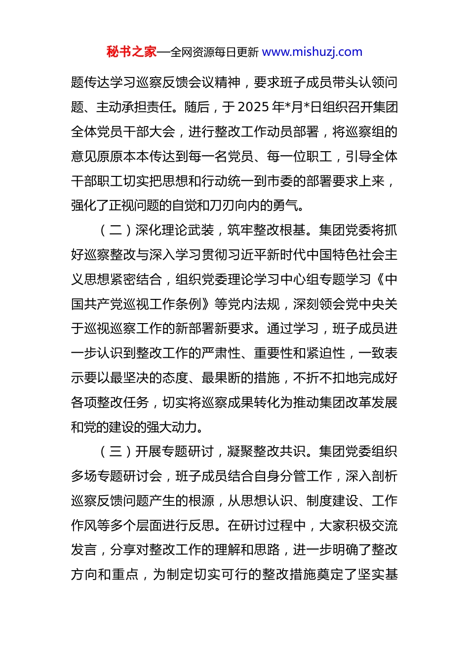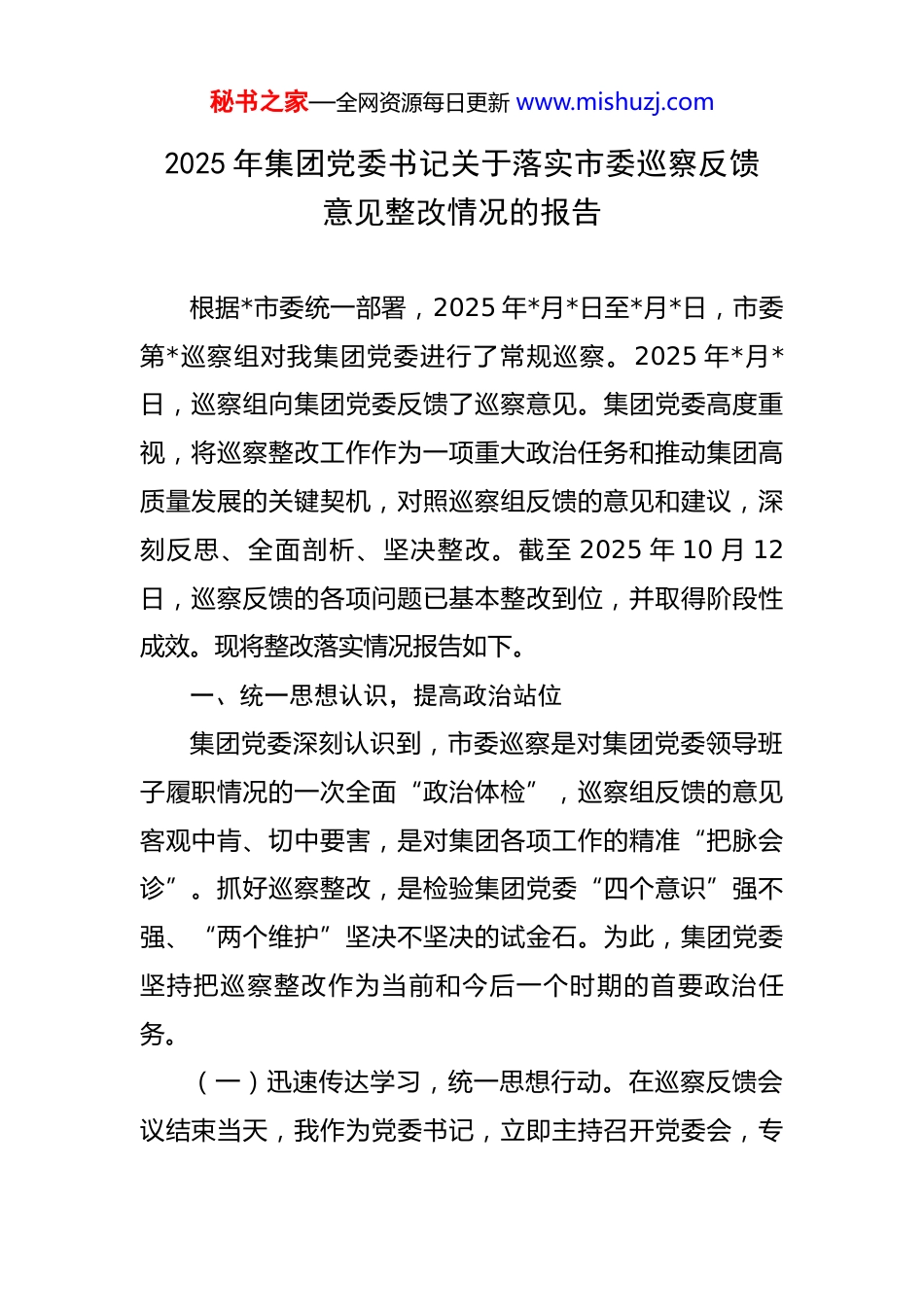 秘书之家—全网资源每日更新 www.mishuzj.com2025 年集团党委书记关于落实市委巡察反馈意见整改情况的报告 根据*市委统一部署,2025 年*月*日至*月*日,市委第*巡察组对我集团党委进行了常规巡察。2025 年*月*日,巡察组向集团党委反馈了巡察意见。集团党委高度重视,将巡察整改工作作为一项重大政治任务和推动集团高质量发展的关键契机,对照巡察组反馈的意见和建议,深刻反思、全面剖析、坚决整改。截至 2025 年 10 月 12日,巡察反馈的各项问题已基本整改到位,并取得阶段性成效。现将整改落实情况报告如下。一、统一思想认识,提高政治站位集团党委深刻认识到,市委巡察是对集团党委领导班子履职情况的一次全面“政治体检”,巡察组反馈的意见客观中肯、切中要害,是对集团各项工作的精准“把脉会诊”。抓好巡察整改,是检验集团党委“四个意识”强不强、“两个维护”坚决不坚决的试金石。为此,集团党委坚持把巡察整改作为当前和今后一个时期的首要政治任务。(一)迅速传达学习,统一思想行动。在巡察反馈会议结束当天,我作为党委书记,立即主持召开党委会,专秘书之家—全网资源每日更新 www.mishuzj.com题传达学习巡察反馈会议精神,要求班子成员带头认领问题、主动承担责任。随后,于 2025 年*月*日组织召开集团全体党员干部大会,进行整改工作动员部署,将巡察组的意见原原本本传达到每一名党员、每一位职工,引导全体干部职工切实把思想和行动统一到市委的部署要求上来,强化了正视问题的自觉和刀刃向内的勇气。(二)深化理论武装,筑牢整改根基。集团党委将抓好巡察整改与深入学习贯彻习近平新时代中国特色社会主义思想紧密结合,组织党委理论学习中心组专题学习《中国共产党巡视工作条例》等党内法规,深刻领会党中央关于巡视巡察工作的新部署新要求。通过学习,班子成员进一步认识到整改工作的严肃性、重要性和紧迫性,一致表示要以最坚决的态度、最果断的措施,不折不扣地完成好各项整改任务,切实将巡察成果转化为推动集团改革发展和党的建设的强大动力。(三)开展专题研讨,凝聚整改共识。集团党委组织多场专题研讨会,班子成员结合自身分管工作,深入剖析巡察反馈问题产生的根源,从思想认识、制度建设、工作作风等多个层面进行反思。在研讨过程中,大家积极交流发言,分享对整改工作的理解和思路,进一步明确了整改方向和重点,为制定切实可行的整改措施奠定了坚实基秘书之家—全网资源每日更新 www.mishuzj.com础。同时,通过专题研讨,增强了班子成员之间的沟通与协作,形成了上下一心、共同推进整改工作的良好氛围。(四)加强宣传引导,营造整改氛围。集团充分利用内部宣传平台,如企业官网、内部刊物、宣传栏等,及时发布巡察整改工作进展情况、整改措施以及取得的阶段性成效。通过宣传先进典型和整改工作中的好经验、好做法,激励广大干部职工积极参与整改工作。同时,设立整改工作意见箱,广泛征求职工群众对整改工作的意见和建议,让职工群众参与到整改监督中来,营造了全员关注整改、支持整改、参与整改的良好氛围。二、加强组织领导,成立领导小组为确保巡察整改工作有力有序有效推进,集团党委坚持高位推动、顶格部署,第一时间建立起强有力的组织领导体系。(一)成立整改领导小组。集团党委决定成立巡察整改工作领导小组,由我本人担任组长,对整改工作负总责、亲自抓,党委副书记、总经理*同志和纪委书记*同志担任副组长,协助抓好具体工作,其他班子成员为小组成员,按照“一岗双责”要求,负责分管领域内的整改任务。这一组织架构确保了整改工作有核心领导、有专人负责、有强大合力。秘书之家—全网资源每日更新 www.mishuzj.com(二)设立专门工作机构。领导小组下设办公室,办公室设在集团党委办公室,由党委办公室主任兼任办公室主任,并从纪检监察室、人力资源部、综合办公室等部门抽调精干力量,组成工作专班。办公室主要负责整改工作的日常协调、跟踪督办、信息汇总、材料报送和档案管理等工作,确保集团党委的各项决策部署能够迅速传导、高效执行。(三)明确职责分工。领导小组严格按照“谁主管、谁负责”的原则,对...
