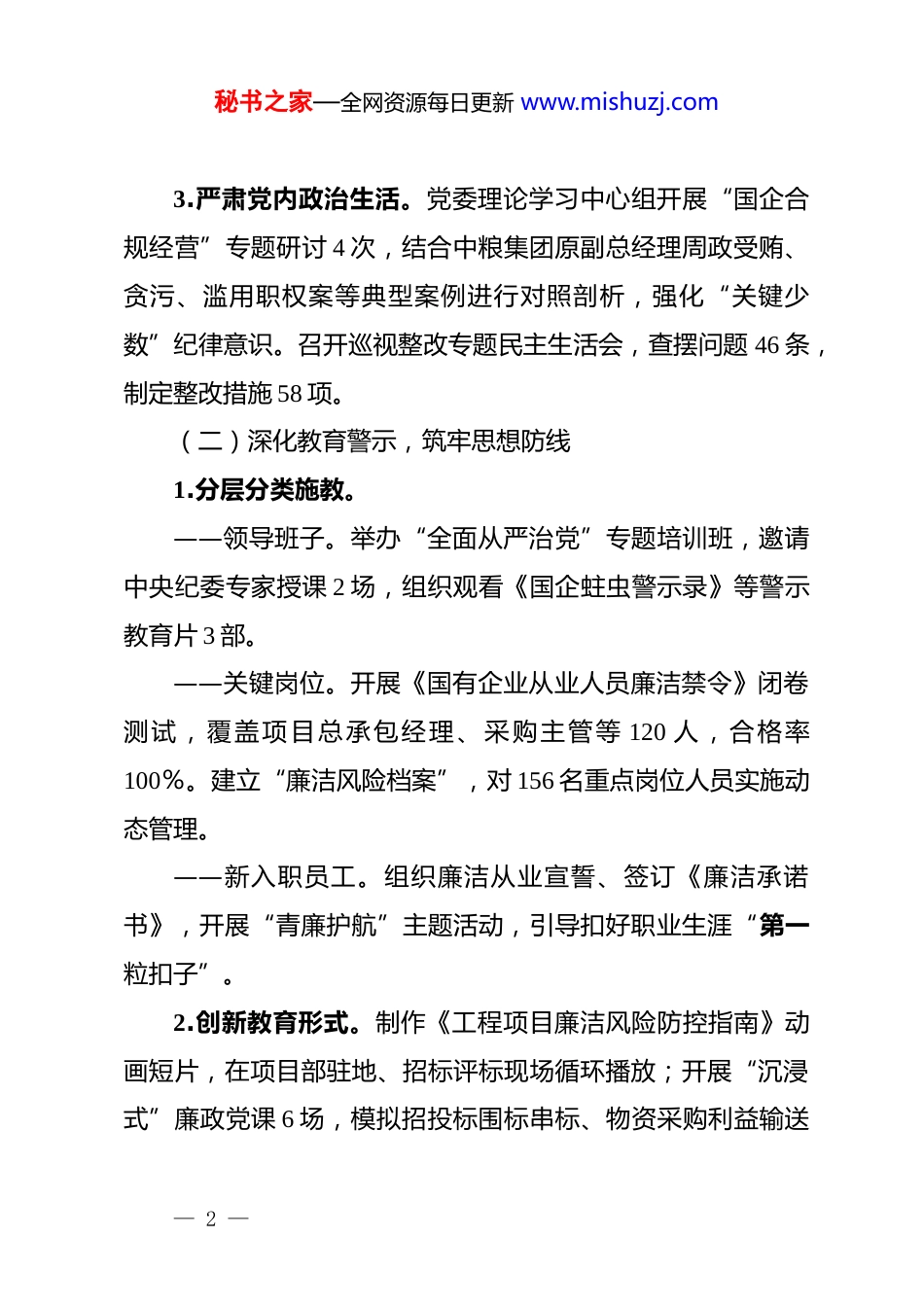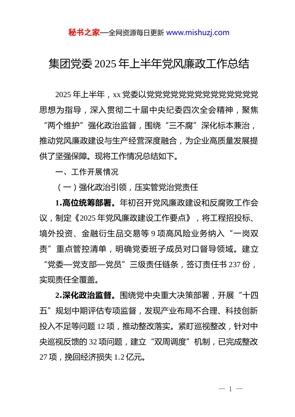 秘书之家—全网资源每日更新 www.mishuzj.com集团党委 2025 年上半年党风廉政工作总结2025 年上半年,xx 党委以党党党党党党党党党党党党党党思想为指导,深入贯彻二十届中央纪委四次全会精神,聚焦“两个维护”强化政治监督,围绕“三不腐”深化标本兼治,推动党风廉政建设与生产经营深度融合,为企业高质量发展提供了坚强保障。现将工作情况总结如下。一、工作开展情况(一)强化政治引领,压实管党治党责任1.高位统筹部署。年初召开党风廉政建设和反腐败工作会议,制定《2025 年党风廉政建设工作要点》,将工程招投标、境外投资、金融衍生品交易等 9 项高风险业务纳入“一岗双责”重点管控清单,明确党委班子成员对口督导领域。建立“党委—党支部—党员”三级责任链条,签订责任书 237 份,实现责任全覆盖。2.深化政治监督。围绕党中央重大决策部署,开展“十四五”规划中期评估专项监督,发现产业布局不合理、科技创新投入不足等问题 12 项,推动整改落实。紧盯巡视整改,针对中央巡视反馈的 32 项问题,建立“双周调度”机制,已完成整改27 项,挽回经济损失 1.2 亿元。— 1 —秘书之家—全网资源每日更新 www.mishuzj.com3.严肃党内政治生活。党委理论学习中心组开展“国企合规经营”专题研讨 4 次,结合中粮集团原副总经理周政受贿、贪污、滥用职权案等典型案例进行对照剖析,强化“关键少数”纪律意识。召开巡视整改专题民主生活会,查摆问题 46 条,制定整改措施 58 项。(二)深化教育警示,筑牢思想防线1.分层分类施教。——领导班子。举办“全面从严治党”专题培训班,邀请中央纪委专家授课 2 场,组织观看《国企蛀虫警示录》等警示教育片 3 部。——关键岗位。开展《国有企业从业人员廉洁禁令》闭卷测试,覆盖项目总承包经理、采购主管等 120 人,合格率100%。建立“廉洁风险档案”,对 156 名重点岗位人员实施动态管理。——新入职员工。组织廉洁从业宣誓、签订《廉洁承诺书》,开展“青廉护航”主题活动,引导扣好职业生涯“第一粒扣子”。2.创新教育形式。制作《工程项目廉洁风险防控指南》动画短片,在项目部驻地、招标评标现场循环播放;开展“沉浸式”廉政党课 6 场,模拟招投标围标串标、物资采购利益输送— 2 —秘书之家—全网资源每日更新 www.mishuzj.com等场景,增强教育感染力。利用“智慧纪检”平台推送廉洁提醒 2300 余条,发布典型案例 18 期。(三)聚焦风险防控,扎紧制度笼子1.完善制度体系。修订《工程分包管理办法》,增设“黑名单供应商一票否决”条款,上半年否决违规分包商投标资格2 次。制定《新兴产业投资廉洁风险评估指引》,建立绿色环保项目“环境效益廉洁风险”双维度评价模型,评估项目 17 个,否决高风险项目 3 个。2.强化数字化监管。上线“智慧纪检”系统,实现招标文件自动查重、资金支付智能预警功能,触发异常数据报警 11 次,拦截超权限审批 3 起。在房地产开发板块推行“阳光销售”二维码监督平台,客户可实时查询房源状态及价格变动轨迹,累计处理投诉 12 件。3.深化专项治理。开展“靠企吃企”问题专项整治,排查供应商 426 家,发现关联交易、利益输送等问题 27 项,清退违规供应商 12 家,挽回损失 860 万元。针对海外项目,建立“国别风险廉洁风险”双预警机制,对 3 个高风险国家项目实施驻点监督。(四)坚持严的基调,强化监督执纪1.突出重点领域监督。— 3 —秘书之家—全网资源每日更新 www.mishuzj.com——工程建设。开展联合专项检查 3 次,发现合同条款合规性隐患 2 项,推动整改落实。运用“鞍易查”资金分析系统,排查项目资金流向,追回挪用资金 320 万元。——物资采购。建立供应商动态评价系统,处理违规供应商 122 家,斩断“陪标围标”利益链。在集采平台部署 ai 合规审查引擎,拦截高风险合同 36 份,节约成本近千万元。——境外投资。对 5 个海外项目开展“穿透式”监督,发现境外佣金管理不规范等问题 8 项,完善制度 4 项。2.严肃执纪问责。上半年受理问题线索 45 件,立案审查 12件,处分 10 人,其中...