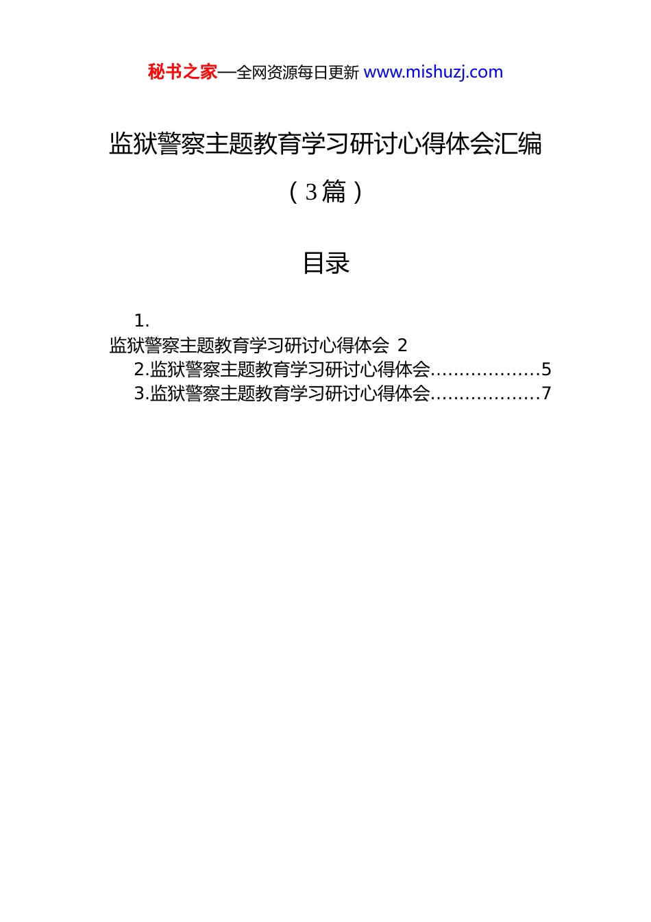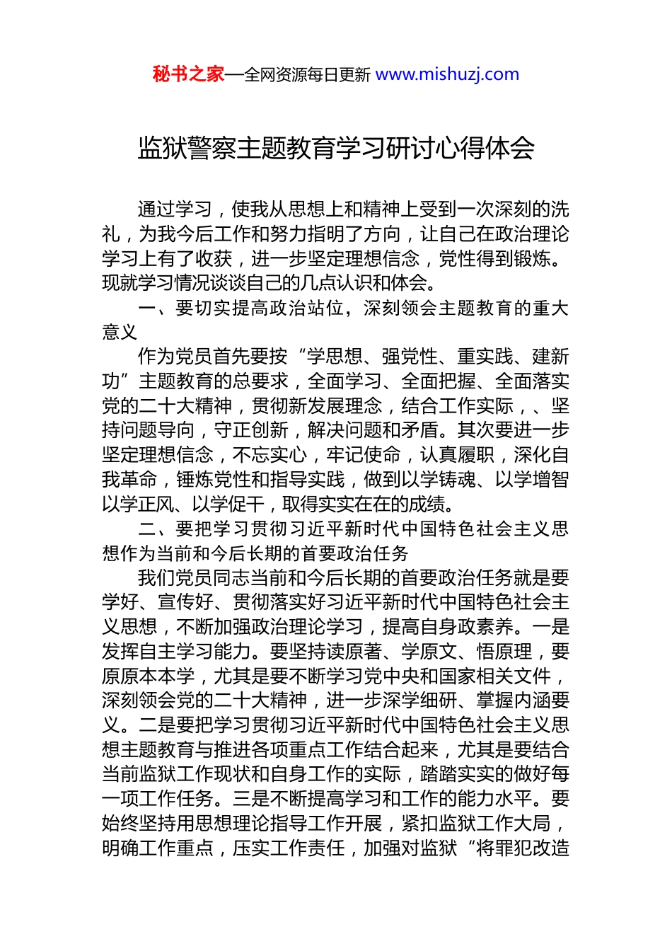 秘书之家—全网资源每日更新 www.mishuzj.com监狱警察主题教育学习研讨心得体会汇编(3 篇)目录1.监狱警察主题教育学习研讨心得体会 22.监狱警察主题教育学习研讨心得体会...................53.监狱警察主题教育学习研讨心得体会...................7秘书之家—全网资源每日更新 www.mishuzj.com监狱警察主题教育学习研讨心得体会通过学习,使我从思想上和精神上受到一次深刻的洗礼,为我今后工作和努力指明了方向,让自己在政治理论学习上有了收获,进一步坚定理想信念,党性得到锻炼。现就学习情况谈谈自己的几点认识和体会。一、要切实提高政治站位,深刻领会主题教育的重大意义作为党员首先要按“学思想、强党性、重实践、建新功”主题教育的总要求,全面学习、全面把握、全面落实党的二十大精神,贯彻新发展理念,结合工作实际,、坚持问题导向,守正创新,解决问题和矛盾。其次要进一步坚定理想信念,不忘实心,牢记使命,认真履职,深化自我革命,锤炼党性和指导实践,做到以学铸魂、以学增智以学正风、以学促干,取得实实在在的成绩。二、要把学习贯彻习近平新时代中国特色社会主义思想作为当前和今后长期的首要政治任务我们党员同志当前和今后长期的首要政治任务就是要学好、宣传好、贯彻落实好习近平新时代中国特色社会主义思想,不断加强政治理论学习,提高自身政素养。一是发挥自主学习能力。要坚持读原著、学原文、悟原理,要原原本本学,尤其是要不断学习党中央和国家相关文件,深刻领会党的二十大精神,进一步深学细研、掌握内涵要义。二是要把学习贯彻习近平新时代中国特色社会主义思想主题教育与推进各项重点工作结合起来,尤其是要结合当前监狱工作现状和自身工作的实际,踏踏实实的做好每一项工作任务。三是不断提高学习和工作的能力水平。要始终坚持用思想理论指导工作开展,紧扣监狱工作大局,明确工作重点,压实工作责任,加强对监狱“将罪犯改造秘书之家—全网资源每日更新 www.mishuzj.com成守法公民”这一主责主业的认识、分析和研究,不断提升做好各项工作的能力。三、要严守党的政治纪律和政治规矩,加强党性修养,争做优秀党员强党性,是主题教育的总要求,如何加强党性修养,做一名好党员呢?我认为,首先要严守党的政治纪律和政治规矩,以党规党纪为准绳,时刻紧绷廉洁自律这根弦,遵守廉洁自律各项规定,不越红线、不逾规矩。其次是要强化自我修炼、自我约束、自我塑造,严格执行“中央八项规定”、遵守未管所“八小时以外”相关规定,做到时刻保持清醒的头脑,自觉接受组织和群众的监督。四、切实改进工作作风,为未管所高质量发展添砖加瓦开展主题教育的目的就是要把学习成效转化为推动工作的强大动力。因此,首先要切实转变工作作风。结合“两个革命”要求,树立“今天再晚也是早,明天再早也是晚”的理念,不断强化责任意识,勇于担当,把自己摆进去,把职责摆进去,把工作摆进去,认真履职尽责。二是要坚持问题导向。当前,本人在三管区轮岗锻炼,面对不熟悉不了解的工作领域,感到疑惑;对如何管理教育改造罪犯,缺乏经验;对如何从办公室的角度更好服务基层有待提高。通过本次学习,我将紧紧跟随所党委,忠诚履行党和人民赋予的任务,深入推进平安监狱要求,推进法治监狱建设,为未管所事业发展做出应有贡献。秘书之家—全网资源每日更新 www.mishuzj.com监狱警察主题教育学习研讨心得体会通过参加此次主题教育的学习,有以下心得:一、坚定立场,加强政治学习,加强党性修养,不断提高自身素质修养要认真学习贯彻党的二十大精神,坚决拥护“两个确立”,增强“四个意识”,坚定“四个自信”,做到“两个维护”,用党的创新理论武装头脑、指导实践,更加坚定、更加自觉地践行初心使命。作为一名监狱人民警察,要有坚定的政治立场,时刻同中央保持高度的一致。要严格遵守《监狱法》《人民警察法》等法律和司法部、省司法厅、省局各项规章制度。树立全心全意为人民服务的宗旨意识,打牢“立警为公、执法为民”的思想,同时自觉学习政治理论,主动回顾我党创业历程,坚持用科学发展观武装头脑,增强走科学发展道路的坚定性,提高推动科...