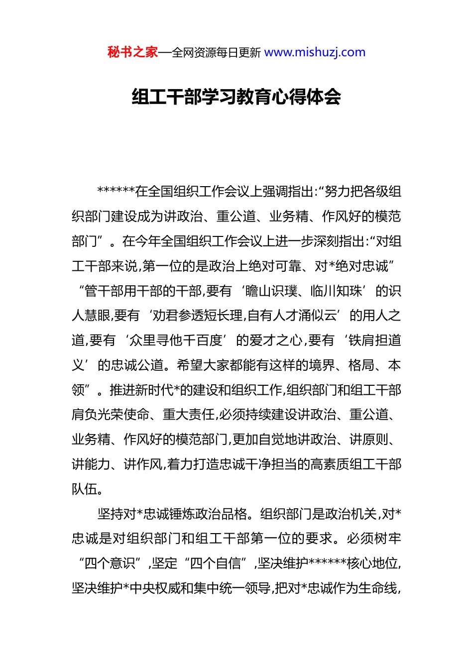 秘书之家—全网资源每日更新 www.mishuzj.com组工干部学习教育心得体会******在全国组织工作会议上强调指出:“努力把各级组织部门建设成为讲政治、重公道、业务精、作风好的模范部门”。在今年全国组织工作会议上进一步深刻指出:“对组工干部来说,第一位的是政治上绝对可靠、对*绝对忠诚”“管干部用干部的干部,要有‘瞻山识璞、临川知珠’的识人慧眼,要有‘劝君参透短长理,自有人才涌似云’的用人之道,要有‘众里寻他千百度’的爱才之心,要有‘铁肩担道义’的忠诚公道。希望大家都能有这样的境界、格局、本领”。推进新时代*的建设和组织工作,组织部门和组工干部肩负光荣使命、重大责任,必须持续建设讲政治、重公道、业务精、作风好的模范部门,更加自觉地讲政治、讲原则、讲能力、讲作风,着力打造忠诚干净担当的高素质组工干部队伍。 坚持对*忠诚锤炼政治品格。组织部门是政治机关,对*忠诚是对组织部门和组工干部第一位的要求。必须树牢“四个意识”,坚定“四个自信”,坚决维护******核心地位,坚决维护*中央权威和集中统一领导,把对*忠诚作为生命线,秘书之家—全网资源每日更新 www.mishuzj.com在*言*、在*爱*、在*忧*、在*为*,做到政治上绝对可靠、对*绝对忠诚。坚定共产主义远大理想和中国特色社会主义共同理想,在大是大非问题上旗帜鲜明、立场坚定。深入学习贯彻**************思想,带头开展深入贯彻中央八项规定精神学习教育,不断筑牢理想信念,找准工作方向,明晰思路举措,优化路径方法。坚持*的组织路线为*的政治路线服务,确保研究制定政策准确把握政治方向,谋划推进工作全面贯彻政治要求,解决矛盾问题切实注重政治影响,担负好管*治*政治责任。坚持把政治站位和职责定位有机融合起来,做到*中央有号召、有部署,组织部门、组工干部就有坚决的行动、坚决的落实。 坚持公道正派锤炼格局境界。公道正派是组织工作的生命线,是组工干部必须具备的职业操守。做好新时代的组织工作,必须坚持出以公心、秉公用权,坚持*的原则第一、*的事业第一、人民利益第一,坚持事业为上、以事择人、人事相宜,公道对待干部、公平评价干部、公正使用干部,知人善任,为*和人民把好选人用人关。坚持严格标准、严格程序、严明纪律,做到坚持原则不动摇、执行标准不走样、履行程序不变通、遵守纪律不放松,严格按*的政策办事、按规章制度办事、按组织程序办事,不存私心、不掺私货、不徇私情,不拿原则换人情,不用权力搞交易。坚持心存敬畏、行有所秘书之家—全网资源每日更新 www.mishuzj.com止,守住底线、不踩红线、不碰高压线,把该履行的职责履行好,该把的关把好,该报告的情况及时报告好,把公道正派体现在一言一行中,体现在不断提升的识人慧眼、用人之道、爱才之心中。坚持甘为人梯、甘于奉献,坚守“人梯”应有的品质、境界,养成平静、平和的心态,守得住清贫,耐得住寂寞,经得住诱惑。对名利想得少一些、看得淡一些,对工作、对群众想得多一些、看得重一些,把奉献当成一种人生态度和价值取向,克己奉公,无怨无悔,做优秀的干部,不做优越的干部。 坚持臻于至善锤炼过硬本领。组织工作是一门科学,只有具备过硬的专业能力、专业素养、专业精神,才能真正干好干出成效。必须强化战略思维、创新思维、辩证思维、法治思维、底线思维,善于把握规律、运用规律,不断增强工作的原则性、系统性、预见性、创造性。善于解构问题,搞清内涵外延,构建逻辑体系,形成工作闭环,深化运用“五步工作法”,以项目化、工程化、具体化推进工作落实。必须增强专业能力,加大组工干部培训力度,鼓励支持组工干部开展自主学习、参加学历继续教育,通过交流轮岗,业务培训、岗位练兵、实践锻炼,不断练就干事成事的真本领。坚持“安、专、迷”,大力弘扬专业精神,干一行爱一行,钻一行精一行,管一行像一行,以科学的态度和高度的使命感、强烈的事业秘书之家—全网资源每日更新 www.mishuzj.com心对待事业、对待工作,在勤学苦干、多思善悟中成为组织工作行家里手。 坚持从严从实锤炼优良作风。组织部门作为管*治*的重要职能部门,只有自身作风扎实过硬,才有底气管好别人。组工干部既要有会干事、干成事的本领,更要有不坏事、不出事的定力。带头严格...