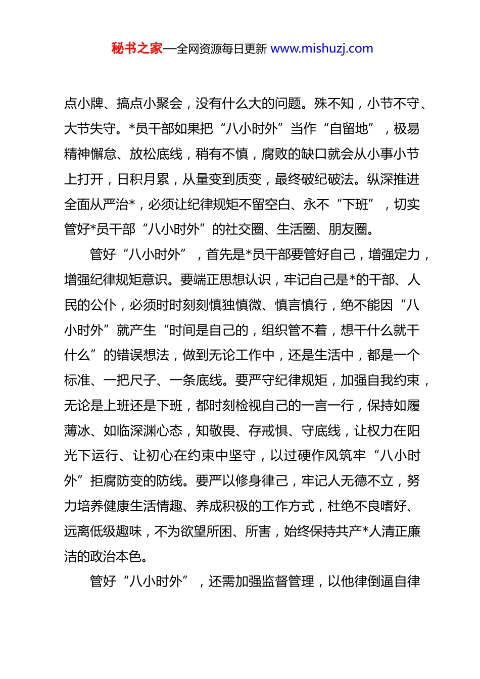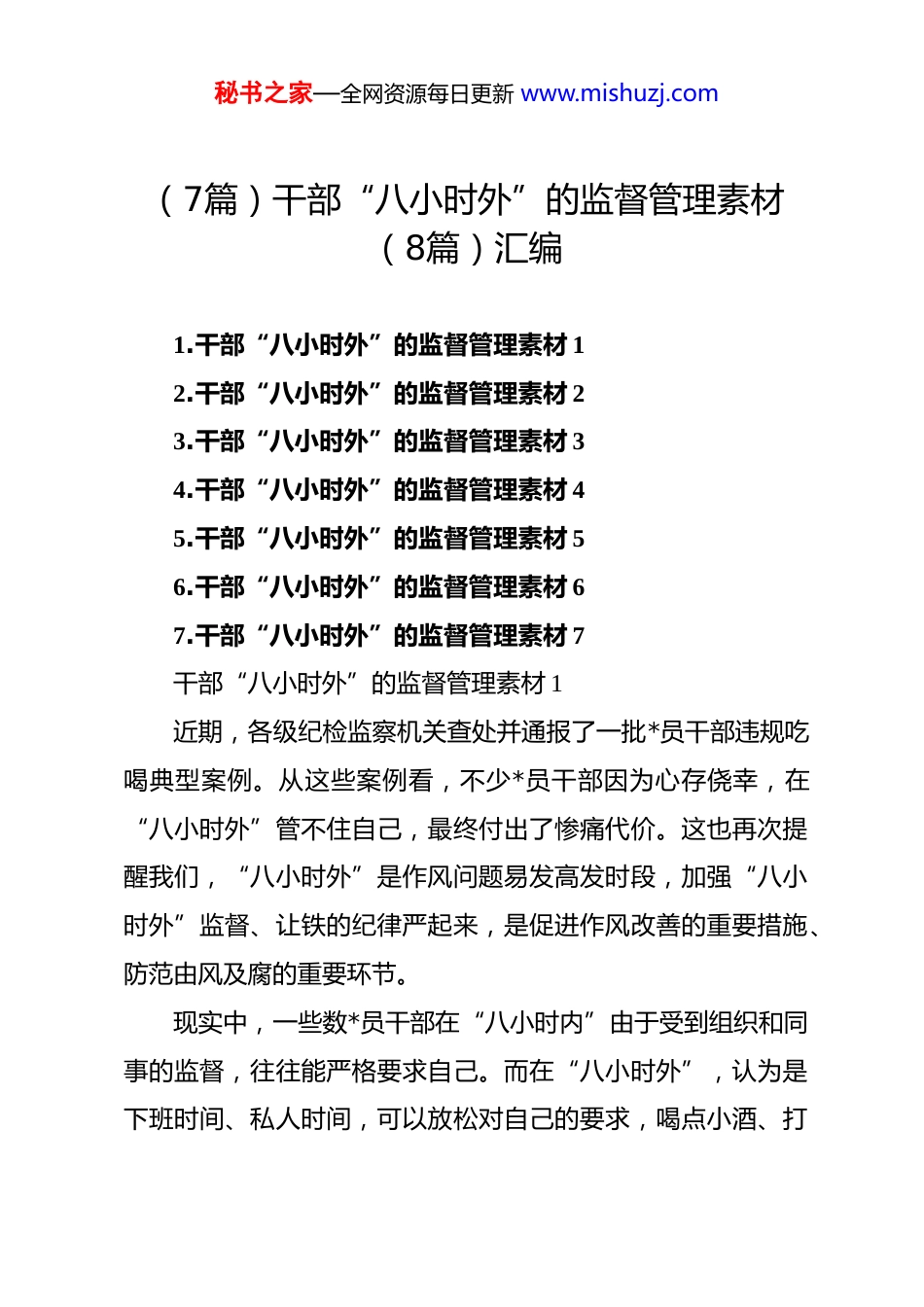秘书之家—全网资源每日更新 www.mishuzj.com(7篇)干部“八小时外”的监督管理素材(8篇)汇编1.干部“八小时外”的监督管理素材 12.干部“八小时外”的监督管理素材 23.干部“八小时外”的监督管理素材 34.干部“八小时外”的监督管理素材 45.干部“八小时外”的监督管理素材 56.干部“八小时外”的监督管理素材 67.干部“八小时外”的监督管理素材 7干部“八小时外”的监督管理素材 1近期,各级纪检监察机关查处并通报了一批*员干部违规吃喝典型案例。从这些案例看,不少*员干部因为心存侥幸,在“八小时外”管不住自己,最终付出了惨痛代价。这也再次提醒我们,“八小时外”是作风问题易发高发时段,加强“八小时外”监督、让铁的纪律严起来,是促进作风改善的重要措施、防范由风及腐的重要环节。现实中,一些数*员干部在“八小时内”由于受到组织和同事的监督,往往能严格要求自己。而在“八小时外”,认为是下班时间、私人时间,可以放松对自己的要求,喝点小酒、打秘书之家—全网资源每日更新 www.mishuzj.com点小牌、搞点小聚会,没有什么大的问题。殊不知,小节不守、大节失守。*员干部如果把“八小时外”当作“自留地”,极易精神懈怠、放松底线,稍有不慎,腐败的缺口就会从小事小节上打开,日积月累,从量变到质变,最终破纪破法。纵深推进全面从严治*,必须让纪律规矩不留空白、永不“下班”,切实管好*员干部“八小时外”的社交圈、生活圈、朋友圈。管好“八小时外”,首先是*员干部要管好自己,增强定力,增强纪律规矩意识。要端正思想认识,牢记自己是*的干部、人民的公仆,必须时时刻刻慎独慎微、慎言慎行,绝不能因“八小时外”就产生“时间是自己的,组织管不着,想干什么就干什么”的错误想法,做到无论工作中,还是生活中,都是一个标准、一把尺子、一条底线。要严守纪律规矩,加强自我约束,无论是上班还是下班,都时刻检视自己的一言一行,保持如履薄冰、如临深渊心态,知敬畏、存戒惧、守底线,让权力在阳光下运行、让初心在约束中坚守,以过硬作风筑牢“八小时外”拒腐防变的防线。要严以修身律己,牢记人无德不立,努力培养健康生活情趣、养成积极的工作方式,杜绝不良嗜好、远离低级趣味,不为欲望所困、所害,始终保持共产*人清正廉洁的政治本色。管好“八小时外”,还需加强监督管理,以他律倒逼自律秘书之家—全网资源每日更新 www.mishuzj.com《关于新形势下*内政治生活的若干准则》《中国共产 dj 律处分条例》等规定,对*员干部“八小时外”的作风要求、言行准则以及违纪情形作出了规定。各级*组织要把全面从严治*要求贯穿“八小时内外”,加强日常教育管理监督,引导*员干部筑牢思想防线,自觉规范“八小时外”的言行;深化纪律教育,让*员干部清楚知道“八小时外”能够做什么、禁止做什么、警惕哪一些,更好地遵规守纪、规范言行,自觉抵制违规吃喝等不良风气;对*员干部“八小时外”的苗头性倾向性问题,提前发现、介入、处理,有效遏制不良态势发展,防止“小毛病”演变成“大问题”。各级纪检监察机关要强化监督执纪,紧盯关键人、关键事、关键时间节点,创新监督手段,对顶风违纪行为露头就打、从严查处,对性质恶劣的及时通报曝光,强化警示震慑、警钟长鸣,让 dj 国法在“八小时内外”都立起来、严起来。对*员干部而言,“八小时外”不是例外,而是对品质和修养的考验。每个*员干部都应在“八小时内外”的工作和生活中谦虚谨慎、严格自律,始终干干净净做人、清清白白做事,努力为全省加快建成中部地区崛起的重要战略支点作出更大贡献。干部“八小时外”的监督管理素材 2近日,黑龙江伊春市出台市管领导干部社会交往和网络行秘书之家—全网资源每日更新 www.mishuzj.com为监督管理办法,聚焦领导干部管理监督的薄弱环节,通过明确监督内容、拓展监督手段、规范处置流程等方式,将干部监督触角延伸至“八小时外”的生活圈、社交圈和网络圈。明确领导干部社会交往“八个不准”和网络行为“八个不得”,对领导干部行为提出更加具体、细化的规范性要求。各级*组织主要负责同志对领导干部进行廉政谈话,及时“咬耳扯袖”。将...