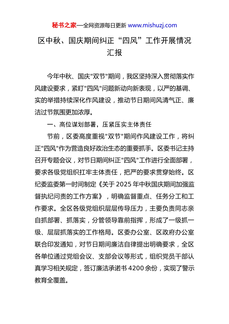 秘书之家—全网资源每日更新 www.mishuzj.com区中秋、国庆期间纠正“四风”工作开展情况汇报 今年中秋、国庆"双节"期间,我区坚持深入贯彻落实作风建设要求,紧盯"四风"问题新动向新表现,以严的基调、实的举措持续深化作风建设,推动节日期间风清气正、廉洁过节氛围更加浓厚。一、高位谋划部署,压紧压实主体责任节前,区委高度重视"双节"期间作风建设工作,将纠正"四风"作为营造良好政治生态的重要抓手。区委书记主持召开专题会议,对节日期间纠正"四风"工作进行全面部署,要求各级党组织扛牢主体责任,把严的要求贯穿始终。区纪委监委第一时间制定《关于 2025 年中秋国庆期间加强监督执纪问责的工作方案》,明确监督重点、任务分工和工作要求。全区各级党组织层层传导压力,主要负责同志亲自抓部署、抓落实,分管领导靠前指挥,形成了一级抓一级、层层抓落实的工作格局。区委办公室、区政府办公室联合印发通知,对节日期间廉洁自律提出明确要求,全区各单位通过党组会议、支部会议等形式,组织党员干部认真学习相关规定,签订廉洁承诺书 4200 余份,实现了警示教育全覆盖。秘书之家—全网资源每日更新 www.mishuzj.com二、聚焦重点领域,织密监督执纪网络区纪委监委坚持把监督挺在前面,紧盯公款吃喝、公车私用、违规收送礼品礼金、违规发放津补贴等重点问题,采取明察暗访、交叉检查、突击检查等方式,开展多轮次专项监督检查。节日期间,共组织督查组 12 个,出动检查人员 96 人次,检查党政机关、国有企业、窗口单位、旅游景区等点位 218 个,发现并督促整改问题 15 个。聚焦公款吃喝问题,对全区机关食堂、高档餐厅、农家乐等场所开展突击检查,核查公务接待台账 156 本,查看消费票据 830 余张,未发现违规公款吃喝行为。聚焦公车私用问题,在机关单位、商场超市、旅游景点等区域开展公车使用情况抽查,检查公务用车 238 辆次,对发现的 3 辆公车未按规定停放问题现场督促整改。聚焦违规收送礼品礼金问题,重点检查党员领导干部操办婚丧喜庆事宜报备情况,核查报备事项 23 件,均符合规定要求。三、创新监督方式,提升监督质效区纪委监委充分运用信息化手段,建立"四风"问题线索快速处置机制。畅通"12388"举报电话、区纪委监委网站、微信公众号等举报渠道,公布值班电话和举报邮箱,节日期间共接收群众举报信息 17 条,均已及时核查处理。建立区、街道、社区三级监督网络,发挥基层纪检监察组秘书之家—全网资源每日更新 www.mishuzj.com织"前哨"作用,及时发现和报告"四风"问题线索。在全区主要路段、商场、景区等人流密集区域设置监督岗,安排纪检监察干部值守,对公车私用、违规吃请等问题进行现场监督。创新开展"随手拍"监督活动,鼓励群众通过手机随时随地举报身边的"四风"问题,形成了全方位、立体化的监督格局。节日期间,通过"随手拍"平台收到问题线索 8 条,经核查后立案查处 2 起,给予党纪处分 2 人。四、强化警示教育,筑牢思想防线节前,区纪委监委召开全区警示教育大会,通报近年来查处的违反纪律规定典型案例 8 起,用身边事教育身边人。编印《违反纪律规定精神典型案例汇编》,发放至全区各级党组织,组织党员干部深入学习。充分利用区融媒体中心平台,开设"节日'四风'随手拍"专栏,每日推送廉洁过节提醒信息,在全区营造浓厚的廉洁氛围。节日期间,通过短信、微信等方式向全区党员干部发送廉洁提醒短信 5轮次,覆盖党员干部 6800 余人次。区属各单位通过电子显示屏滚动播放廉洁过节标语,在办公场所张贴廉洁提醒海报,让纪律规矩入脑入心。区委组织部将廉洁过节情况纳入领导班子和领导干部年度考核内容,引导党员干部时刻绷紧纪律这根弦。五、坚持从严执纪,保持高压震慑态势秘书之家—全网资源每日更新 www.mishuzj.com区纪委监委坚持零容忍态度,对节日期间顶风违纪问题快查严处、决不姑息。对发现的违纪问题线索,第一时间启动核查程序,做到件件有着落、事事有回音。节日期间,共查处违反纪律规定精神问题 3 起,给予党纪处分 3人,其中,某街道办事处副主任违规接受管理服务对象宴请,受到党内警告处分并...
