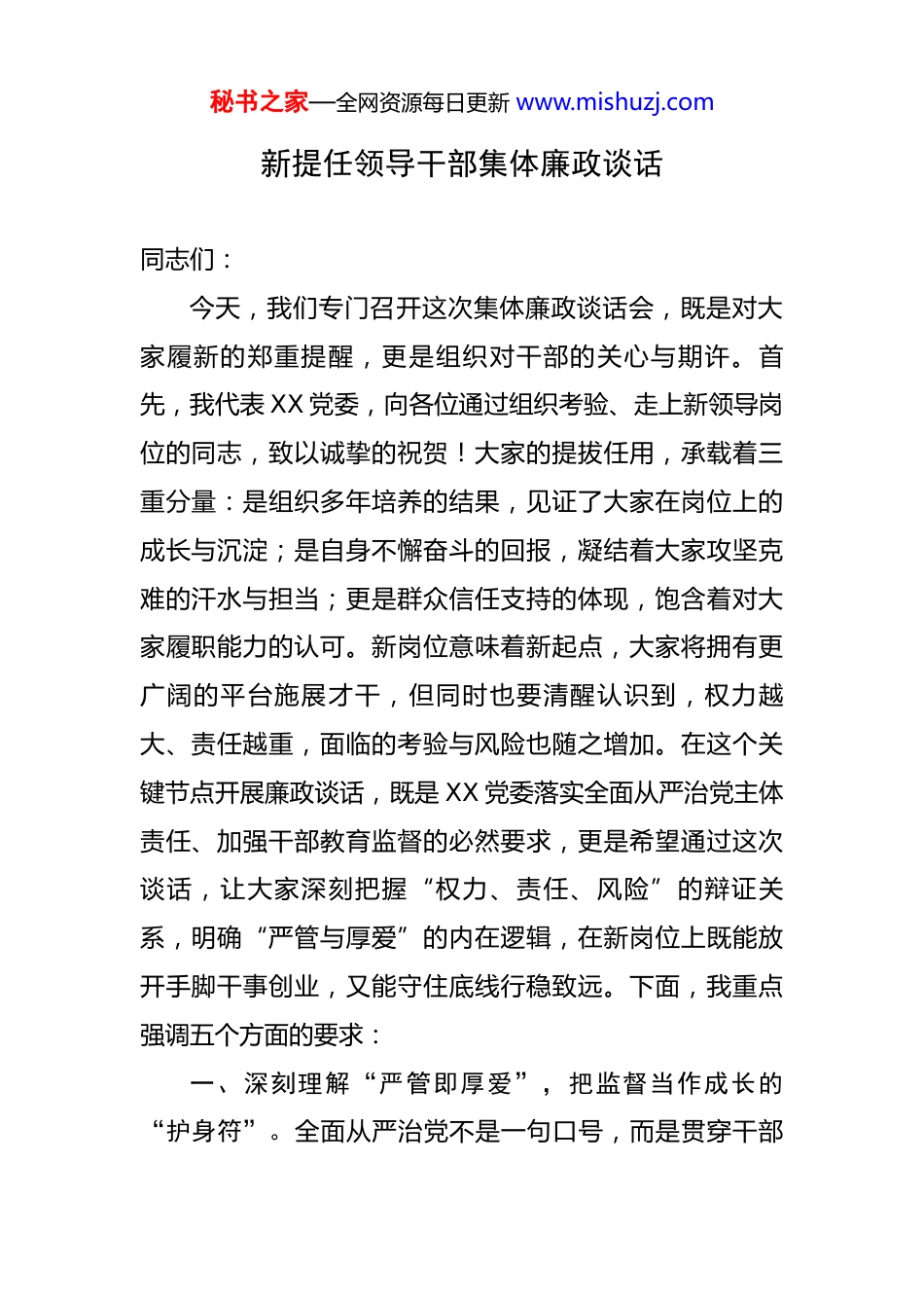 秘书之家—全网资源每日更新 www.mishuzj.com新提任领导干部集体廉政谈话 同志们:今天,我们专门召开这次集体廉政谈话会,既是对大家履新的郑重提醒,更是组织对干部的关心与期许。首先,我代表 XX 党委,向各位通过组织考验、走上新领导岗位的同志,致以诚挚的祝贺!大家的提拔任用,承载着三重分量:是组织多年培养的结果,见证了大家在岗位上的成长与沉淀;是自身不懈奋斗的回报,凝结着大家攻坚克难的汗水与担当;更是群众信任支持的体现,饱含着对大家履职能力的认可。新岗位意味着新起点,大家将拥有更广阔的平台施展才干,但同时也要清醒认识到,权力越大、责任越重,面临的考验与风险也随之增加。在这个关键节点开展廉政谈话,既是 XX 党委落实全面从严治党主体责任、加强干部教育监督的必然要求,更是希望通过这次谈话,让大家深刻把握“权力、责任、风险”的辩证关系,明确“严管与厚爱”的内在逻辑,在新岗位上既能放开手脚干事创业,又能守住底线行稳致远。下面,我重点强调五个方面的要求:一、深刻理解“严管即厚爱”,把监督当作成长的“护身符”。全面从严治党不是一句口号,而是贯穿干部秘书之家—全网资源每日更新 www.mishuzj.com职业生涯的基本准则。对干部严格管理、严格监督,绝不是“不信任”,恰恰是组织最直接的爱护、最有效的保护。大家走上 XX 级领导岗位,手中掌握的资源更多、决策影响更广,自然也会成为别有用心之人“围猎”的目标。现实中,许多落马干部的案例都证明:一旦脱离监督、放松自我要求,小问题会逐渐演变成大错误,最终不仅毁掉个人前程,更会连累家庭、损害组织形象。希望大家从思想上扭转对“严管”的误解,把组织的监督看作“防火墙”而非“紧箍咒”,把纪律的约束当作“导航仪”而非“绊脚石”。要主动接受组织监督、群众监督、舆论监督,习惯在“阳光下”用权、在“探照灯”下工作,让监督成为防范风险、校正偏差的“护身符”,确保手中的权力始终为人民服务、为事业发展服务。二、准确把握“厚爱靠严管”,让约束成为干事的“定心丸”。组织对干部的厚爱,体现在政治上的培养、工作上的支持、待遇上的保障,但这种“厚爱”绝不是无原则的迁就、无底线的纵容。就像父母对孩子的教育,真正的关爱离不开严格的规矩;干部的成长成才,也必须以纪律为底线、以规矩为支撑。没有严管托底的“厚爱”,容易变成“溺爱”,最终只会害了干部。同时要明确:组织鼓励担当作为,绝不是允许“蛮干乱干”;建立容错纠秘书之家—全网资源每日更新 www.mishuzj.com错机制,也不是违规违纪的“护身符”。“三个区分开来”的核心,是为“为公为民、敢闯敢试”的干部撑腰,而非为“谋私谋利、突破底线”的行为开脱。希望大家既要感受到组织的温暖与信任,激发干事创业的热情;也要时刻牢记纪律的红线、法律的底线,始终保持“如临深渊、如履薄冰”的谨慎,让约束成为安心干事的“定心丸”。三、筑牢思想根基,做政治上的“明白人”。理想信念是共产党人的精神之“钙”,思想防线失守,行为就会失去方向。大家作为领导干部,首先要当好“政治上的明白人”。一要强化理论武装,持续深入学习党的创新理论,特别是关于全面从严治党、党的自我革命的重要论述,通过学习补足精神之“钙”、筑牢思想之“魂”;二要站稳政治立场,深刻领悟“两个确立”的决定性意义,增强“四个意识”、坚定“四个自信”、做到“两个维护”,始终在思想上政治上行动上同党中央保持高度一致;三要提升政治能力,不断提高政治判断力、政治领悟力、政治执行力,善于从政治角度分析问题、推动工作,确保各项决策部署不偏向、不走样;四要严守政治纪律,坚决反对“七个有之”,杜绝“搞变通、打折扣”的行为,做对党忠诚、言行一致的老实人。秘书之家—全网资源每日更新 www.mishuzj.com四、严守纪律规矩,做行为上的“清白人”。“其身正,不令而行;其身不正,虽令不从。”领导干部的作风形象,直接影响队伍风气、单位形象。大家要时刻绷紧纪律规矩这根弦,做到“心有所畏、言有所戒、行有所止”。一要严守各项纪律,严格遵守党的组织纪律、廉洁纪律、群众纪律、工作纪...