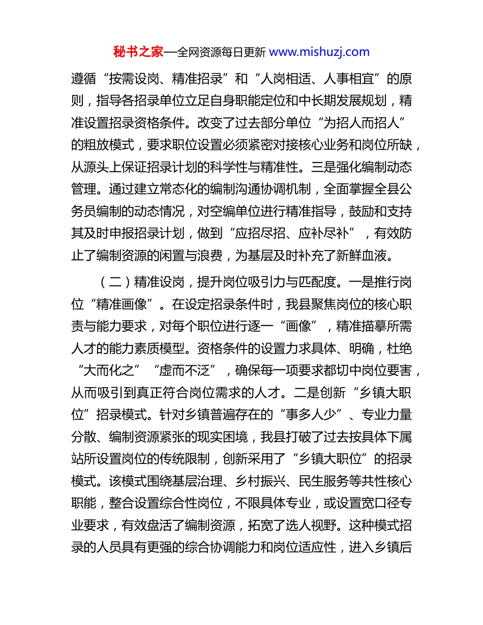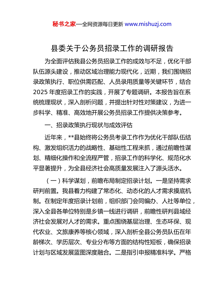 秘书之家—全网资源每日更新 www.mishuzj.com县委关于公务员招录工作的调研报告为全面评估我县公务员招录工作的成效与不足,优化干部队伍源头建设,推动区域治理能力现代化,近期,我们围绕招录政策执行、职位供需匹配、人员录用质量等关键环节,结合2025 年度招录工作的实践,开展了专题调研。本报告旨在系统梳理现状,深入剖析问题,并提出针对性对策建议,为进一步科学、精准、高效地开展公务员招录工作提供决策参考。一、招录政策执行现状与成效评估近年来,**县始终将公务员考录工作作为优化干部队伍结构、激发组织活力的战略性、基础性工程来抓,通过前瞻性谋划、精细化操作和全流程严管,招录工作的科学化、规范化水平显著提升,为全县经济社会高质量发展注入了源头活水。(一)科学谋划,前瞻布局制定招录计划。一是坚持需求研判前置。我县着力构建了常态化、动态化的人才需求摸底机制。在制定年度招录计划前,组织部门会同编办、人社等单位,深入全县各单位特别是乡镇一线进行调研,前瞻性研判县域经济社会发展对人才的需求。重点围绕基层治理、生态环保、现代农业、文旅康养等核心领域,深入剖析全县公务员队伍在年龄梯次、学历层次、专业分布等方面的结构性短板,确保招录计划与区域发展蓝图深度融合。二是指引申报精准科学。严格秘书之家—全网资源每日更新 www.mishuzj.com遵循“按需设岗、精准招录”和“人岗相适、人事相宜”的原则,指导各招录单位立足自身职能定位和中长期发展规划,精准设置招录资格条件。改变了过去部分单位“为招人而招人”的粗放模式,要求职位设置必须紧密对接核心业务和岗位所缺,从源头上保证招录计划的科学性与精准性。三是强化编制动态管理。通过建立常态化的编制沟通协调机制,全面掌握全县公务员编制的动态情况,对空编单位进行精准指导,鼓励和支持其及时申报招录计划,做到“应招尽招、应补尽补”,有效防止了编制资源的闲置与浪费,为基层及时补充了新鲜血液。(二)精准设岗,提升岗位吸引力与匹配度。一是推行岗位“精准画像”。在设定招录条件时,我县聚焦岗位的核心职责与能力要求,对每个职位进行逐一“画像”,精准描摹所需人才的能力素质模型。资格条件的设置力求具体、明确,杜绝“大而化之”“虚而不泛”,确保每一项要求都切中岗位要害,从而吸引到真正符合岗位需求的人才。二是创新“乡镇大职位”招录模式。针对乡镇普遍存在的“事多人少”、专业力量分散、编制资源紧张的现实困境,我县打破了过去按具体下属站所设置岗位的传统限制,创新采用了“乡镇大职位”的招录模式。该模式围绕基层治理、乡村振兴、民生服务等共性核心职能,整合设置综合性岗位,不限具体专业,或设置宽口径专业要求,有效盘活了编制资源,拓宽了选人视野。这种模式招录的人员具有更强的综合协调能力和岗位适应性,进入乡镇后秘书之家—全网资源每日更新 www.mishuzj.com能够更快地融入多岗位工作。三是建立适配度评估反馈机制。为形成招录工作的闭环管理,我县健全了岗位适配度评估纪实机制。通过持续跟踪新录用公务员试用期的表现,结合其年度考核、群众评议和个人述职,综合评估其履职成效与人岗匹配度。评估结果不仅作为个人转正定级的重要依据,更作为关键数据反哺下一年度的招录工作,为优化招录计划和调整岗位设置提供了科学、客观的数据支撑。(三)严格程序,确保招录公平与人员质量。一是严守资格审查关口。在资格审查阶段,我县始终坚持“一把尺子量到底”,严格对标政策规定。审查小组实行“组工骨干+业务专干”的配置模式,并采用“双人交叉审核+组长复核”的工作机制,对报考者的学历、专业、工作经历等关键信息进行逐项核对。对存在疑点的材料,坚持追溯源头,确保报考资格的真实性、合规性,从入口处筑牢“防火墙”。二是深化录用考察维度。在考察环节,我县构建了“政治素质+现实表现+综合风险”的三维考察体系。考察组由经验丰富的科级领导干部带队,深入考察对象所在单位、学校、社区,通过查阅档案、个别谈话、实地走访等多种方式,全面了解其政治立场、道德品行、履职能力和工作实绩。同时,积极运用信息化手段,联动核...
