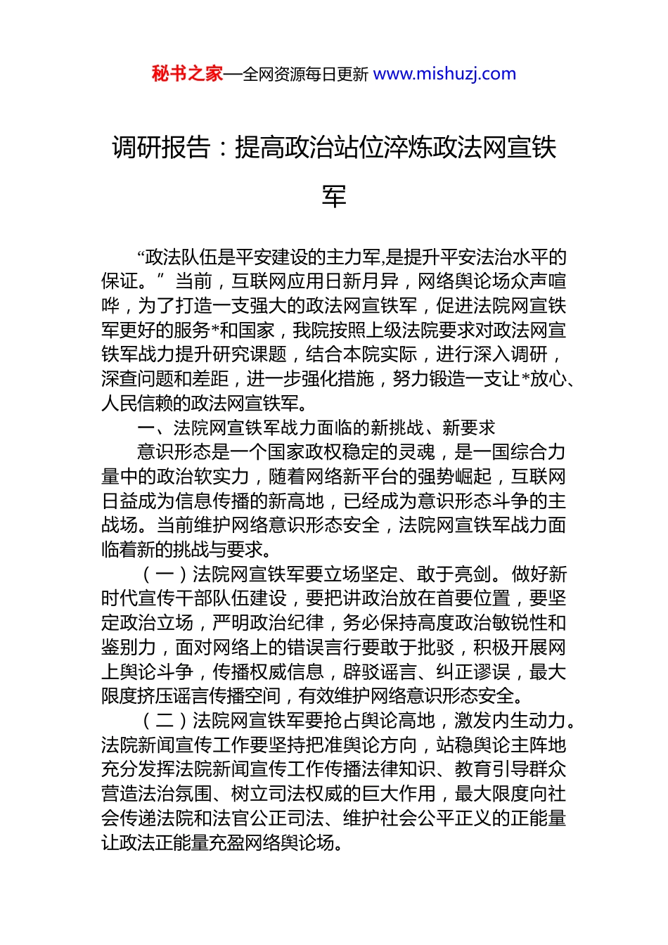 秘书之家—全网资源每日更新 www.mishuzj.com调研报告:提高政治站位淬炼政法网宣铁军“政法队伍是平安建设的主力军,是提升平安法治水平的保证。”当前,互联网应用日新月异,网络舆论场众声喧哗,为了打造一支强大的政法网宣铁军,促进法院网宣铁军更好的服务*和国家,我院按照上级法院要求对政法网宣铁军战力提升研究课题,结合本院实际,进行深入调研,深查问题和差距,进一步强化措施,努力锻造一支让*放心、人民信赖的政法网宣铁军。一、法院网宣铁军战力面临的新挑战、新要求意识形态是一个国家政权稳定的灵魂,是一国综合力量中的政治软实力,随着网络新平台的强势崛起,互联网日益成为信息传播的新高地,已经成为意识形态斗争的主战场。当前维护网络意识形态安全,法院网宣铁军战力面临着新的挑战与要求。(一)法院网宣铁军要立场坚定、敢于亮剑。做好新时代宣传干部队伍建设,要把讲政治放在首要位置,要坚定政治立场,严明政治纪律,务必保持高度政治敏锐性和鉴别力,面对网络上的错误言行要敢于批驳,积极开展网上舆论斗争,传播权威信息,辟驳谣言、纠正谬误,最大限度挤压谣言传播空间,有效维护网络意识形态安全。(二)法院网宣铁军要抢占舆论高地,激发内生动力。法院新闻宣传工作要坚持把准舆论方向,站稳舆论主阵地充分发挥法院新闻宣传工作传播法律知识、教育引导群众营造法治氛围、树立司法权威的巨大作用,最大限度向社会传递法院和法官公正司法、维护社会公平正义的正能量让政法正能量充盈网络舆论场。秘书之家—全网资源每日更新 www.mishuzj.com(三)法院网宣铁军要讲好中国故事,宣传主流价值。法院新闻宣传工作是联系人民群众、向社会传递法院信息的重要载体和基本平台。要学会用群众的语言讲故事,把身边的英模故事、凡人善事通过网络向社会传播,让群众有代入感,增强传播渗透力和公信力。二、惠民法院网宣铁军的基本情况(一)网宣人员队伍薄弱。长期以来网宣人员队伍不稳定,网宣后备力量不足。惠民法院共有网宣人员 6 人,业务庭室 3 人,综合部门人员 3 人,且均为年轻干警,缺乏具有丰富办案经验的审判执行法官。(二)网宣工作重视程度低。网宣工作缺乏自主性和计划性,多数工作都是与宣传案件本身有关,缺乏细致的洞察力,缺乏深挖典型案例背后故事的能力,网络舆情引导成效不明显,在网上引起跟帖和话题的内容很少。三、法院网宣铁军全面提升的对策建议(一)始终把政治建设放在首位。加强过硬队伍建设,首先要把政治建设摆在首位,法院新闻宣传要做到坚持*性和人民性相统一,把好政治方向,强化政治引领,思想上重视宣传工作,将宣传工作和审判业务工作放在同等重要的位置,努力把舆论引导范围从政法工作延伸到社会热点焦点难点,占领法治意识形态领域阵地,坚持正确的政治方向、舆论导向和价值取向。(二)大力推进网宣人才本领建设。建好用好政法网宣铁军要注重本领建设,定期开展集中培训,组织网络实训,打造一批采写有广度、有深度、有温度的政法综治新闻精品的网宣铁军,提高法治评论宣传的专业性、引领性全面增强网宣队伍的脚力、眼力、脑力与笔力,用过硬的本领讲好法治故事,宣传主流价值。(三)多元取材,扩大舆论宣传效果。创新政法网宣铁军的宣传模式,在常规的官方账号权威发布、递进式转发评论等渠道外,利用新媒体,如抖音,快手 app 等,将身秘书之家—全网资源每日更新 www.mishuzj.com边的执法办案、凡事善举等通过短视频的方式记录下来,最大限度扩大受众群体范围,扩大舆论宣传效果。