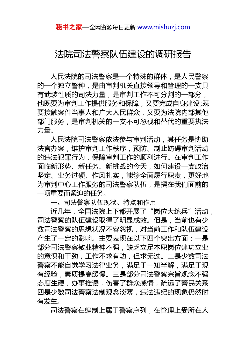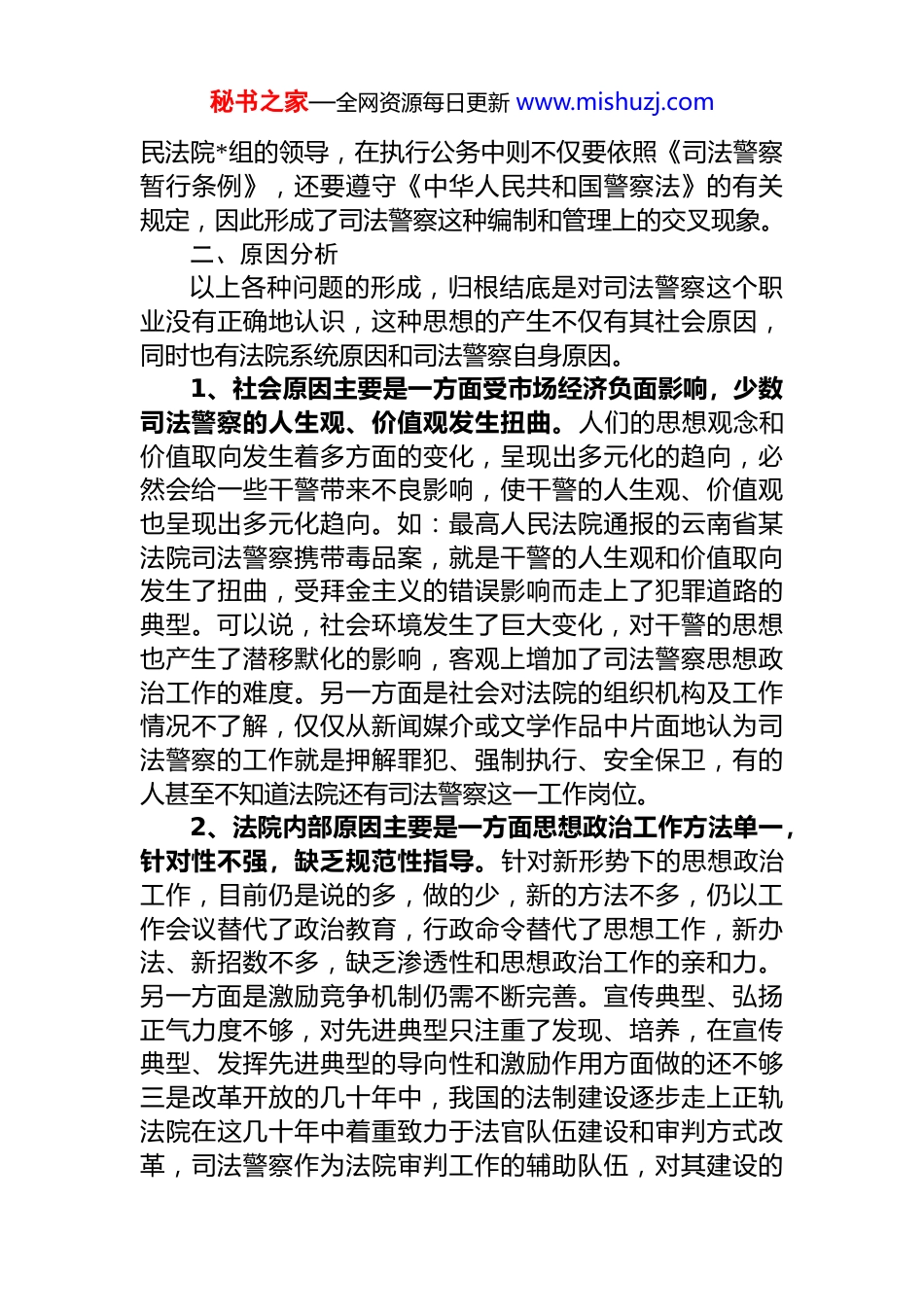 秘书之家—全网资源每日更新 www.mishuzj.com法院司法警察队伍建设的调研报告人民法院的司法警察是一个特殊的群体,是人民警察的一个独立警种,是由审判机关直接领导和管理的一支具有武装性质的司法力量,是审判工作不可分割的一部分,他既要为审判工作提供服务和保障,又要完成自身建设;既要接触案件当事人和广大人民群众,又要为法院内部其他部门服务,是审判机关的一支不可忽视和替代的重要执法力量。人民法院司法警察依法参与审判活动,其任务是协助法官办案,维护审判工作秩序,预防、制止妨碍审判活动的违法犯罪行为,保障审判工作的顺利进行。在审判工作面临新形势、新任务、新挑战的今天,如何建设一支政治坚定、业务过硬、作风扎实,能够全面履行职责,更好地为审判中心工作服务的司法警察队伍,是摆在我们面前的一项重要而紧迫的任务。一、司法警察队伍现状、特点和作用近几年,全国法院上下都开展了“岗位大练兵”活动,司法警察的队伍建设取得了明显成效。但是,当前也有少数司法警察的思想状况不容忽视,对当前工作和队伍建设产生了一定的影响。主要表现在以下四个突出方面:一是部分司法警察敬业精神不强,缺乏立足本职岗位建功立业的意识和干劲,工作不求有功,但求无过。二是少数司法警察不能自觉学习法律业务,满足于一知半解,满足于现有经验,素质提高缓慢。三是部分司法警察宗旨观念不强态度生硬,办事推诿,伤害了群众感情,疏远了警民关系四是少数司法警察法制观念淡薄,违法违纪的现象仍然时有发生。司法警察在编制上属于警察序列,在管理上受所在人秘书之家—全网资源每日更新 www.mishuzj.com民法院*组的领导,在执行公务中则不仅要依照《司法警察暂行条例》,还要遵守《中华人民共和国警察法》的有关规定,因此形成了司法警察这种编制和管理上的交叉现象。二、原因分析以上各种问题的形成,归根结底是对司法警察这个职业没有正确地认识,这种思想的产生不仅有其社会原因,同时也有法院系统原因和司法警察自身原因。1、社会原因主要是一方面受市场经济负面影响,少数司法警察的人生观、价值观发生扭曲。人们的思想观念和价值取向发生着多方面的变化,呈现出多元化的趋向,必然会给一些干警带来不良影响,使干警的人生观、价值观也呈现出多元化趋向。如:最高人民法院通报的云南省某法院司法警察携带毒品案,就是干警的人生观和价值取向发生了扭曲,受拜金主义的错误影响而走上了犯罪道路的典型。可以说,社会环境发生了巨大变化,对干警的思想也产生了潜移默化的影响,客观上增加了司法警察思想政治工作的难度。另一方面是社会对法院的组织机构及工作情况不了解,仅仅从新闻媒介或文学作品中片面地认为司法警察的工作就是押解罪犯、强制执行、安全保卫,有的人甚至不知道法院还有司法警察这一工作岗位。2、法院内部原因主要是一方面思想政治工作方法单一,针对性不强,缺乏规范性指导。针对新形势下的思想政治工作,目前仍是说的多,做的少,新的方法不多,仍以工作会议替代了政治教育,行政命令替代了思想工作,新办法、新招数不多,缺乏渗透性和思想政治工作的亲和力。另一方面是激励竞争机制仍需不断完善。宣传典型、弘扬正气力度不够,对先进典型只注重了发现、培养,在宣传典型、发挥先进典型的导向性和激励作用方面做的还不够三是改革开放的几十年中,我国的法制建设逐步走上正轨法院在这几十年中着重致力于法官队伍建设和审判方式改革,司法警察作为法院审判工作的辅助队伍,对其建设的秘书之家—全网资源每日更新 www.mishuzj.com重视程度不够,其人员配备也大多是部队上退伍转业的或向社会招聘的法律知识较匮乏的人员,因此形成法警文化素质和法律知识水平较低的客观情况,伴随而至的是执法不力、执法效果较差的结果,甚至出现违法执法的现象,严重损害人民法院的形象。3、司法警察自身原因。主要是目前在法警队伍中存在几种不能对司法警察正确定位的现象:有的认为,司法警察在审判工作中起辅助性作用,和法官相比地位较低,没有发展前途,工作标准放低,得过且过的混日子。如:最高人民法院通报的河南省某法院袭击法官事件、青海某法院当事...