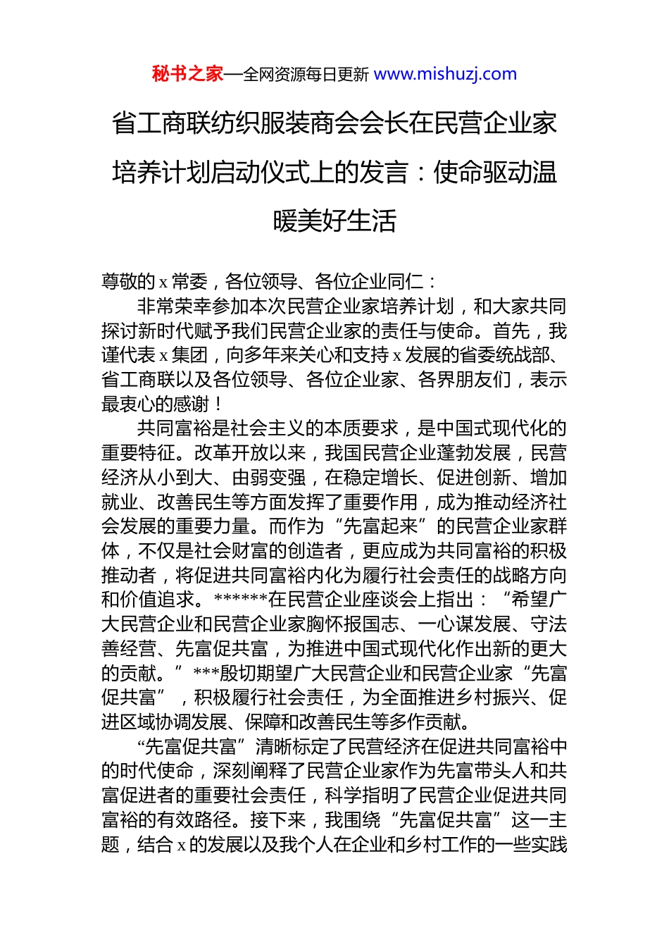秘书之家—全网资源每日更新 www.mishuzj.com省工商联纺织服装商会会长在民营企业家培养计划启动仪式上的发言:使命驱动温暖美好生活尊敬的 x 常委,各位领导、各位企业同仁:非常荣幸参加本次民营企业家培养计划,和大家共同探讨新时代赋予我们民营企业家的责任与使命。首先,我谨代表 x 集团,向多年来关心和支持 x 发展的省委统战部、省工商联以及各位领导、各位企业家、各界朋友们,表示最衷心的感谢!共同富裕是社会主义的本质要求,是中国式现代化的重要特征。改革开放以来,我国民营企业蓬勃发展,民营经济从小到大、由弱变强,在稳定增长、促进创新、增加就业、改善民生等方面发挥了重要作用,成为推动经济社会发展的重要力量。而作为“先富起来”的民营企业家群体,不仅是社会财富的创造者,更应成为共同富裕的积极推动者,将促进共同富裕内化为履行社会责任的战略方向和价值追求。******在民营企业座谈会上指出:“希望广大民营企业和民营企业家胸怀报国志、一心谋发展、守法善经营、先富促共富,为推进中国式现代化作出新的更大的贡献。”***殷切期望广大民营企业和民营企业家“先富促共富”,积极履行社会责任,为全面推进乡村振兴、促进区域协调发展、保障和改善民生等多作贡献。“先富促共富”清晰标定了民营经济在促进共同富裕中的时代使命,深刻阐释了民营企业家作为先富带头人和共富促进者的重要社会责任,科学指明了民营企业促进共同富裕的有效路径。接下来,我围绕“先富促共富”这一主题,结合 x 的发展以及我个人在企业和乡村工作的一些实践秘书之家—全网资源每日更新 www.mishuzj.com与思考,向大家作简要汇报:一、坚持以人为本,构建和谐劳动关系x 在近半个世纪的创业发展中,始终坚持“以人为本”的理念,把成就员工、提升员工的获得感、幸福感与安全感作为企业发展的重要目标,构建了系统化、制度化、人性化的员工关怀与发展体系。一是健全权益保障与公平雇佣机制。在 x 发展的每一个阶段,我们始终把和企业和员工的共同成就,作为企业发展的立身之本。我们在 80 年代企业稍微有点成绩的时候,就给全厂 80 位员工每人配备一辆金狮牌自行车,解决大家上下班交通难题。2007 年公司在香港上市以来,公司推动股权和期权激励,已经授予员工七期股权和期权激励。同时,我们建立全面合规的用工体系以及科学完善的职位职级体系与薪酬结构,为员工提供具有行业竞争力和职业竞争力的薪酬待遇以及贴心的福利体系,优化企业和员工共创、共享、共赢的发展机制,真正“让想做事者有机会、让能做事者有舞台、让做成事者有收获”。二是构建系统化培训与发展体系。我们致力于为员工提供持续学习与发展的机会,以“融合、融通、传承、创新”为核心理念,构建多元化培训体系,打造“管理+专业”双通道晋升路径,开展“鹰系”人才培养项目,培养适应市场与行业变化的高素质人才。三是着力营造健康和谐的工作氛围。我们制定职业健康与安全方针,建立健全管理体系,确保员工在安全、健康的环境中工作;我们打造多渠道沟通平台,聆听员工心声,定期举办生日会、家庭日等活动来完善员工服务体系我们持续改善员工工作生活环境,拿出“真金白银”、想出“真招实招”为员工谋福利,通过“乐居工程”租房补贴、员工爱心基金等,增强员工归属感与凝聚力。我们获得“全国就业先进企业”“x 省第四批产教融合型试点企业”“中国大学生喜爱雇主”“智联招聘年度最佳雇主”秘书之家—全网资源每日更新 www.mishuzj.com等荣誉。二、助力乡村振兴,践行责任担当x 的创业起点是在常熟的 x 村。在 80 年代企业发展初期,我父亲就开始每年给村里的老人发放养老金,至今从未间断。从 90 年代以来,我们累计出资 1.3 亿元,持续助力 x 村建设。x 与 x 村的结对共建,变“输血”为“造血”,通过村企共谋发展思路、共兴农村经济、共推村庄建设,实现以企带村、以村促企、村企共赢、共同发展,打造了实业赋能乡村振兴的标杆。现在,我个人除了在企业任职还担任着常熟市古里镇 x 村的*委书记、村委会主任。这个双重身份,让我对“先富促共富”,有了更切身的...