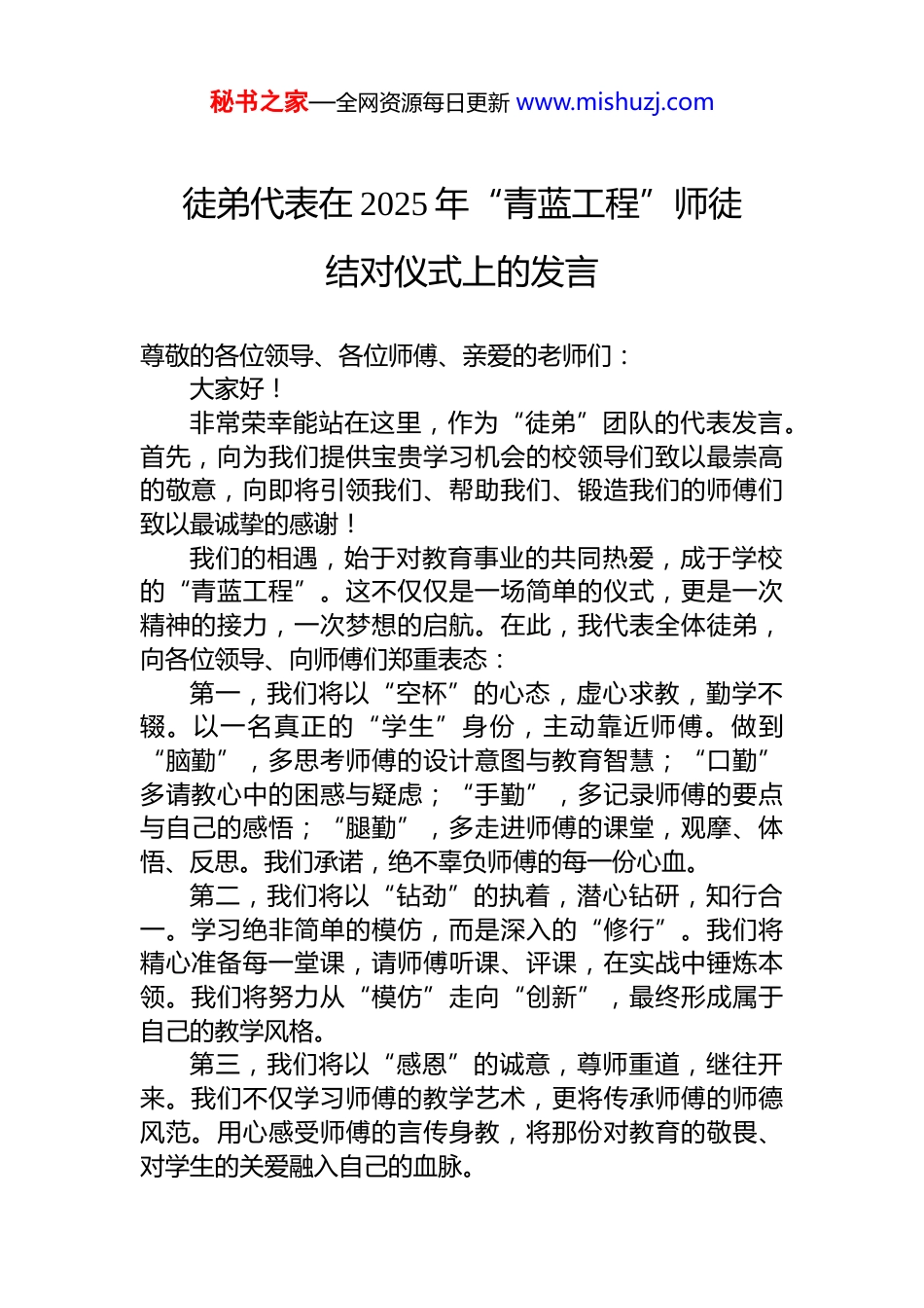 秘书之家—全网资源每日更新 www.mishuzj.com徒弟代表在 2025 年“青蓝工程”师徒结对仪式上的发言尊敬的各位领导、各位师傅、亲爱的老师们:大家好!非常荣幸能站在这里,作为“徒弟”团队的代表发言。首先,向为我们提供宝贵学习机会的校领导们致以最崇高的敬意,向即将引领我们、帮助我们、锻造我们的师傅们致以最诚挚的感谢!我们的相遇,始于对教育事业的共同热爱,成于学校的“青蓝工程”。这不仅仅是一场简单的仪式,更是一次精神的接力,一次梦想的启航。在此,我代表全体徒弟,向各位领导、向师傅们郑重表态:第一,我们将以“空杯”的心态,虚心求教,勤学不辍。以一名真正的“学生”身份,主动靠近师傅。做到“脑勤”,多思考师傅的设计意图与教育智慧;“口勤”多请教心中的困惑与疑虑;“手勤”,多记录师傅的要点与自己的感悟;“腿勤”,多走进师傅的课堂,观摩、体悟、反思。我们承诺,绝不辜负师傅的每一份心血。第二,我们将以“钻劲”的执着,潜心钻研,知行合一。学习绝非简单的模仿,而是深入的“修行”。我们将精心准备每一堂课,请师傅听课、评课,在实战中锤炼本领。我们将努力从“模仿”走向“创新”,最终形成属于自己的教学风格。第三,我们将以“感恩”的诚意,尊师重道,继往开来。我们不仅学习师傅的教学艺术,更将传承师傅的师德风范。用心感受师傅的言传身教,将那份对教育的敬畏、对学生的关爱融入自己的血脉。秘书之家—全网资源每日更新 www.mishuzj.com青蓝共辉,未来可期:我们誓做教育薪火的“传递者”。我们承诺,今日,您以心血浇灌我们成长;明日,我们必将以累累硕果回报师恩,成为学校的骄傲,成为能让师傅们放心、安心、展颜的“得意门生”。“长风破浪会有时,直挂云帆济沧海。”各位亲爱的老师,征程已然开启,号角已经吹响。让我们铭记这份知遇之恩,怀抱这份传道之情,携手并进,在师傅们的引领下以青春之我、奋斗之我,为学校的教育事业添砖加瓦。最后,再次衷心感谢各位领导、各位师傅!祝愿我们的学校蒸蒸日上,桃李满天下!谢谢大家!