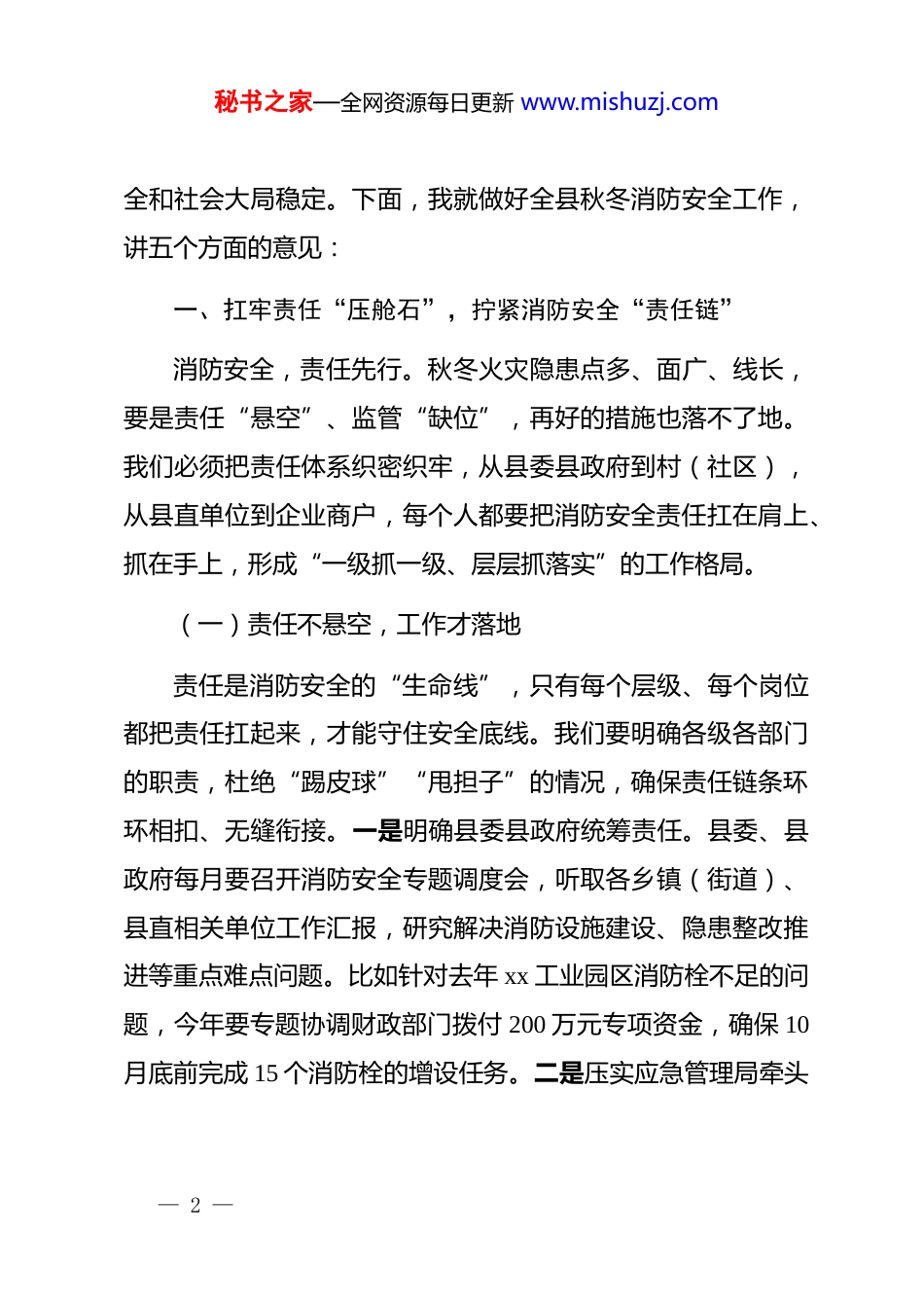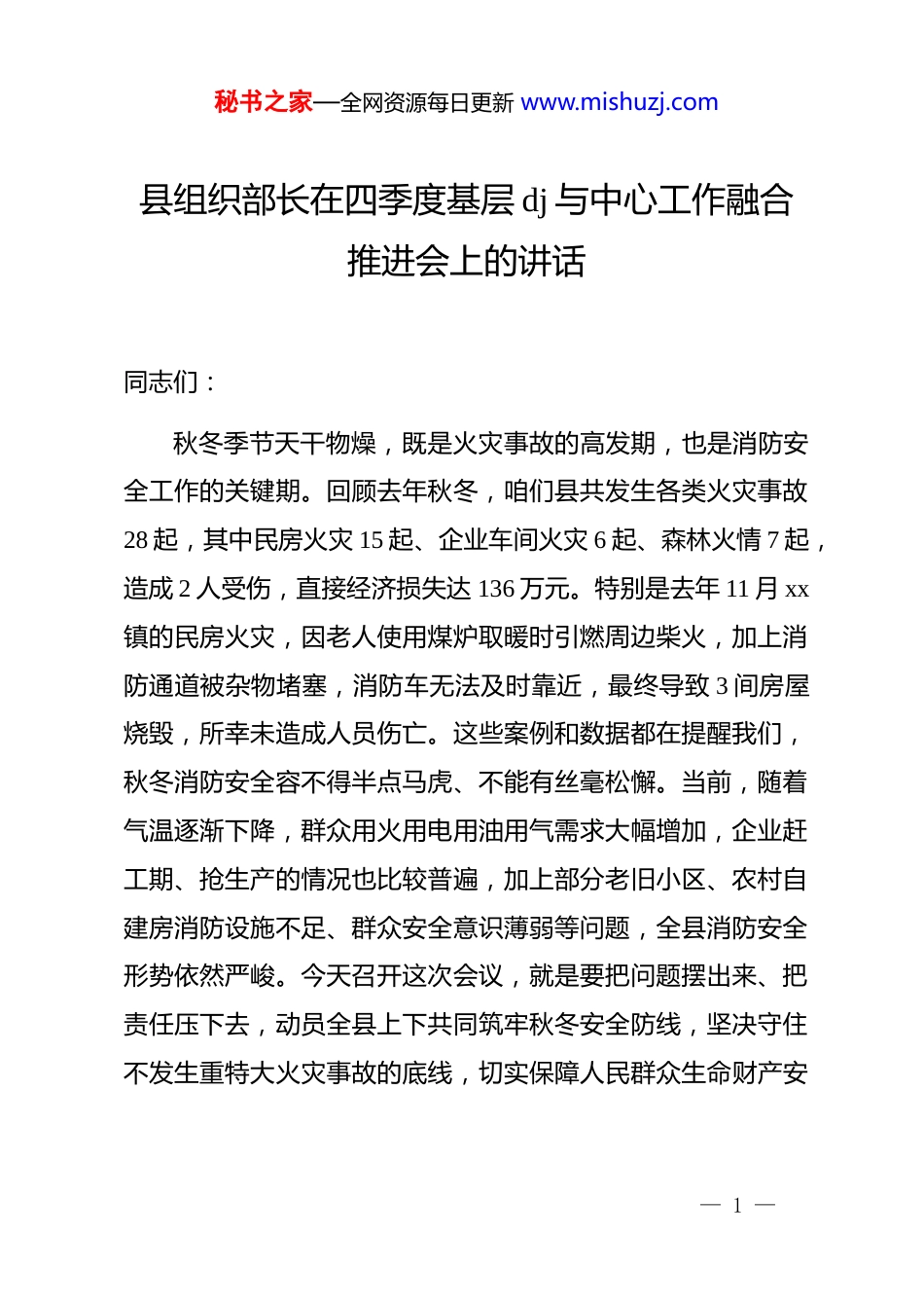 秘书之家—全网资源每日更新 www.mishuzj.com县组织部长在四季度基层 dj 与中心工作融合推进会上的讲话同志们:秋冬季节天干物燥,既是火灾事故的高发期,也是消防安全工作的关键期。回顾去年秋冬,咱们县共发生各类火灾事故28 起,其中民房火灾 15 起、企业车间火灾 6 起、森林火情 7 起,造成 2 人受伤,直接经济损失达 136 万元。特别是去年 11 月 xx镇的民房火灾,因老人使用煤炉取暖时引燃周边柴火,加上消防通道被杂物堵塞,消防车无法及时靠近,最终导致 3 间房屋烧毁,所幸未造成人员伤亡。这些案例和数据都在提醒我们,秋冬消防安全容不得半点马虎、不能有丝毫松懈。当前,随着气温逐渐下降,群众用火用电用油用气需求大幅增加,企业赶工期、抢生产的情况也比较普遍,加上部分老旧小区、农村自建房消防设施不足、群众安全意识薄弱等问题,全县消防安全形势依然严峻。今天召开这次会议,就是要把问题摆出来、把责任压下去,动员全县上下共同筑牢秋冬安全防线,坚决守住不发生重特大火灾事故的底线,切实保障人民群众生命财产安— 1 —秘书之家—全网资源每日更新 www.mishuzj.com全和社会大局稳定。下面,我就做好全县秋冬消防安全工作,讲五个方面的意见:一、扛牢责任“压舱石”,拧紧消防安全“责任链”消防安全,责任先行。秋冬火灾隐患点多、面广、线长,要是责任“悬空”、监管“缺位”,再好的措施也落不了地。我们必须把责任体系织密织牢,从县委县政府到村(社区),从县直单位到企业商户,每个人都要把消防安全责任扛在肩上、抓在手上,形成“一级抓一级、层层抓落实”的工作格局。(一)责任不悬空,工作才落地责任是消防安全的“生命线”,只有每个层级、每个岗位都把责任扛起来,才能守住安全底线。我们要明确各级各部门的职责,杜绝“踢皮球”“甩担子”的情况,确保责任链条环环相扣、无缝衔接。一是明确县委县政府统筹责任。县委、县政府每月要召开消防安全专题调度会,听取各乡镇(街道)、县直相关单位工作汇报,研究解决消防设施建设、隐患整改推进等重点难点问题。比如针对去年 xx 工业园区消防栓不足的问题,今年要专题协调财政部门拨付 200 万元专项资金,确保 10月底前完成 15 个消防栓的增设任务。二是压实应急管理局牵头— 2 —秘书之家—全网资源每日更新 www.mishuzj.com责任。县应急管理局要发挥“牵头抓总”作用,每周组织开展消防安全督查,协调解决跨部门、跨区域的消防安全问题;每月联合消防救援大队开展 1 次重点领域专项检查,建立问题台账,跟踪督促整改,确保隐患整改率达到 100%。三是落实县直单位监管责任。各县直单位要按照“管行业必须管安全、管业务必须管安全、管生产经营必须管安全”的要求,抓好本行业、本领域的消防安全工作。比如住建局要重点监管新建项目消防验收、老旧小区消防改造,今年要完成 12 个老旧小区的消防设施更新;市场监管局要严查特种设备消防安全,特别是加油站、液化气站的压力容器安全,每月至少开展 2 次专项检查;教育局要抓好校园消防安全,督促全县中小学、幼儿园每月开展 1 次消防演练。四是强化乡镇(街道)属地责任。各乡镇(街道)要实行“分片包干”制度,每个班子成员包联 3-5 个村(社区),每个干部包联 50-100 户群众,定期上门排查隐患、宣传知识,确保辖区内所有村(社区)、企业、商户都有人管、有人盯。(二)层级无断点,监管才闭环消防安全监管不能有“盲区”,更不能有“断点”。从县城到农村,从企业到家庭,每个环节都要有人监管、每个部位— 3 —秘书之家—全网资源每日更新 www.mishuzj.com都要有人负责,确保监管链条全覆盖、无死角。一是建立“县-乡-村-户”四级监管体系。县里成立消防安全工作领导小组,乡镇(街道)设立消防安全办公室,村(社区)配备专职网格员,农户确定 1 名消防安全责任人,形成“一级管一级、层层有监管”的体系。比如 xx 乡已经率先推行“网格员+农户”结对制度,每个网格员负责 200 户农户,每周至少上门排查 1 次,效果很好,值得全县推广。二是实行“行业+属地”双重监管机制。各行业...