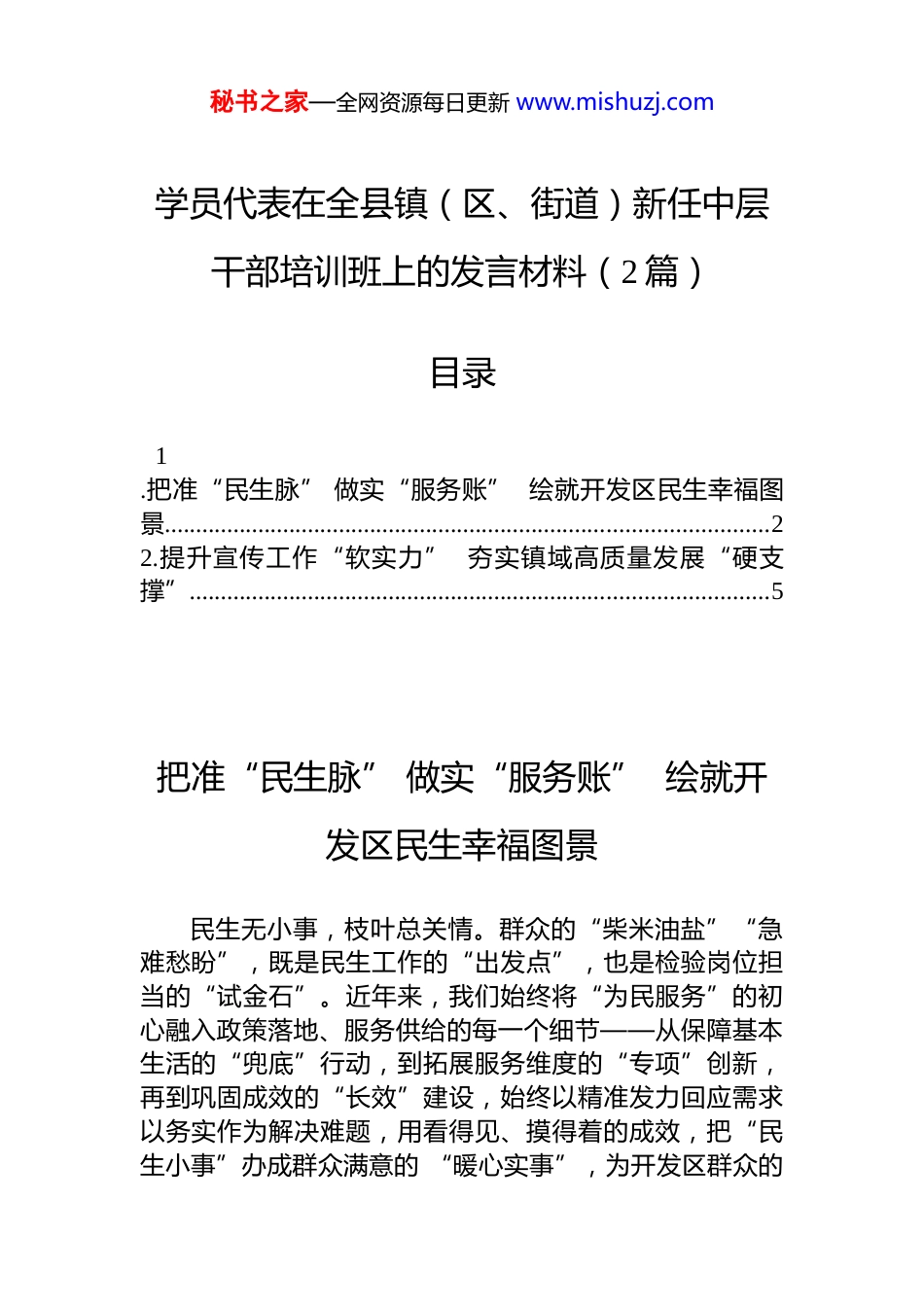 秘书之家—全网资源每日更新 www.mishuzj.com学员代表在全县镇(区、街道)新任中层干部培训班上的发言材料(2 篇)目录1.把准“民生脉” 做实“服务账” 绘就开发区民生幸福图景.................................................................................................22.提升宣传工作“软实力” 夯实镇域高质量发展“硬支撑”.............................................................................................5把准“民生脉” 做实“服务账” 绘就开发区民生幸福图景民生无小事,枝叶总关情。群众的“柴米油盐”“急难愁盼”,既是民生工作的“出发点”,也是检验岗位担当的“试金石”。近年来,我们始终将“为民服务”的初心融入政策落地、服务供给的每一个细节——从保障基本生活的“兜底”行动,到拓展服务维度的“专项”创新,再到巩固成效的“长效”建设,始终以精准发力回应需求以务实作为解决难题,用看得见、摸得着的成效,把“民生小事”办成群众满意的 “暖心实事”,为开发区群众的秘书之家—全网资源每日更新 www.mishuzj.com幸福生活筑牢根基。筑牢民生兜底“安全网”:以精准施策践行为民初心。我们将“保障基本民生”作为首要任务,以“精准化、全覆盖”为目标,把政策红利精准送达每一位需要帮助的群众,用“真金白银”和“贴心服务”筑牢民生底线。在社会保障领域,坚持“应保尽保、动态调整”原则,确保民生资金足额发放、精准到人,同时根据实际情况动态优化保障名单,既避免政策“漏享”,又杜绝资源“浪费”。及时足额发放优抚对象抚恤补助、非农义务兵家庭优待金大学生入伍奖励金等,让优抚对象、军属感受到政策温度针对残疾人等特殊群体的实际需求,精准对接帮扶资源,从生活照料、心理疏导到技能培训,全方位为特殊关爱照护人群排忧解难,让关爱服务更具针对性、更有实效性。而在养老服务领域,我们推动“长者驿家”顺利运营,通过“政府主导+社会参与”的运营模式,为老年人提供助餐、健康监测、文娱活动等一站式服务,有效破解老年人“吃饭难、照料难”问题,让养老服务更有“烟火气”。打造专项服务“新品牌”:以主动作为彰显担当本色。如果说民生兜底是“基础题”,那么创新开展专项服务就是“加分题”。我们跳出“被动执行”的思维,主动谋划特色活动、搭建服务平台,以“品牌化、多样化”的专项服务,拓展为民服务的广度与深度,彰显“勇争先”的担当。坚持让政策“活起来”。开展社会救助宣传月活动,用群众听得懂的语言、易接受的形式,把低保、特困等救助政策讲清楚、说明白,让需要帮助的群众“知政策、会申请”;组织“先锋引领 绿色祭扫 共筑新风”清明节文明祭扫活动,通过文化宣讲、文明宣传等方式,实现“服务+宣传”的双重效果。坚持让服务“实起来”。认真组织开展线上培训,积极动员报名社工考试,持续为基层社工队伍注入“新鲜血液”。聚焦“应急救护能力提升”,常态化开展公益性应急救护培训考试,联合区安监局,分批组秘书之家—全网资源每日更新 www.mishuzj.com织园区工贸企业负责人、安全管理员 xxx 余人参加普及性应急救护培训,不断为群众生命安全保驾护航。夯实长远发展“硬基础”:以规范长效砥砺奋进姿态。民生工作既要“当下改”,更要“长久立”。我们深知,只有建立规范的工作机制、夯实长远发展的基础,才能让为民服务的成效持续巩固、不断提升,这既是“作贡献”的延伸,更是“砥砺前行” 的底气。我们坚持制度化、精细化原则,认真梳理残疾人证管理系统的相关信息,严格落实残疾人证动态管理,规范从受理、回访到发放的每一个环节,确保数据准确无误,为后续精准服务提供有效支撑。始终将维护残疾人合法权益放在重要位置,常态化组织开展普法宣传、书香读书活动,提升残疾人法律意识。进一步畅通完善诉求表达渠道,最大程度化解矛盾纠纷,努力为残疾人工作生活营造平安、和谐的稳定环境,确保了无越级上访信访。建立“民善康”项目长效工作机制,及时汇总、送批报销事宜,确保资金每月按时足额发放到位,避免群众“多跑腿、等太久”。未来,我们将继续锚定民生需求“...