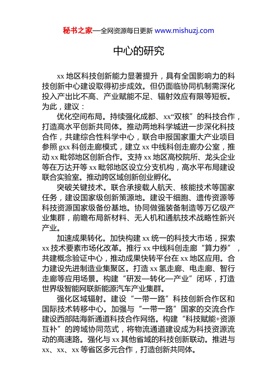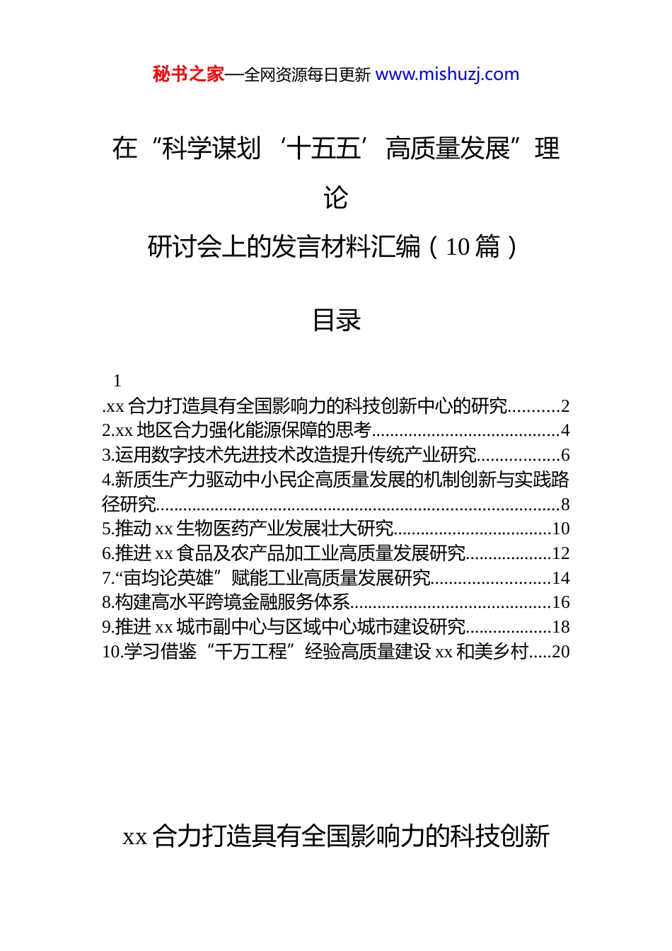 秘书之家—全网资源每日更新 www.mishuzj.com在“科学谋划‘十五五’高质量发展”理论研讨会上的发言材料汇编(10 篇)目录1.xx 合力打造具有全国影响力的科技创新中心的研究...........22.xx 地区合力强化能源保障的思考.........................................43.运用数字技术先进技术改造提升传统产业研究..................64.新质生产力驱动中小民企高质量发展的机制创新与实践路径研究.........................................................................................85.推动 xx 生物医药产业发展壮大研究...................................106.推进 xx 食品及农产品加工业高质量发展研究...................127.“亩均论英雄”赋能工业高质量发展研究..........................148.构建高水平跨境金融服务体系............................................169.推进 xx 城市副中心与区域中心城市建设研究...................1810.学习借鉴“千万工程”经验高质量建设 xx 和美乡村.....20xx 合力打造具有全国影响力的科技创新秘书之家—全网资源每日更新 www.mishuzj.com中心的研究xx 地区科技创新能力显著提升,具有全国影响力的科技创新中心建设取得初步成效。但仍面临协同机制需深化投入产出比不高、产业赋能不足、辐射效应有限等短板。为此,建议:优化空间布局。持续强化成都、xx“双核”的科技合作,打造高水平创新共同体。推动两地科学城进一步深化科技合作,共建综合性科学中心,联合申报国家重大产业项目参照 gxx 科创走廊模式,建立 xx 中线科创走廊办公室,推动 xx 毗邻地区创新合作。支持 xx 地区高校院所、龙头企业等在万达开等 xx 毗邻地区设立分支机构,高水平布局建设联合实验室。推动跨区域创新创业孵化。突破关键技术。联合承接载人航天、核能技术等国家任务,建设国家级创新策源地。建设干细胞、遗传资源等科技资源国家级备份基地。协同做强装备制造等万亿级产业集群,前瞻布局新材料、无人机和通航技术战略性新兴产业。加速成果转化。加快构建 xx 统一的科技大市场,探索xx 技术要素市场化改革。推行 xx 中线科创走廊“算力券”,共建概念验证中心,推动成果快转平台在 xx 地区应用。合力建设先进制造业集聚区。打造 xx 氢走廊、电走廊、智行走廊等应用场景。构建“研发—转化—产业”闭环,打造世界级智能网联新能源汽车产业集群。强化区域辐射。建设“一带一路”科技创新合作区和国际技术转移中心。加强与“一带一路”国家的交流合作建设西部陆海新通道科技合作网络。构建“科技赋能+资源互补”的跨域协同范式,将物流通道建设成为科技资源流动的高速路。强化与 xx 其他省域的科技创新联动。推进与xx、xx、xx 等省区多元合作,打造创新共同体。秘书之家—全网资源每日更新 www.mishuzj.comxx 地区合力强化能源保障的思考近年来,xx 地区逐步成为天然气页岩气重要产储运枢纽,x 气东送、西电东送汇集外输区,同时 xx 也是我国西部的制造业重镇,还要为产业的不断发展提供能源保障。但 xx 地区在合力强化能源保障方面仍存在政策规划待支持、统筹协调待加强、设施建设待提升、链条建设待畅通等问题。为此,建议:聚焦节点定位支持,争取国家政策和项目支持。一是明确具体功能定位。争取纳入国家“十五五”能源发展规划,明确其作为国家能源安全保障重要节点的功能定位。二是争取先行先试。三是争取设立国家机构和平台。聚焦区域协作共建,推动强化统筹协调。一是强化区域协同政策。推动 xx 地区能源规划一体化,建立跨区域能源协同机制,推动区域能源市场互联,签订能源互助协议实现能源资源优化配置。二是推动能源与产业深度耦合。争取建设国家级新能源装备制造基地,打造 xx 综合能源智慧走廊,加强两地在能源领域的合作。三是完善政策支持与保障机制。聚焦基础设施建设,谋划布局相关通道工程。一是进一步整合多式联运能源网络。整合长江黄金水道、中欧班列、天然气管网等物流通道,提高西气东输与 x 气出 x 管线之间的输送能力。二是完善地区能源输送通道。争取开展 x电和...