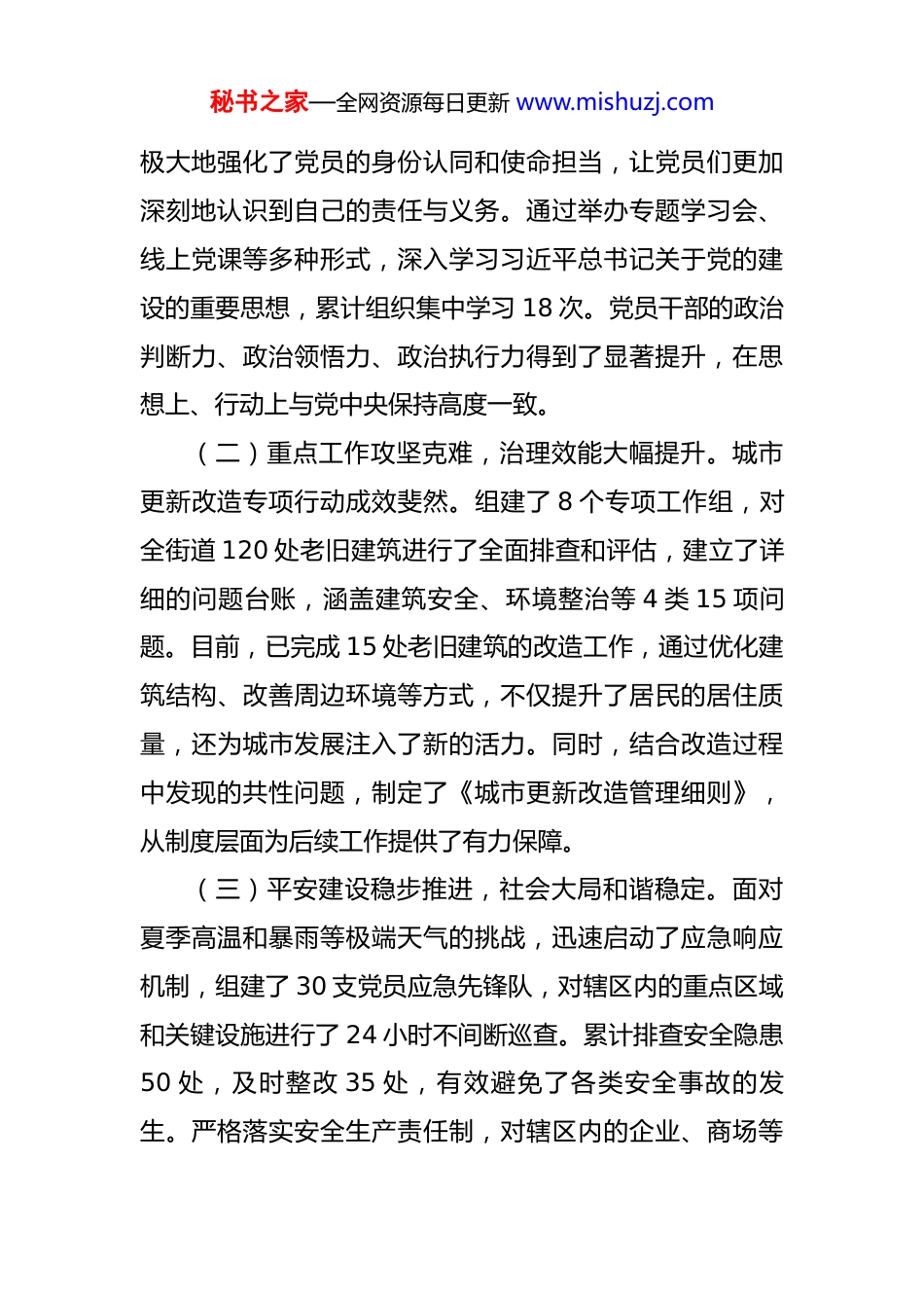 秘书之家—全网资源每日更新 www.mishuzj.com在 2025 年党支部书记座谈会上的讲话 同志们:今天这场座谈会意义非凡,既是对七月工作的全面复盘与总结,也是对三季度攻坚战役的有力誓师与动员。如今七月已悄然接近尾声,正值全年时间过半的关键节点,这是我们检验工作成效、校准前进方向的重要时刻。三季度作为承上启下的“黄金时段”,不仅是上半年工作的延续与深化,更是为全年目标冲刺奠定坚实基础的决战时期。刚才,各位支部书记的发言既有对实践的深刻总结,又有对问题的精准剖析;分管领导的点评部署精准务实、切中要害,充分展现了大家对工作的深入思考和强烈的责任担当。下面,我结合街道整体工作,谈三点意见。一、总结二季度成果增信心,直面短板明方向七月以来,全街道在区委、区政府的坚强领导和统筹引领下,紧紧锚定目标,真抓实干、奋勇前行,各项工作呈现出稳中有进、亮点频现的良好态势。(一)党建引领纵深推进,组织根基愈发坚实。各党支部以“七一”建党纪念这一重要契机为依托,积极创新开展了“红色故事进社区”“党员先锋在行动”等主题党日活动 25 场,吸引了 900 余名党员踊跃参与。这些活动秘书之家—全网资源每日更新 www.mishuzj.com极大地强化了党员的身份认同和使命担当,让党员们更加深刻地认识到自己的责任与义务。通过举办专题学习会、线上党课等多种形式,深入学习习近平总书记关于党的建设的重要思想,累计组织集中学习 18 次。党员干部的政治判断力、政治领悟力、政治执行力得到了显著提升,在思想上、行动上与党中央保持高度一致。(二)重点工作攻坚克难,治理效能大幅提升。城市更新改造专项行动成效斐然。组建了 8 个专项工作组,对全街道 120 处老旧建筑进行了全面排查和评估,建立了详细的问题台账,涵盖建筑安全、环境整治等 4 类 15 项问题。目前,已完成 15 处老旧建筑的改造工作,通过优化建筑结构、改善周边环境等方式,不仅提升了居民的居住质量,还为城市发展注入了新的活力。同时,结合改造过程中发现的共性问题,制定了《城市更新改造管理细则》,从制度层面为后续工作提供了有力保障。(三)平安建设稳步推进,社会大局和谐稳定。面对夏季高温和暴雨等极端天气的挑战,迅速启动了应急响应机制,组建了 30 支党员应急先锋队,对辖区内的重点区域和关键设施进行了 24 小时不间断巡查。累计排查安全隐患50 处,及时整改 35 处,有效避免了各类安全事故的发生。严格落实安全生产责任制,对辖区内的企业、商场等秘书之家—全网资源每日更新 www.mishuzj.com场所进行了全面的安全检查,累计出动检查人员 400 人次,排查整改安全隐患 20 余处。深化“平安社区”创建活动,加强社会治安综合治理,新增监控摄像头 50 个,进一步提升了社区的治安防控能力。(四)民生服务优化升级,群众福祉持续增进。街道社区服务中心进行了全面升级改造,增设了“一站式”服务窗口 4 个,实现了多项业务的集中办理,办理事项平均时限缩短了 45%。开展了“关爱弱势群体”专项行动,为辖区内的 30 户困难家庭提供了生活救助和就业帮扶。推进老旧小区加装电梯项目 3 个,完成了 6 栋居民楼的电梯加装工作,极大地方便了居民的出行。同时,加强了社区文化建设,举办了各类文化活动 10 余场,丰富了居民的精神文化生活。在充分肯定成绩的同时,我们也要清醒地认识到当前工作中存在的短板和不足。部分历史遗留问题,如拆迁安置纠纷的化解进度仍然较为缓慢,影响了社会的和谐稳定;少数干部存在“等靠要”思想,缺乏主动担当和创新精神,面对复杂工作时容易畏难退缩;产业发展动力不足,新兴产业项目招引困难,村级集体经济增收渠道单一,制约了街道经济的可持续发展。这些问题迫切需要我们在三季度集中精力、攻坚克难,逐一加以解决。二、聚焦关键促落实,攻坚三季求实效秘书之家—全网资源每日更新 www.mishuzj.com三季度是全年工作的关键时期,我们要紧紧围绕街道的中心工作,聚焦重点、精准发力,确保各项任务落到实处、取得实效。(一)强化党建引领,凝聚发展合力。持续深化主题教育活动,推动学习贯彻...