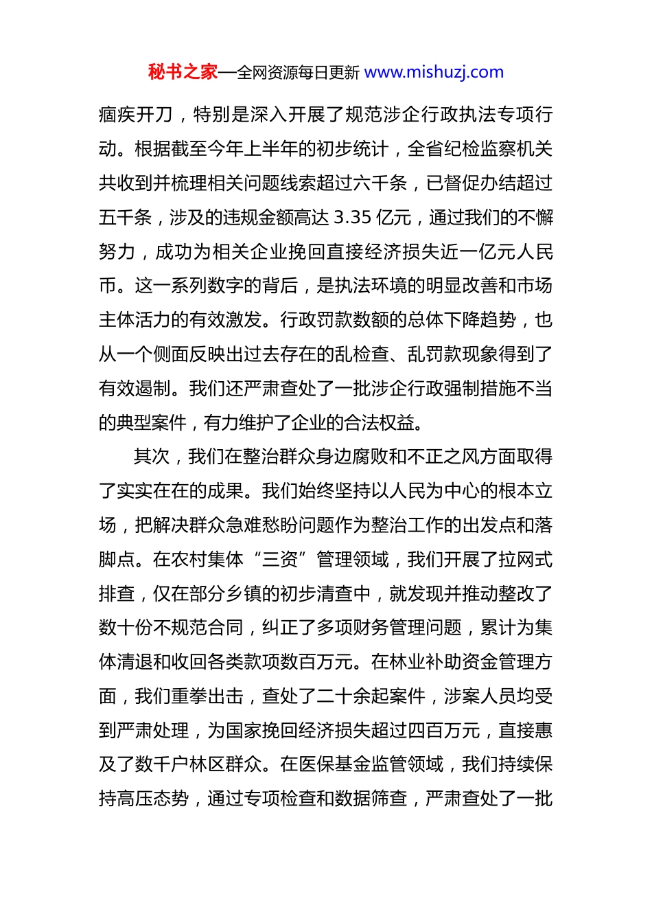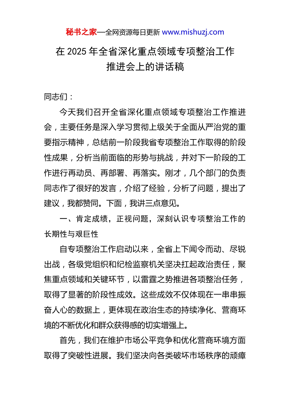 秘书之家—全网资源每日更新 www.mishuzj.com在 2025 年全省深化重点领域专项整治工作推进会上的讲话稿 同志们:今天我们召开全省深化重点领域专项整治工作推进会,主要任务是深入学习贯彻上级关于全面从严治党的重要指示精神,总结前一阶段我省专项整治工作取得的阶段性成果,分析当前面临的形势与挑战,并对下一阶段的工作进行再动员、再部署、再落实。刚才,几个部门的负责同志作了很好的发言,介绍了经验,分析了问题,提出了建议,我都赞同。下面,我讲三点意见。一、肯定成绩,正视问题,深刻认识专项整治工作的长期性与艰巨性自专项整治工作启动以来,全省上下闻令而动、尽锐出战,各级党组织和纪检监察机关坚决扛起政治责任,聚焦重点领域和关键环节,以雷霆之势推进各项整治任务,取得了显著的阶段性成效。这些成效不仅体现在一串串振奋人心的数据上,更体现在政治生态的持续净化、营商环境的不断优化和群众获得感的切实增强上。首先,我们在维护市场公平竞争和优化营商环境方面取得了突破性进展。我们坚决向各类破坏市场秩序的顽瘴秘书之家—全网资源每日更新 www.mishuzj.com痼疾开刀,特别是深入开展了规范涉企行政执法专项行动。根据截至今年上半年的初步统计,全省纪检监察机关共收到并梳理相关问题线索超过六千条,已督促办结超过五千条,涉及的违规金额高达 3.35 亿元,通过我们的不懈努力,成功为相关企业挽回直接经济损失近一亿元人民币。这一系列数字的背后,是执法环境的明显改善和市场主体活力的有效激发。行政罚款数额的总体下降趋势,也从一个侧面反映出过去存在的乱检查、乱罚款现象得到了有效遏制。我们还严肃查处了一批涉企行政强制措施不当的典型案件,有力维护了企业的合法权益。其次,我们在整治群众身边腐败和不正之风方面取得了实实在在的成果。我们始终坚持以人民为中心的根本立场,把解决群众急难愁盼问题作为整治工作的出发点和落脚点。在农村集体“三资”管理领域,我们开展了拉网式排查,仅在部分乡镇的初步清查中,就发现并推动整改了数十份不规范合同,纠正了多项财务管理问题,累计为集体清退和收回各类款项数百万元。在林业补助资金管理方面,我们重拳出击,查处了二十余起案件,涉案人员均受到严肃处理,为国家挽回经济损失超过四百万元,直接惠及了数千户林区群众。在医保基金监管领域,我们持续保持高压态势,通过专项检查和数据筛查,严肃查处了一批秘书之家—全网资源每日更新 www.mishuzj.com欺诈骗保的典型案件,守护好了人民群众的“看病钱”和“救命钱”。同时,我们还针对社会高度关注的养老诈骗问题开展了专项打击,依法惩处了一批犯罪分子,最大限度追赃挽损,维护了老年群体的合法权益。再次,我们在提升社会治理能力和城市管理水平方面展现了新的作为。我们积极回应社会关切,针对城市管理中的难点痛点问题,开展了一系列集中整治行动。从建筑垃圾的规范化处理,到市容环境的综合整治;从道路运输行业的安全隐患排查,到老年代步车的专项治理;从餐饮油烟的达标排放监管,到对“黑民宿”等非法经营场所的清理取缔,我们坚持多措并举、严格执法,推动城市面貌和人居环境持续改善。通过公布物业领域、旅游市场、网络环境等方面的典型案例我们有效发挥了警示教育和正面引导作用,推动形成了齐抓共管的良好社会氛围。在肯定成绩的同时,我们必须清醒地认识到,当前我省党风廉政建设和反腐败斗争形势依然严峻复杂,在专项整治工作中还存在一些不容忽视的问题。一些地方和单位仍然存在思想认识不到位、责任落实有偏差、工作力度层层递减的现象;一些深层次、行业性、领域性的问题尚未得到根本解决,隐形变异的“四风”问题依然禁而未绝;部分干部在整治工作中存在畏难情绪和“过关”心态,不敢秘书之家—全网资源每日更新 www.mishuzj.com动真碰硬,导致一些问题整改不彻底、易反弹;制度建设和长效机制的建立还相对滞后,“当下改”与“长久立”的衔接还不够紧密。这些问题警示我们,专项整治工作绝非一朝一夕之功,而是一场需要常抓不懈、久久为功的攻坚战和持久战。我们必须保持战略定力,发扬斗争精神,以永远在路上...