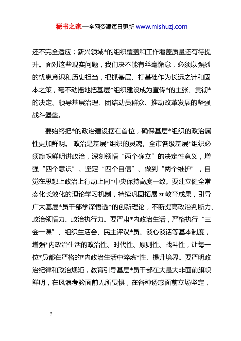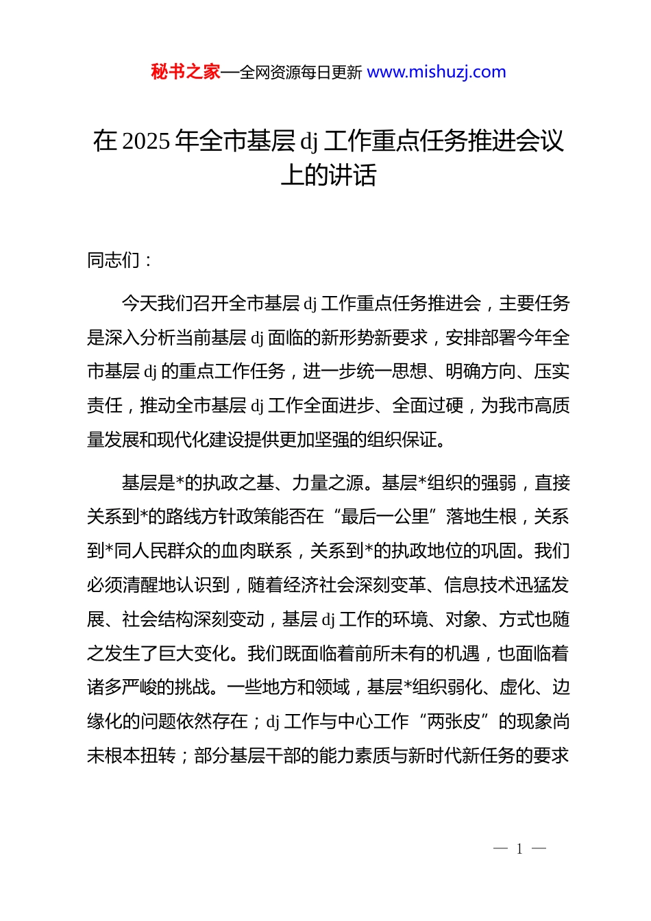 秘书之家—全网资源每日更新 www.mishuzj.com在 2025 年全市基层 dj 工作重点任务推进会议上的讲话同志们:今天我们召开全市基层 dj 工作重点任务推进会,主要任务是深入分析当前基层 dj 面临的新形势新要求,安排部署今年全市基层 dj 的重点工作任务,进一步统一思想、明确方向、压实责任,推动全市基层 dj 工作全面进步、全面过硬,为我市高质量发展和现代化建设提供更加坚强的组织保证。基层是*的执政之基、力量之源。基层*组织的强弱,直接关系到*的路线方针政策能否在“最后一公里”落地生根,关系到*同人民群众的血肉联系,关系到*的执政地位的巩固。我们必须清醒地认识到,随着经济社会深刻变革、信息技术迅猛发展、社会结构深刻变动,基层 dj 工作的环境、对象、方式也随之发生了巨大变化。我们既面临着前所未有的机遇,也面临着诸多严峻的挑战。一些地方和领域,基层*组织弱化、虚化、边缘化的问题依然存在;dj 工作与中心工作“两张皮”的现象尚未根本扭转;部分基层干部的能力素质与新时代新任务的要求— 1 —秘书之家—全网资源每日更新 www.mishuzj.com还不完全适应;新兴领域*的组织覆盖和工作覆盖质量还有待提升。面对这些现实问题,我们决不能有丝毫懈怠,必须以强烈的忧患意识和历史担当,把抓基层、打基础作为长远之计和固本之策,毫不动摇地把基层*组织建设成为宣传*的主张、贯彻*的决定、领导基层治理、团结动员群众、推动改革发展的坚强战斗堡垒。要始终把*的政治建设摆在首位,确保基层*组织的政治属性更加鲜明。 政治是基层*组织的灵魂。全市各级基层*组织必须旗帜鲜明讲政治,深刻领悟“两个确立”的决定性意义,增强“四个意识”、坚定“四个自信”、做到“两个维护”,自觉在思想上政治上行动上同*中央保持高度一致。要建立健全常态化长效化的理论学习机制,持续巩固拓展 zt 教育成果,引导广大基层*员干部学深悟透*的创新理论,不断提高政治判断力、政治领悟力、政治执行力。要严肃*内政治生活,严格执行“三会一课”、组织生活会、民主评议*员、谈心谈话等基本制度,增强*内政治生活的政治性、时代性、原则性、战斗性,让每一位*员都在严格的*内政治生活中淬炼*性、提升境界。要严明政治纪律和政治规矩,教育引导基层*员干部在大是大非面前旗帜鲜明,在风浪考验面前无所畏惧,在各种诱惑面前立场坚定,— 2 —秘书之家—全网资源每日更新 www.mishuzj.com确保*的路线方针政策和上级*委的决策部署在基层不折不扣得到贯彻执行,决不允许“上有政策、下有对策”,决不允许有令不行、有禁不止。要着力构建严密有力的组织体系,不断夯实*执政的组织基础。 组织体系是*的优势所在、力量所在。我们要树立大抓基层的鲜明导向,坚持“人在哪里、*员在哪里,dj 工作就要跟进到哪里”,推动*的组织有效嵌入各类社会基层组织,*的工作有效覆盖社会各类群体。在农村,要持续深化“抓乡促村”责任制,选优配强村*组织书记,常态化整顿软弱涣散村*组织,大力发展壮大村级集体经济,提升村级*组织带领群众共同富裕的能力和水平。在城市,要深化城市基层 dj 引领基层治理,健全完善社区*组织领导下的居委会、业委会、物业服务企业协调运行机制,推进“红色物业”建设,打通服务群众、化解矛盾的“最后一米”。在机关,要着力解决“灯下黑”问题,推动dj 与业务工作深度融合、相互促进,建设让*中央放心、让人民群众满意的模范机关。在国有企业,要坚持和加强*对国有企业的全面领导,把*的领导融入公司治理各环节,确保企业发展到哪里、*的建设就跟进到哪里。在学校,要落实*组织领导下的校长负责制,把*的领导贯穿办学治校、立德树人全过程。在公— 3 —秘书之家—全网资源每日更新 www.mishuzj.com立医院,要健全完善医院*组织会议和院长办公会议议事决策规则,把*的领导融入医院治理。要特别关注非公有制经济组织和社会组织 dj 工作,加大在产业园区、商务楼宇、互联网平台企业、快递物流业等新兴领域的*组织组建力度,探索适应新业态、新就业群体特点的 dj 工作模式,不断扩大*在新兴领域的号召力凝聚力影响力。要聚焦提升基层...