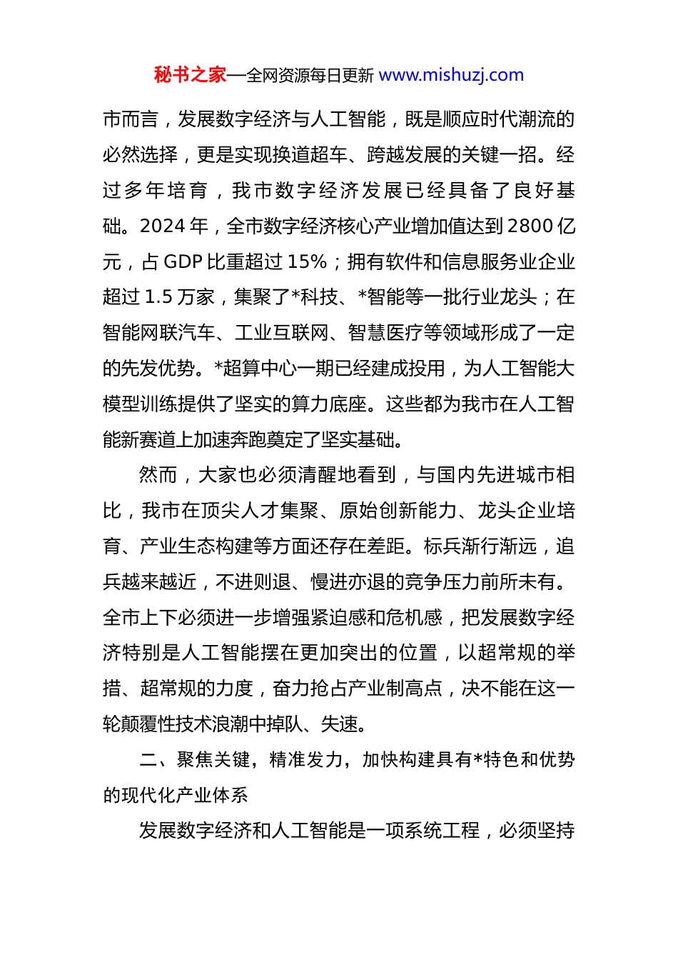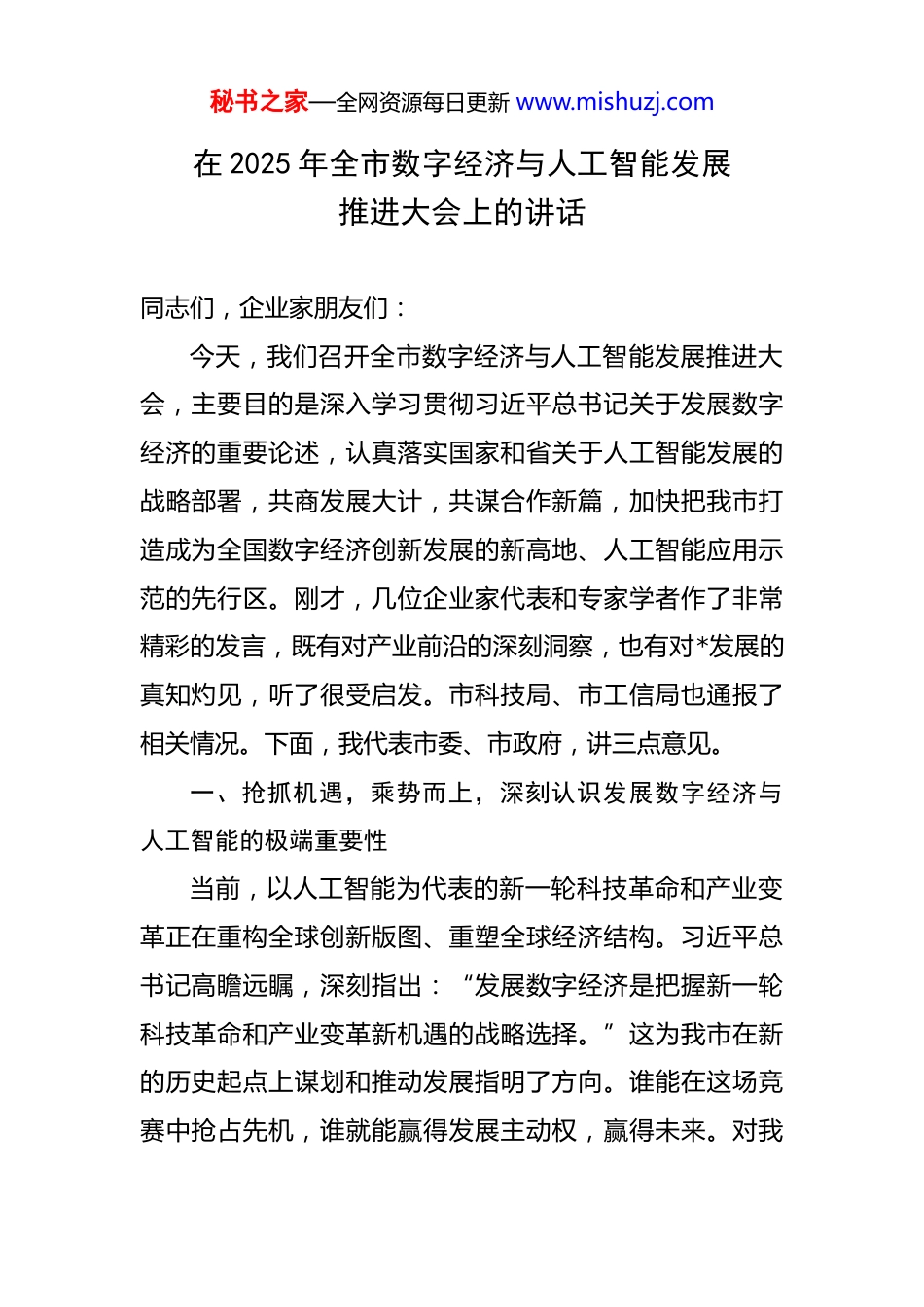 秘书之家—全网资源每日更新 www.mishuzj.com在 2025 年全市数字经济与人工智能发展推进大会上的讲话 同志们,企业家朋友们:今天,我们召开全市数字经济与人工智能发展推进大会,主要目的是深入学习贯彻习近平总书记关于发展数字经济的重要论述,认真落实国家和省关于人工智能发展的战略部署,共商发展大计,共谋合作新篇,加快把我市打造成为全国数字经济创新发展的新高地、人工智能应用示范的先行区。刚才,几位企业家代表和专家学者作了非常精彩的发言,既有对产业前沿的深刻洞察,也有对*发展的真知灼见,听了很受启发。市科技局、市工信局也通报了相关情况。下面,我代表市委、市政府,讲三点意见。一、抢抓机遇,乘势而上,深刻认识发展数字经济与人工智能的极端重要性当前,以人工智能为代表的新一轮科技革命和产业变革正在重构全球创新版图、重塑全球经济结构。习近平总书记高瞻远瞩,深刻指出:“发展数字经济是把握新一轮科技革命和产业变革新机遇的战略选择。”这为我市在新的历史起点上谋划和推动发展指明了方向。谁能在这场竞赛中抢占先机,谁就能赢得发展主动权,赢得未来。对我秘书之家—全网资源每日更新 www.mishuzj.com市而言,发展数字经济与人工智能,既是顺应时代潮流的必然选择,更是实现换道超车、跨越发展的关键一招。经过 多 年 培 育 , 我 市 数 字 经 济 发 展 已 经 具 备 了 良 好 基础。2024 年,全市数字经济核心产业增加值达到 2800 亿元,占 GDP 比重超过 15%;拥有软件和信息服务业企业超过 1.5 万家,集聚了*科技、*智能等一批行业龙头;在智能网联汽车、工业互联网、智慧医疗等领域形成了一定的先发优势。*超算中心一期已经建成投用,为人工智能大模型训练提供了坚实的算力底座。这些都为我市在人工智能新赛道上加速奔跑奠定了坚实基础。然而,大家也必须清醒地看到,与国内先进城市相比,我市在顶尖人才集聚、原始创新能力、龙头企业培育、产业生态构建等方面还存在差距。标兵渐行渐远,追兵越来越近,不进则退、慢进亦退的竞争压力前所未有。全市上下必须进一步增强紧迫感和危机感,把发展数字经济特别是人工智能摆在更加突出的位置,以超常规的举措、超常规的力度,奋力抢占产业制高点,决不能在这一轮颠覆性技术浪潮中掉队、失速。二、聚焦关键,精准发力,加快构建具有*特色和优势的现代化产业体系发展数字经济和人工智能是一项系统工程,必须坚持秘书之家—全网资源每日更新 www.mishuzj.com系统观念,突出重点,协同推进,着力在关键环节上实现新突破。第一,要着力夯实“新基建”底座。算力是人工智能时代的“水和电”。要统筹推进“算力、算网、算法”一体化建设。一是加快提升智能算力供给能力。要高标准推进*超算中心二期建设,力争到 2026 年,全市智能算力规模超过 5000P。要探索构建多元化、市场化的算力供给模式,引导社会资本参与智算中心建设运营,降低企业用算成本。二是构建高速泛在的算力网络。要加快 5G-A、全光网络、工业互联网等新型网络基础设施部署,打通算力在不同区域、不同主体之间的流动通道,实现“算力一张网、调度一平台”。三是打造高质量的算法与数据资源库。要支持高校、科研院所和龙头企业围绕基础大模型、行业大模型开展联合攻关。要加快公共数据有序开放,建设高质量的行业训练数据集,为大模型训练和应用提供“数据燃料”。第二,要着力培育“强产业”集群。产业是发展的根基。要坚持“应用牵引、整机带动、软硬协同”,推动人工智能产业集群化、生态化发展。一是做强人工智能核心产业。要重点发展智能芯片、核心算法、智能传感器等基础层,培育壮大计算机视觉、自然语言处理、智能语音等秘书之家—全网资源每日更新 www.mishuzj.com技术层,形成具有核心竞争力的产业长板。力争到 2026年,全市人工智能核心产业规模突破 1000 亿元。二是推动“人工智能+”赋能百业。要深入实施人工智能赋能行动,聚焦制造业、金融、文旅、医疗、教育等重点行业,打造100 个以上深度融合的典型应用场景。特别是在制造业领域,要以“智改数转”为抓手,支持企业应用工业...