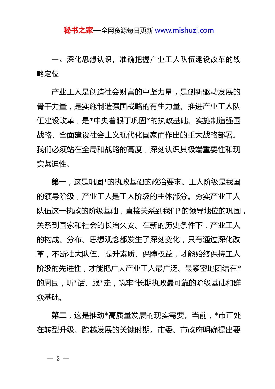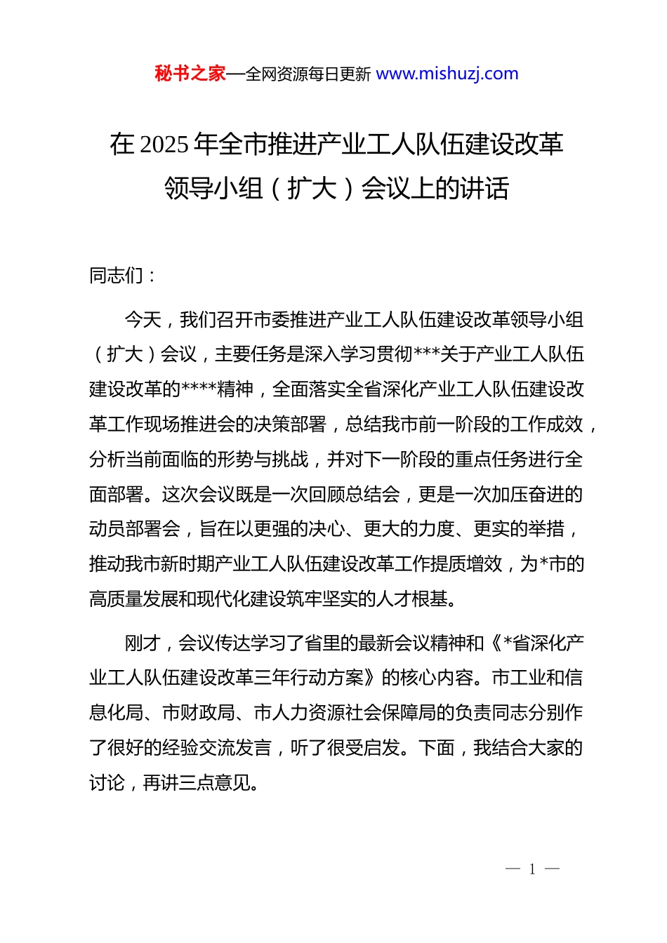 秘书之家—全网资源每日更新 www.mishuzj.com在 2025 年全市推进产业工人队伍建设改革领导小组(扩大)会议上的讲话同志们:今天,我们召开市委推进产业工人队伍建设改革领导小组(扩大)会议,主要任务是深入学习贯彻***关于产业工人队伍建设改革的****精神,全面落实全省深化产业工人队伍建设改革工作现场推进会的决策部署,总结我市前一阶段的工作成效,分析当前面临的形势与挑战,并对下一阶段的重点任务进行全面部署。这次会议既是一次回顾总结会,更是一次加压奋进的动员部署会,旨在以更强的决心、更大的力度、更实的举措,推动我市新时期产业工人队伍建设改革工作提质增效,为*市的高质量发展和现代化建设筑牢坚实的人才根基。刚才,会议传达学习了省里的最新会议精神和《*省深化产业工人队伍建设改革三年行动方案》的核心内容。市工业和信息化局、市财政局、市人力资源社会保障局的负责同志分别作了很好的经验交流发言,听了很受启发。下面,我结合大家的讨论,再讲三点意见。— 1 —秘书之家—全网资源每日更新 www.mishuzj.com一、深化思想认识,准确把握产业工人队伍建设改革的战略定位产业工人是创造社会财富的中坚力量,是创新驱动发展的骨干力量,是实施制造强国战略的有生力量。推进产业工人队伍建设改革,是*中央着眼于巩固*的执政基础、实施制造强国战略、全面建设社会主义现代化国家而作出的重大战略部署。我们必须站在全局和战略的高度,深刻认识其极端重要性和现实紧迫性。第一,这是巩固*的执政基础的政治要求。工人阶级是我国的领导阶级,产业工人是工人阶级的主体部分。夯实产业工人队伍这一执政的阶级基础,直接关系到我们*的领导地位的巩固,关系到国家和社会的长治久安。在新的历史条件下,产业工人的构成、分布、思想观念都发生了深刻变化,只有通过深化改革,不断壮大队伍、提升素质、保障权益,才能始终保持工人阶级的先进性,才能把广大产业工人最广泛、最紧密地团结在*的周围,听*话、跟*走,筑牢*长期执政最可靠的阶级基础和群众基础。第二,这是推动*高质量发展的现实需要。当前,*市正处在转型升级、跨越发展的关键时期。市委、市政府明确提出要— 2 —秘书之家—全网资源每日更新 www.mishuzj.com构建具有*特色的现代化产业体系,无论是传统产业的提质增效,还是战略性新兴产业的培育壮大,都离不开一支宏大的知识型、技能型、创新型产业工人大军。然而,我们必须清醒地看到,我市产业工人队伍的现状与高质量发展的要求相比,还存在一些不相适应的地方:技能人才总量不足、结构不优的问题依然突出;“重学历、轻技能”的社会观念尚未根本扭转;产业工人的职业荣誉感、社会地位和经济待遇有待进一步提高。这些问题不解决,产业升级就是空中楼阁,高质量发展就是一句空话。第三,这是落实省委决策部署的具体行动。省委、省政府高度重视产改工作,近期专门出台了《*省深化产业工人队伍建设改革三年行动方案》,明确了未来三年的目标任务和行动路径。方案提出,到 2027 年,要新增高技能人才 70 万人次左右,培养造就一大批工匠人才。这为我们指明了方向,也下达了任务书。*市作为全省发展格局中的重要一环,必须主动对标对表,坚决扛起责任,将省里的“作战图”转化为我市的“施工图”,确保改革任务不折不扣落到实处。过去一段时间,在市委的坚强领导下,全市各级各部门协同发力,我市产改工作取得了阶段性成效。思想引领持续加强,— 3 —秘书之家—全网资源每日更新 www.mishuzj.com技能培训体系不断完善,权益保障机制逐步健全。特别是今年以来,全市已组织开展各类职业技能培训 6592 人次,并积极探索落实“新八级工”制度,新增技能人才达到 1041 人,这些成绩值得充分肯定。但我们更要看到,成绩只是起点,改革永远在路上。面对新形势新任务,我们绝不能有丝毫松懈,必须以“归零”的心态、“冲刺”的姿态,推动产改工作向纵深发展。二、聚焦关键环节,以钉钉子精神推动改革任务落地见效深化产改工作是一项复杂的系统工程,必须坚持问题导向和目标导向,抓住主要矛盾和矛盾的主要方面,精准发力、持续用力。接下来,...