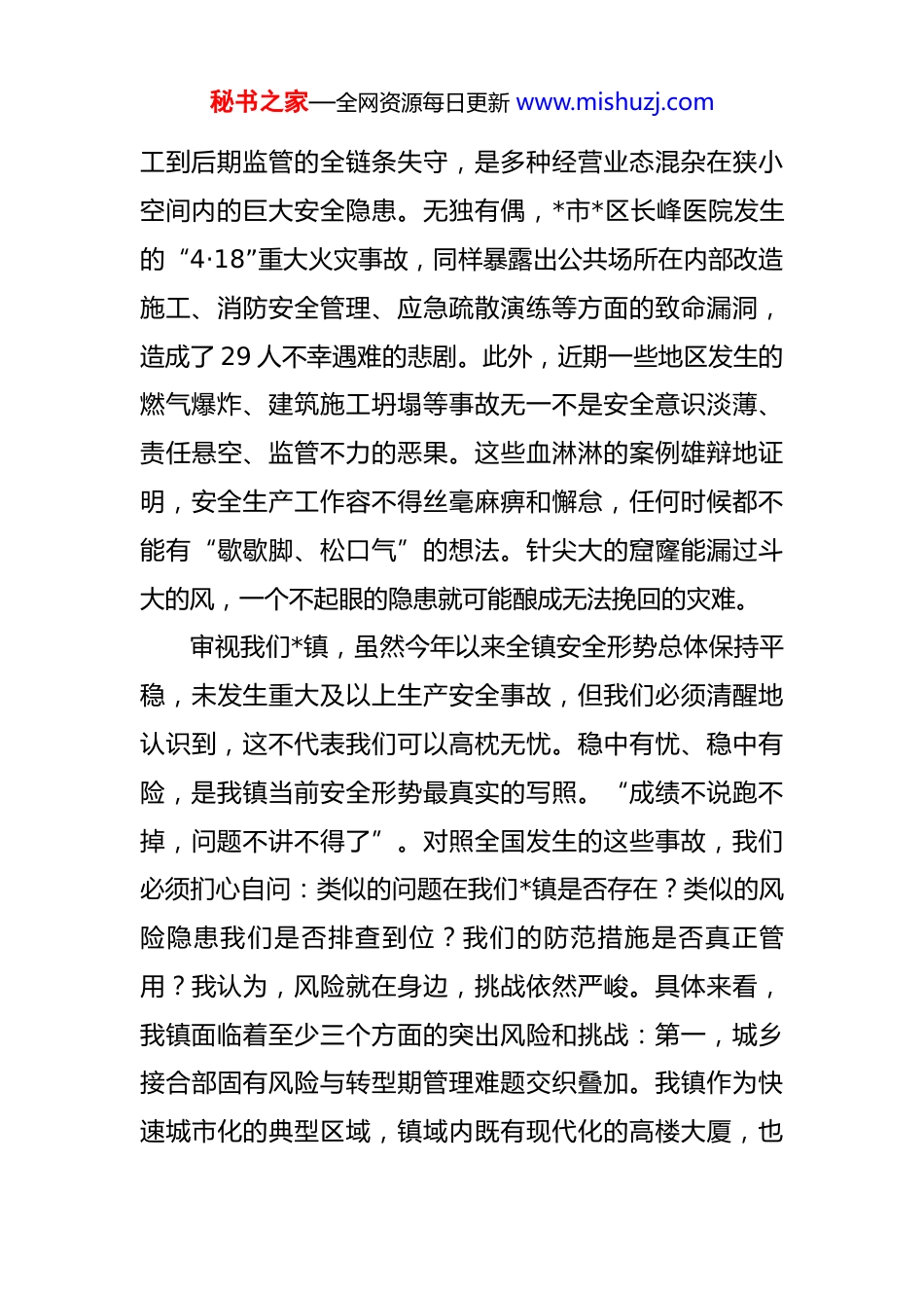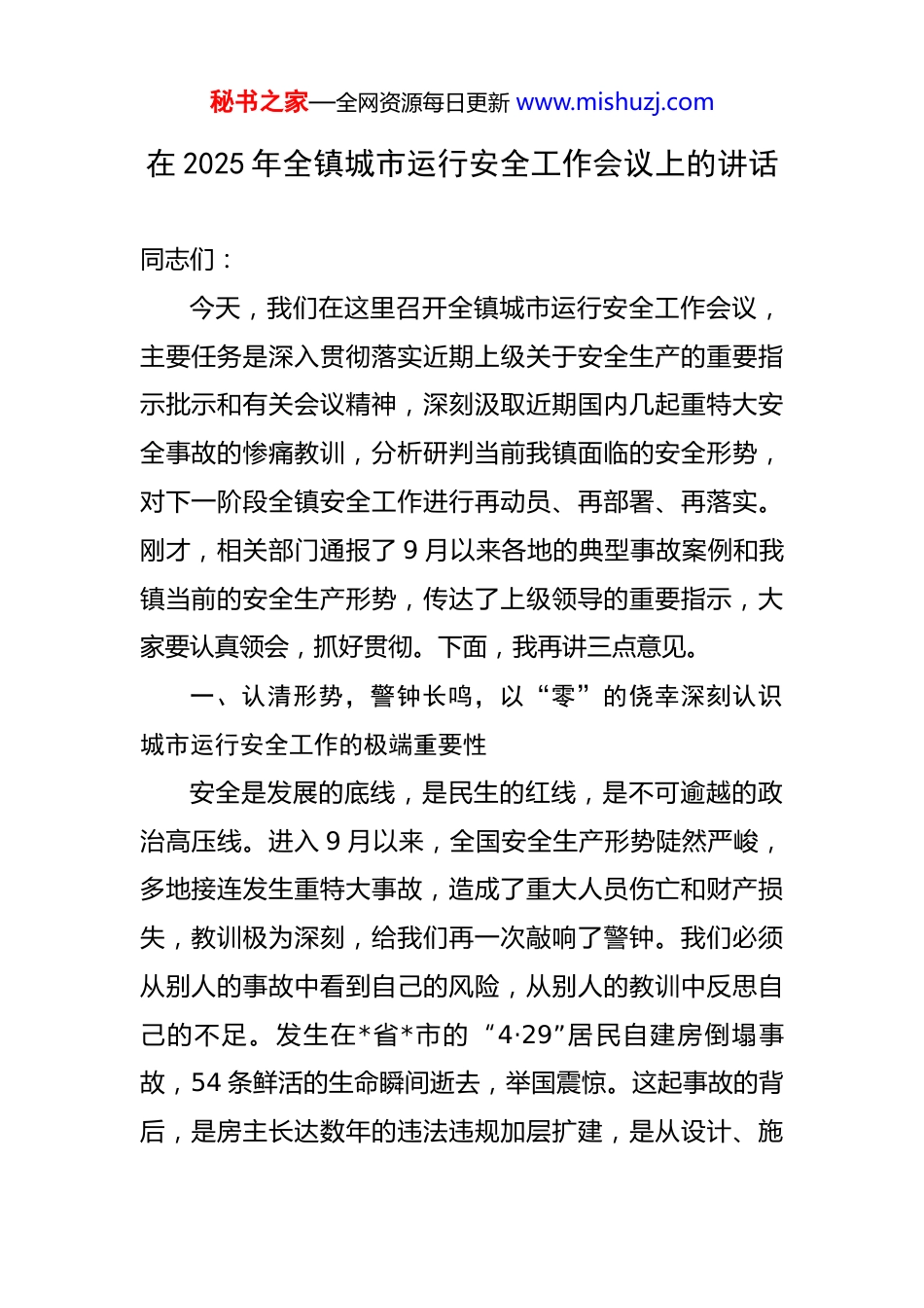 秘书之家—全网资源每日更新 www.mishuzj.com在 2025 年全镇城市运行安全工作会议上的讲话 同志们:今天,我们在这里召开全镇城市运行安全工作会议,主要任务是深入贯彻落实近期上级关于安全生产的重要指示批示和有关会议精神,深刻汲取近期国内几起重特大安全事故的惨痛教训,分析研判当前我镇面临的安全形势,对下一阶段全镇安全工作进行再动员、再部署、再落实。刚才,相关部门通报了 9 月以来各地的典型事故案例和我镇当前的安全生产形势,传达了上级领导的重要指示,大家要认真领会,抓好贯彻。下面,我再讲三点意见。一、认清形势,警钟长鸣,以“零”的侥幸深刻认识城市运行安全工作的极端重要性安全是发展的底线,是民生的红线,是不可逾越的政治高压线。进入 9 月以来,全国安全生产形势陡然严峻,多地接连发生重特大事故,造成了重大人员伤亡和财产损失,教训极为深刻,给我们再一次敲响了警钟。我们必须从别人的事故中看到自己的风险,从别人的教训中反思自己的不足。发生在*省*市的“4·29”居民自建房倒塌事故,54 条鲜活的生命瞬间逝去,举国震惊。这起事故的背后,是房主长达数年的违法违规加层扩建,是从设计、施秘书之家—全网资源每日更新 www.mishuzj.com工到后期监管的全链条失守,是多种经营业态混杂在狭小空间内的巨大安全隐患。无独有偶,*市*区长峰医院发生的“4·18”重大火灾事故,同样暴露出公共场所在内部改造施工、消防安全管理、应急疏散演练等方面的致命漏洞,造成了 29 人不幸遇难的悲剧。此外,近期一些地区发生的燃气爆炸、建筑施工坍塌等事故无一不是安全意识淡薄、责任悬空、监管不力的恶果。这些血淋淋的案例雄辩地证明,安全生产工作容不得丝毫麻痹和懈怠,任何时候都不能有“歇歇脚、松口气”的想法。针尖大的窟窿能漏过斗大的风,一个不起眼的隐患就可能酿成无法挽回的灾难。审视我们*镇,虽然今年以来全镇安全形势总体保持平稳,未发生重大及以上生产安全事故,但我们必须清醒地认识到,这不代表我们可以高枕无忧。稳中有忧、稳中有险,是我镇当前安全形势最真实的写照。“成绩不说跑不掉,问题不讲不得了”。对照全国发生的这些事故,我们必须扪心自问:类似的问题在我们*镇是否存在?类似的风险隐患我们是否排查到位?我们的防范措施是否真正管用?我认为,风险就在身边,挑战依然严峻。具体来看,我镇面临着至少三个方面的突出风险和挑战:第一,城乡接合部固有风险与转型期管理难题交织叠加。我镇作为快速城市化的典型区域,镇域内既有现代化的高楼大厦,也秘书之家—全网资源每日更新 www.mishuzj.com并存着大量的农村自建房和老旧小区。农村自建房体量大、底数不清、情况复杂,违规加层、野蛮装修、改变使用性质等问题屡见不鲜。特别是一些“厂中宅”“店中宅”的“三合一”场所,生产、经营、仓储、住宿功能混杂,消防通道堵塞、电气线路私拉乱接等现象突出,一旦发生火灾,极易造成群死群伤。我们前期的排查整治虽然取得了一定成效,但距离“起底清零”的目标还有很大差距,存量风险依然巨大。第二,人员密集场所安全承载压力与新业态监管空白交织叠加。随着我镇经济社会发展和人口持续导入,大型商业综合体、高层住宅小区、学校、医院、养老机构等人员密集场所不断增多,消防安全、设施安全、食品安全、特种设备安全的管理压力与日俱增。同时,近年来涌现出的剧本杀、密室逃脱、私人影院等新业态,往往藏身于商住楼宇或自建房内,这些场所空间密闭、出口单一、消防设施先天不足,存在极大的安全监管空白,成为城市安全新的风险点。这些新业态如何管、谁来管、标准是什么,是我们必须尽快破解的课题。第三,安全生产责任体系“上热中温下冷”与基层治理能力不足交织叠加。从我们日常督查和近期情况看,一些部门和单位的干部依然存在和平麻痹思想,认为事故是小概率事件,离自己很远;有的在执法检查中“宽、松、软”,对秘书之家—全网资源每日更新 www.mishuzj.com发现的隐患问题督促整改不力,缺乏“较真碰硬”的狠劲;部门之间的联动协同机制还不够顺畅,存在信息壁垒和责任边界不清的问题;企业主体责任落实不...