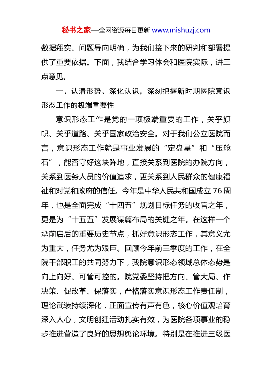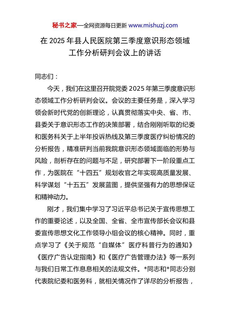 秘书之家—全网资源每日更新 www.mishuzj.com在 2025 年县人民医院第三季度意识形态领域工作分析研判会议上的讲话 同志们:今天,我们在这里召开院党委 2025 年第三季度意识形态领域工作分析研判会议。会议的主要任务是,深入学习领会新时代党的创新理论,认真贯彻落实中央、省、市、县委关于意识形态工作的决策部署,结合刚刚听取的纪委和医务科关于上半年投诉热线及第三季度医疗纠纷情况的分析报告,精准研判当前我院意识形态领域面临的形势与风险,剖析存在的问题与不足,研究部署下一阶段重点工作,为医院在“十四五”规划收官之年实现高质量发展、科学谋划“十五五”发展蓝图,提供坚强有力的思想保证和精神动力。刚才,我们集中学习了习近平总书记关于宣传思想工作的重要论述,以及全国、全省、全市宣传部长会议和县委宣传思想文化工作领导小组会议的核心精神。同时,重点学习了《关于规范“自媒体”医疗科普行为的通知》《医疗广告认定指南》和《医疗广告管理办法》等一系列与我们日常工作息息相关的法规文件。*同志和*同志分别代表院纪委和医务科,就相关情况作了详尽的分析报告,秘书之家—全网资源每日更新 www.mishuzj.com数据翔实、问题导向明确,为我们接下来的研判和部署提供了重要依据。下面,我结合学习体会和医院实际,讲三点意见。一、认清形势、深化认识,深刻把握新时期医院意识形态工作的极端重要性意识形态工作是党的一项极端重要的工作,关乎旗帜、关乎道路、关乎国家政治安全。对于我们公立医院而言,意识形态工作就是事业发展的“定盘星”和“压舱石”,能否守好这块阵地,直接关系到医院的办院方向,关系到医务人员的价值追求,更关系到人民群众的健康福祉和对党和政府的信任。今年是中华人民共和国成立 76 周年,也是全面完成“十四五”规划目标任务的收官之年,更是为“十五五”发展谋篇布局的关键之年。在这样一个承前启后的重要历史节点,抓好意识形态工作,其意义尤为重大,任务尤为艰巨。回顾今年前三季度的工作,在全院干部职工的共同努力下,我院意识形态领域总体态势是向上向好、可管可控的。院党委坚持把方向、管大局、作决策、促改革、保落实,严格落实意识形态工作责任制,理论武装持续深化,正面宣传有声有色,核心价值观培育深入人心,文明创建活动扎实有效,为医院各项事业的稳步推进营造了良好的思想舆论环境。特别是在推进三级医秘书之家—全网资源每日更新 www.mishuzj.com院创建、深化优质服务、加强学科建设等方面,全院上下展现出了昂扬的精神面貌和强大的凝聚力。然而,在肯定成绩的同时,我们必须以“时时放心不下”的责任感,清醒地看到潜在的风险和挑战。随着信息技术的迅猛发展和传播格局的深刻变革,意识形态领域的斗争和较量日趋激烈和复杂。一些错误思潮和价值观通过网络“自媒体”等渠道渗透传播,对我们医务人员的职业信仰、道德观念和行为准则带来冲击。从刚才两个部门的报告中,我们也能管中窥豹,发现一些苗头性、倾向性问题。上半年 12345 服务热线受理的 128 件投诉中,涉及服务态度和沟通解释不到位的占到了 35%以上;在第三季度发生的 15 起医疗纠纷及投诉中,有近一半的起因并非完全是医疗技术问题,而是源于沟通不畅、人文关怀缺失。这些看似是服务作风问题、医患关系问题,但深挖其根源,实际上是部分干部职工思想认识上出现了偏差,是以人民为中心的发展思想和“患者至上”的服务理念树得不牢、践行不力的具体表现。这充分说明,我院意识意识形态领域并非一片净土,风险隐患依然存在。全院上下,特别是各级领导干部和党员同志,必须摒弃麻痹思想和侥幸心理,深刻认识到意识形态工作的长期性、复杂性和艰巨性,切实把思想和行动统一到中央和上级党委的决策部署上来,秘书之家—全网资源每日更新 www.mishuzj.com以最高的标准、最严的要求、最实的举措,牢牢掌握意识形态工作的领导权和主动权。二、直面问题、深挖根源,精准剖析当前意识形态领域存在的突出短板坚持问题导向是做好一切工作的前提。只有敢于正视问题、善于分析问题,才能找准症结、对症下药。结合日常观察、调研情况以及刚才的...