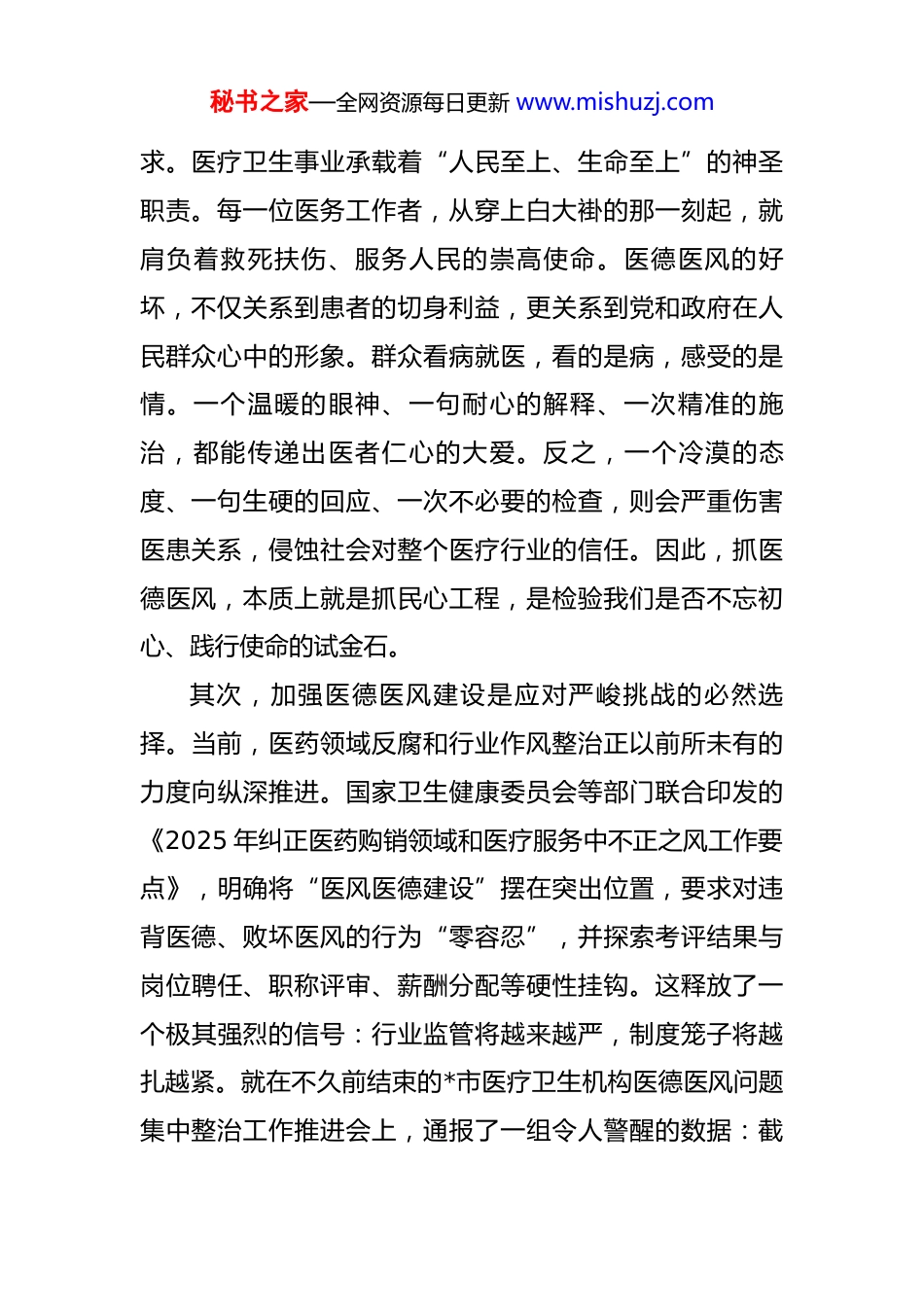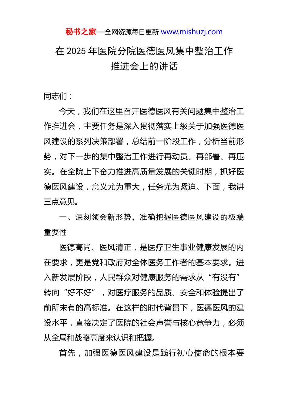 秘书之家—全网资源每日更新 www.mishuzj.com在 2025 年医院分院医德医风集中整治工作推进会上的讲话 同志们:今天,我们在这里召开医德医风有关问题集中整治工作推进会,主要任务是深入贯彻落实上级关于加强医德医风建设的系列决策部署,总结前一阶段工作,分析当前形势,对下一步的集中整治工作进行再动员、再部署、再压实。在全院上下奋力推进高质量发展的关键时期,抓好医德医风建设,意义尤为重大,任务尤为紧迫。下面,我讲三点意见。一、深刻领会新形势,准确把握医德医风建设的极端重要性医德高尚、医风清正,是医疗卫生事业健康发展的内在要求,更是党和政府对全体医务工作者的基本要求。进入新发展阶段,人民群众对健康服务的需求从“有没有”转向“好不好”,对医疗服务的品质、安全和体验提出了前所未有的高标准。在这样的时代背景下,医德医风的建设水平,直接决定了医院的社会声誉与核心竞争力,必须从全局和战略高度来认识和把握。首先,加强医德医风建设是践行初心使命的根本要秘书之家—全网资源每日更新 www.mishuzj.com求。医疗卫生事业承载着“人民至上、生命至上”的神圣职责。每一位医务工作者,从穿上白大褂的那一刻起,就肩负着救死扶伤、服务人民的崇高使命。医德医风的好坏,不仅关系到患者的切身利益,更关系到党和政府在人民群众心中的形象。群众看病就医,看的是病,感受的是情。一个温暖的眼神、一句耐心的解释、一次精准的施治,都能传递出医者仁心的大爱。反之,一个冷漠的态度、一句生硬的回应、一次不必要的检查,则会严重伤害医患关系,侵蚀社会对整个医疗行业的信任。因此,抓医德医风,本质上就是抓民心工程,是检验我们是否不忘初心、践行使命的试金石。其次,加强医德医风建设是应对严峻挑战的必然选择。当前,医药领域反腐和行业作风整治正以前所未有的力度向纵深推进。国家卫生健康委员会等部门联合印发的《2025 年纠正医药购销领域和医疗服务中不正之风工作要点》,明确将“医风医德建设”摆在突出位置,要求对违背医德、败坏医风的行为“零容忍”,并探索考评结果与岗位聘任、职称评审、薪酬分配等硬性挂钩。这释放了一个极其强烈的信号:行业监管将越来越严,制度笼子将越扎越紧。就在不久前结束的*市医疗卫生机构医德医风问题集中整治工作推进会上,通报了一组令人警醒的数据:截秘书之家—全网资源每日更新 www.mishuzj.com至 2025 年上半年,全市在专项排查中检查了近 6 万名医疗 机构 从业人员,发 现各类 问题 5847 条,涉及金额378.4 万元。这些问题虽然发生在少数人身上,但其负面影响巨大,给我们每一家医疗机构、每一位医务人员都敲响了警钟。我们必须清醒地认识到,医德医风问题绝非小事,它关乎每一位职工的职业前途,更关乎医院的生存与发展。在这样的大环境下,任何麻痹思想、侥幸心理、观望态度,都可能让我们付出沉重的代价。最后,加强医德医风建设是实现医院高质量发展的核心支撑。我院作为*区域骨伤专科领域的重点医疗机构,多年来凭借精湛的技术和良好的服务,在群众中积累了一定的口碑。但是,我们也要看到,随着医疗市场竞争的日趋激烈,技术优势不再是唯一的制胜法宝。优良的医德医风所构筑的品牌信誉和患者忠诚度,正成为医院最宝贵、最难以复制的核心资产。可以说,医德医风就是我们医院的“生命线”。这条线系得紧不紧,直接关系到医院能否行稳致远。一个没有良好医德医风作支撑的医院,即使硬件再好、设备再先进,也终将是沙上建塔,根基不稳。只有全院上下形成风清气正的执业环境,才能真正激发广大职工干事创业的内生动力,才能吸引和留住高水平人才,才能赢得患者的持久信赖,为医院在新的发展征程中筑牢坚秘书之家—全网资源每日更新 www.mishuzj.com不可摧的基石。二、客观审视阶段成效,清醒认识当前存在的短板与挑战自集中整治工作启动以来,院党支部高度重视,迅速成立了专项工作领导小组,制定了实施方案,各科室、各部门按照统一部署,在宣传教育、自查自纠等方面开展了大量工作,取得了一定的阶段性成效。一方面,全员思想认识得到普遍提升。通过组织学习《医疗机构工作人员...