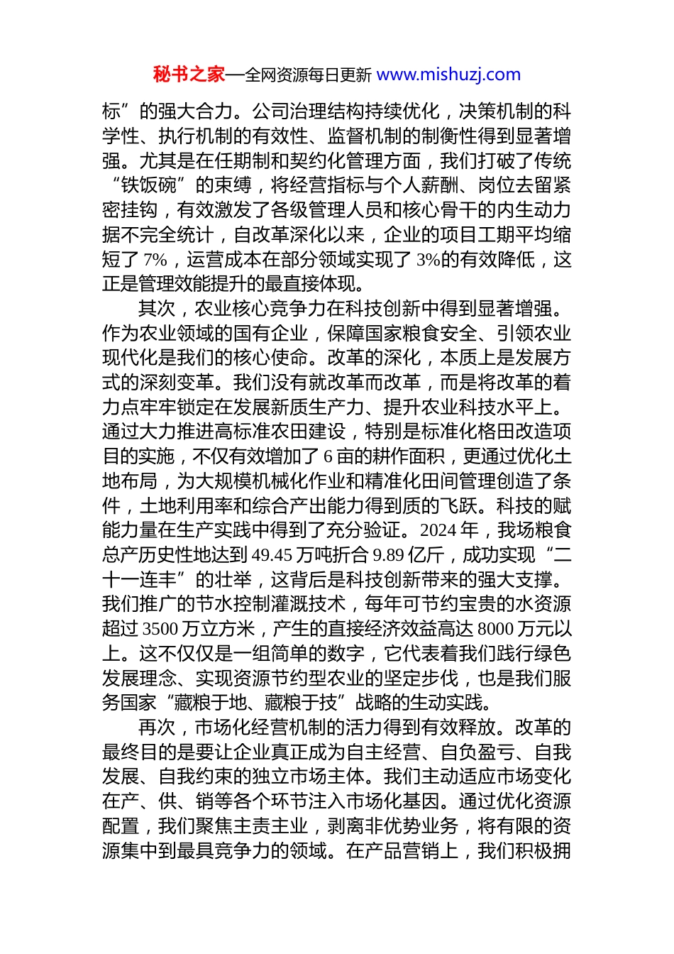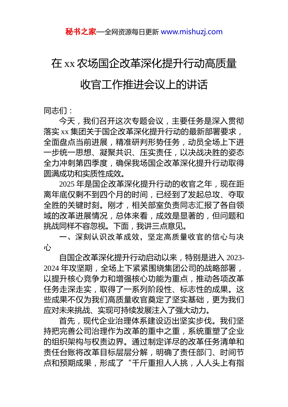 秘书之家—全网资源每日更新 www.mishuzj.com在 xx 农场国企改革深化提升行动高质量收官工作推进会议上的讲话同志们:今天,我们召开这次专题会议,主要任务是深入贯彻落实 xx 集团关于国企改革深化提升行动的最新部署要求,全面盘点当前进展,精准研判形势任务,动员全场上下进一步统一思想、凝聚共识、压实责任,以决战决胜的姿态全力冲刺第四季度,确保我场国企改革深化提升行动取得圆满成功和实质性成效。2025 年是国企改革深化提升行动的收官之年,现在距离年底仅剩不到四个月的时间,已经到了发起总攻、夺取全胜的关键时刻。刚才,相关部室负责同志汇报了各自领域的改革进展情况,总体来看,成效是显著的,但问题和挑战同样不容忽视。下面,我讲三点意见。一、深刻认识改革成效,坚定高质量收官的信心与决心自国企改革深化提升行动启动以来,特别是进入 2023-2024 年攻坚期,全场上下紧紧围绕集团公司的战略部署,以提升核心竞争力和增强核心功能为重点,推动各项改革任务走深走实,取得了一系列阶段性、标志性的成果。这些成果不仅为我们高质量收官奠定了坚实基础,更为我们应对未来挑战、实现可持续发展注入了强大动力。首先,现代企业治理体系建设迈出坚实步伐。我们坚持把完善公司治理作为改革的重中之重,系统重塑了企业的组织架构与权责边界。通过制定详尽的改革任务清单和责任台账将改革目标层层分解,明确了责任部门、时间节点和预期成果,形成了“千斤重担人人挑,人人头上有指秘书之家—全网资源每日更新 www.mishuzj.com标”的强大合力。公司治理结构持续优化,决策机制的科学性、执行机制的有效性、监督机制的制衡性得到显著增强。尤其是在任期制和契约化管理方面,我们打破了传统“铁饭碗”的束缚,将经营指标与个人薪酬、岗位去留紧密挂钩,有效激发了各级管理人员和核心骨干的内生动力据不完全统计,自改革深化以来,企业的项目工期平均缩短了 7%,运营成本在部分领域实现了 3%的有效降低,这正是管理效能提升的最直接体现。其次,农业核心竞争力在科技创新中得到显著增强。作为农业领域的国有企业,保障国家粮食安全、引领农业现代化是我们的核心使命。改革的深化,本质上是发展方式的深刻变革。我们没有就改革而改革,而是将改革的着力点牢牢锁定在发展新质生产力、提升农业科技水平上。通过大力推进高标准农田建设,特别是标准化格田改造项目的实施,不仅有效增加了 6 亩的耕作面积,更通过优化土地布局,为大规模机械化作业和精准化田间管理创造了条件,土地利用率和综合产出能力得到质的飞跃。科技的赋能力量在生产实践中得到了充分验证。2024 年,我场粮食总产历史性地达到 49.45 万吨折合 9.89 亿斤,成功实现“二十一连丰”的壮举,这背后是科技创新带来的强大支撑。我们推广的节水控制灌溉技术,每年可节约宝贵的水资源超过 3500 万立方米,产生的直接经济效益高达 8000 万元以上。这不仅仅是一组简单的数字,它代表着我们践行绿色发展理念、实现资源节约型农业的坚定步伐,也是我们服务国家“藏粮于地、藏粮于技”战略的生动实践。再次,市场化经营机制的活力得到有效释放。改革的最终目的是要让企业真正成为自主经营、自负盈亏、自我发展、自我约束的独立市场主体。我们主动适应市场变化在产、供、销等各个环节注入市场化基因。通过优化资源配置,我们聚焦主责主业,剥离非优势业务,将有限的资源集中到最具竞争力的领域。在产品营销上,我们积极拥秘书之家—全网资源每日更新 www.mishuzj.com抱数字化转型,拓展线上销售渠道,构建品牌矩阵,农产品的市场认可度和附加值得到了显著提升。数据显示,部分特色农产品的销售额实现了同比 15%的增长,这表明我们的产品正逐步从“种得好”向“卖得好”转变。同时,成本管控意识深入人心,“节本增效”不再是一句口号,而是贯穿于生产经营全过程的自觉行动。这种从“要我改”到“我要改”的转变,正是市场化机制释放活力的最佳证明。回顾过去的成绩,我们有理由感到自豪。这些成绩的取得,是上级*委正确领导的结果,更是全场干部职工团结拼搏、攻坚克难的结果。这些成果坚定了我...
