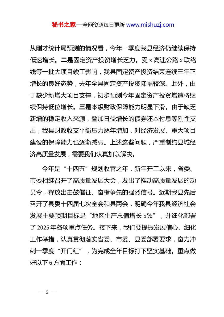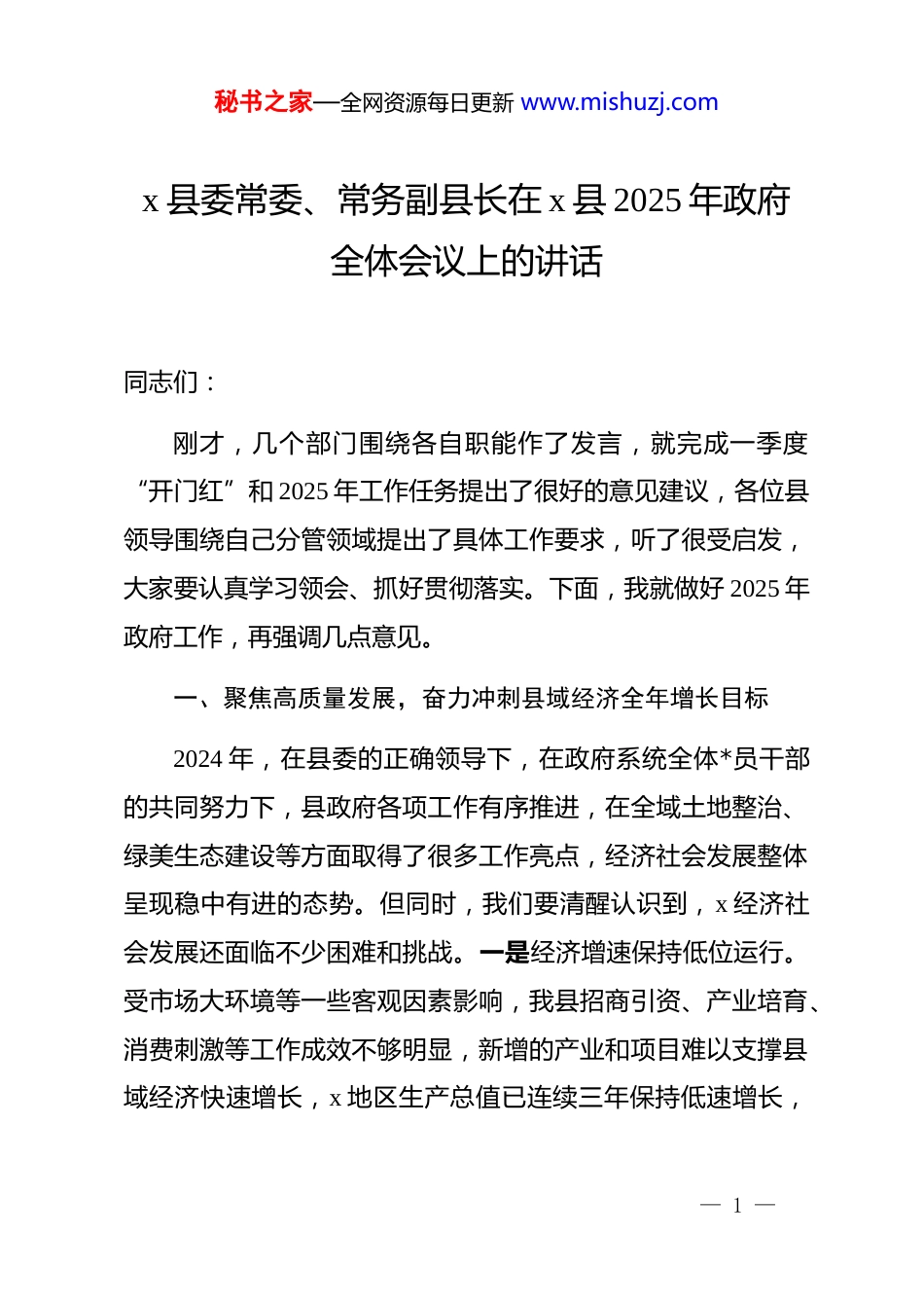 秘书之家—全网资源每日更新 www.mishuzj.comx 县委常委、常务副县长在 x 县 2025 年政府全体会议上的讲话同志们:刚才,几个部门围绕各自职能作了发言,就完成一季度“开门红”和 2025 年工作任务提出了很好的意见建议,各位县领导围绕自己分管领域提出了具体工作要求,听了很受启发,大家要认真学习领会、抓好贯彻落实。下面,我就做好 2025 年政府工作,再强调几点意见。一、聚焦高质量发展,奋力冲刺县域经济全年增长目标2024 年,在县委的正确领导下,在政府系统全体*员干部的共同努力下,县政府各项工作有序推进,在全域土地整治、绿美生态建设等方面取得了很多工作亮点,经济社会发展整体呈现稳中有进的态势。但同时,我们要清醒认识到,x 经济社会发展还面临不少困难和挑战。一是经济增速保持低位运行。受市场大环境等一些客观因素影响,我县招商引资、产业培育、消费刺激等工作成效不够明显,新增的产业和项目难以支撑县域经济快速增长,x 地区生产总值已连续三年保持低速增长,— 1 —秘书之家—全网资源每日更新 www.mishuzj.com从刚才统计局预测的情况看,今年一季度我县经济仍继续保持低速增长。二是固定资产投资增长乏力。受 x 高速公路 x 联络线等一批大项目竣工影响,我县固定资产投资结束连续三年正增长的良好态势,去年全县固定资产投资降幅较深。此外,由于缺少新增大项目支撑,初步预测今年固定资产投资增速将继续保持低位增长。三是本级财政保障能力明显下滑。由于缺乏新增的稳定收入来源,叠加日益增长的债券还本付息等刚性支出,我县财政收支平衡压力逐年增加,对经济发展、重大项目建设的保障能力也逐渐减弱。上述这些问题,严重制约县域经济高质量发展,需要我们认真加以解决。今年是“十四五”规划收官之年,新年开工以来,省委、市委相继召开了高质量发展大会,发出了推动高质量发展的动员令,释放出击鼓催征、奋楫争先的强烈信号。近期我县先后召开了县委十四届七次全会和县两会,明确今年我县经济社会发展主要预期目标是“地区生产总值增长 5%”,并细化部署了 2025 年各项重点任务。接下来,我们要提振发展信心、细化工作举措,认真贯彻落实省委、市委、县委部署要求,奋力冲刺一季度“开门红”,为完成全年目标打下坚实基础。重点做好以下 6 方面工作:— 2 —秘书之家—全网资源每日更新 www.mishuzj.com(一)全力冲刺一季度经济“开门红”。从刚刚县统计局汇报的情况,今年一季度全县地区生产总值预计增长 2.3%,距离市里下达一季度增长 5%的目标任务还有较大差距。对此各乡镇、各有关部门要按照既定的目标任务,抢抓各方面积极因素,奋力抓好经济稳增长各项工作,全力实现一季度全县 gdp增长 3%以上,力争完成 5%的增长目标。一要全力守好农业基本盘。县农业农村局要积极引导农业龙头企业、种植大户抢抓开春有利时节,扩大黄烟、蔬菜、瓜果等高附加值品种的种植面积,同时加快恢复畜牧业产能,保障一季度农林牧渔业增长5%以上。县林业局要抢抓春季植树黄金期,加快完成 2025 年造林项目招投标工作,支撑林业产业稳步增长。二要全力挖掘工业经济增长潜力。初步预测,一季度我县 45 家规上工业企业有 16 家负增长。对此,县工信局、县工业园区管委会要强化重点企业运行监测,重点跟踪服务建溢人工智能、华洲木业、博泰纸业、凯荣德等降幅较大企业,深挖增长潜能,同时密切跟进汇基矿业、梅子窝矿业、联兴造纸等新上规企业生产经营情况,盯紧抓牢制造业投资和技改投资项目,力促一季度制造业投资、技改投资保持高速增长势头,确保一季度规上工业增加值止跌回稳、增长 1%以上。三要全力激发消费潜力。1-2 月,除限额以上批发业同比保持正增长外,限额以上零售、住宿、— 3 —秘书之家—全网资源每日更新 www.mishuzj.com餐饮均存在 2 位数以上的下降。对此,县工信局、县文广旅体局、县市场监管局要积极组织限上企业开展促消费活动,在政府采购、公务接待等方面给予限上企业适度的倾斜,同时把培育企业上限入库作为突破口,积极培育挖掘潜力企业,持续壮大主体规模,力促一季度限上零售、住...