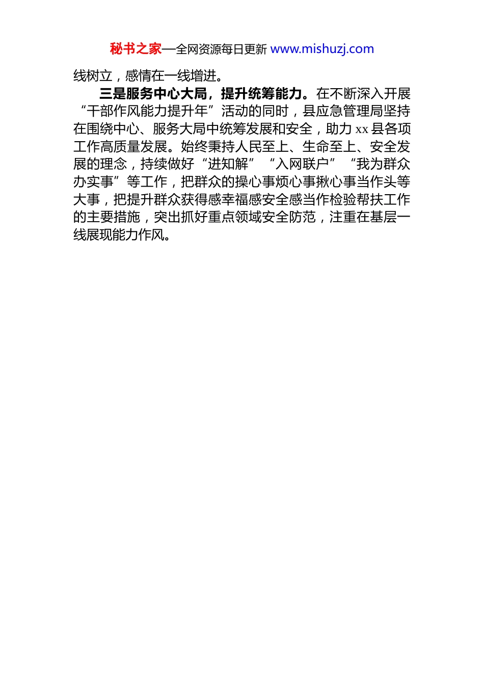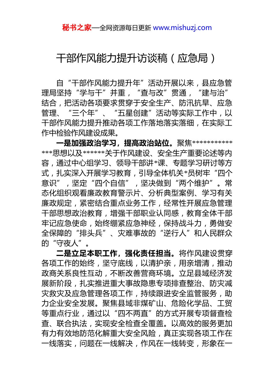秘书之家—全网资源每日更新 www.mishuzj.com干部作风能力提升访谈稿(应急局)自“干部作风能力提升年”活动开展以来,县应急管理局坚持“学与干”并重,“查与改”贯通,“建与治”结合,把活动各项要求贯穿于安全生产、防汛抗旱、应急管理、“三个年”、“五星创建”活动等实际工作中,以干部作风能力提升推动各项工作落地落实落细,在实际工作中检验作风建设成果。一是加强政治学习,提高政治站位。聚焦**************思想以及******关于作风建设、安全生产重要论述等内容,通过中心组学习、领导干部讲*课、专题学习研讨等方式,扎实深入开展学习教育,引导全体机关*员树牢“四个意识”,坚定“四个自信”,坚决做到“两个维护”。常态化组织观看廉政教育警示片、分析典型案例、学习有关廉政规定,紧密结合重点业务工作,经常性开展应急管理干部思想政治教育,增强干部职业认同感,教育全体干部牢记应急使命,始终绷紧应急神经,保持战斗力,勇做安全保障的“排头兵”、灾难事故的“逆行人”和人民群众的“守夜人”。二是立足本职工作,强化责任担当。将作风建设贯穿各项工作的始终,坚守底线,以清护亲,用亲增清,推动政商关系良性互动,不断改善营商环境。立足县域经济发展新阶段,扎实推进重大事故隐患专项排查整治、防灾减灾救灾及应急管理各项工作,持续跟进安全监管服务,助力企业安全发展。聚焦县域非煤矿山、危险化学品、工贸等重点行业,通过以“四不两直”的方式开展专项督查检查、联合执法,实现安全检查全覆盖。以高效的服务更加有力有效地防范化解重大安全风险,真正实现各项工作在一线落实,问题在一线解决,作风在一线转变,形象在一秘书之家—全网资源每日更新 www.mishuzj.com线树立,感情在一线增进。三是服务中心大局,提升统筹能力。在不断深入开展“干部作风能力提升年”活动的同时,县应急管理局坚持在围绕中心、服务大局中统筹发展和安全,助力 xx 县各项工作高质量发展。始终秉持人民至上、生命至上、安全发展的理念,持续做好“进知解”“入网联户”“我为群众办实事”等工作,把群众的操心事烦心事揪心事当作头等大事,把提升群众获得感幸福感安全感当作检验帮扶工作的主要措施,突出抓好重点领域安全防范,注重在基层一线展现能力作风。