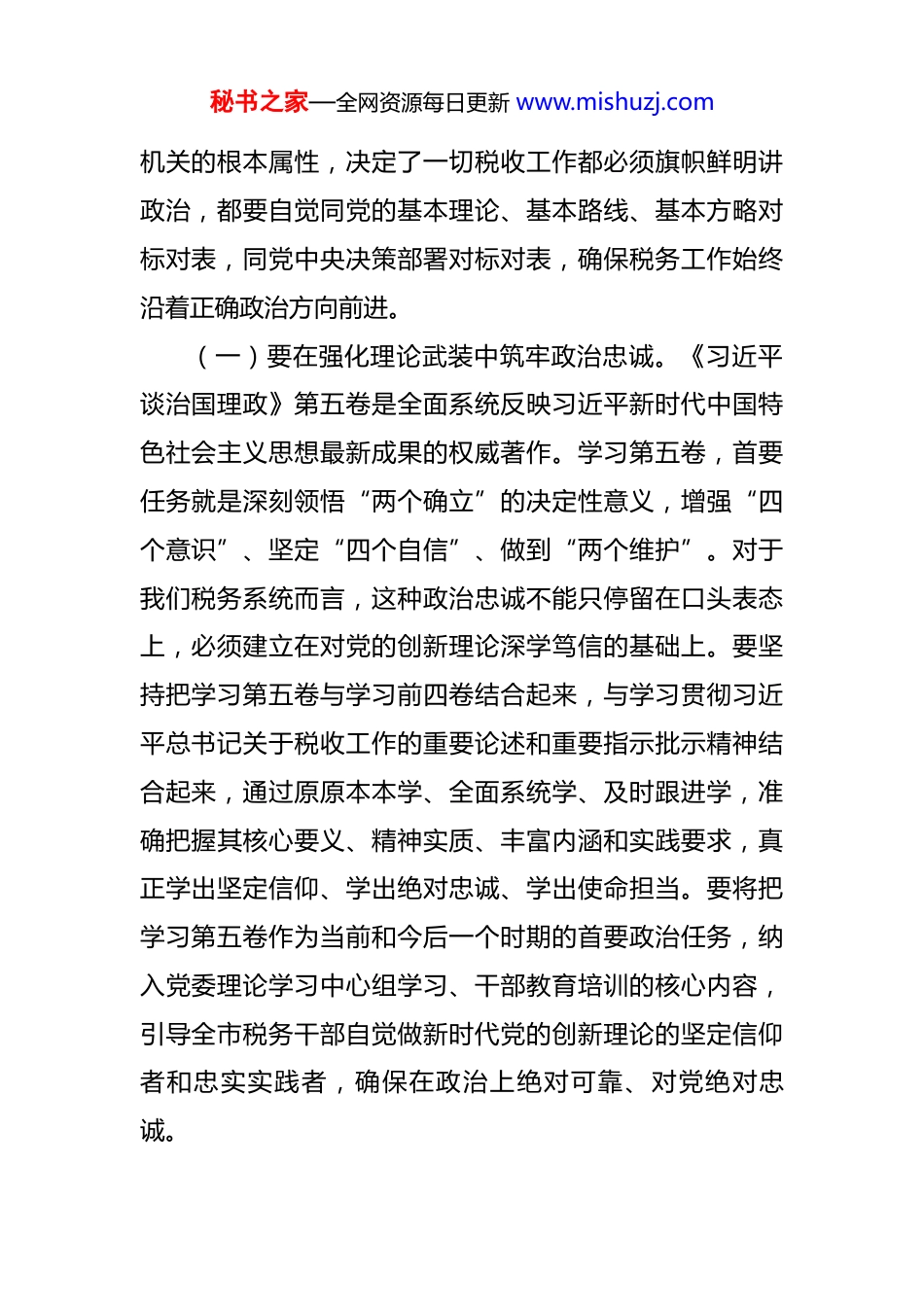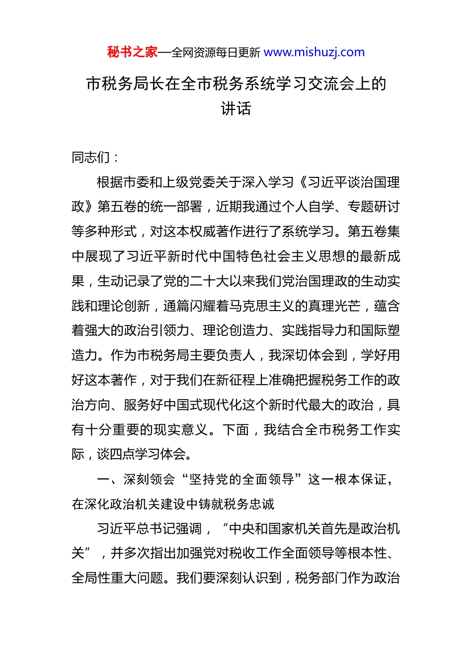 秘书之家—全网资源每日更新 www.mishuzj.com市税务局长在全市税务系统学习交流会上的讲话 同志们:根据市委和上级党委关于深入学习《习近平谈治国理政》第五卷的统一部署,近期我通过个人自学、专题研讨等多种形式,对这本权威著作进行了系统学习。第五卷集中展现了习近平新时代中国特色社会主义思想的最新成果,生动记录了党的二十大以来我们党治国理政的生动实践和理论创新,通篇闪耀着马克思主义的真理光芒,蕴含着强大的政治引领力、理论创造力、实践指导力和国际塑造力。作为市税务局主要负责人,我深切体会到,学好用好这本著作,对于我们在新征程上准确把握税务工作的政治方向、服务好中国式现代化这个新时代最大的政治,具有十分重要的现实意义。下面,我结合全市税务工作实际,谈四点学习体会。一、深刻领会“坚持党的全面领导”这一根本保证,在深化政治机关建设中铸就税务忠诚习近平总书记强调,“中央和国家机关首先是政治机关”,并多次指出加强党对税收工作全面领导等根本性、全局性重大问题。我们要深刻认识到,税务部门作为政治秘书之家—全网资源每日更新 www.mishuzj.com机关的根本属性,决定了一切税收工作都必须旗帜鲜明讲政治,都要自觉同党的基本理论、基本路线、基本方略对标对表,同党中央决策部署对标对表,确保税务工作始终沿着正确政治方向前进。(一)要在强化理论武装中筑牢政治忠诚。《习近平谈治国理政》第五卷是全面系统反映习近平新时代中国特色社会主义思想最新成果的权威著作。学习第五卷,首要任务就是深刻领悟“两个确立”的决定性意义,增强“四个意识”、坚定“四个自信”、做到“两个维护”。对于我们税务系统而言,这种政治忠诚不能只停留在口头表态上,必须建立在对党的创新理论深学笃信的基础上。要坚持把学习第五卷与学习前四卷结合起来,与学习贯彻习近平总书记关于税收工作的重要论述和重要指示批示精神结合起来,通过原原本本学、全面系统学、及时跟进学,准确把握其核心要义、精神实质、丰富内涵和实践要求,真正学出坚定信仰、学出绝对忠诚、学出使命担当。要将把学习第五卷作为当前和今后一个时期的首要政治任务,纳入党委理论学习中心组学习、干部教育培训的核心内容,引导全市税务干部自觉做新时代党的创新理论的坚定信仰者和忠实实践者,确保在政治上绝对可靠、对党绝对忠诚。秘书之家—全网资源每日更新 www.mishuzj.com(二)要在完善体制机制中落实党的领导。坚持党的全面领导必须有健全的制度机制作保证。要进一步健全和完善党委工作规则和议事决策程序,确保党委在把方向、管大局、保落实上发挥领导作用。要坚决迅速、一贯到底地抓好习近平总书记重要指示批示精神以及党中央决策部署在税务领域的贯彻落实,健全督查问责机制,确保政令畅通、令行禁止。要持续深化政治机关意识教育,反复强调税务部门实行“一条线”管理,把党的政治建设摆在首位,坚决走好践行“两个维护”的第一方阵。近(三)要在应对风险挑战中检验政治能力。当前,税收工作面临的环境和形势具有不确定性,各种风险挑战交织叠加。越是任务艰巨、形势复杂,越要加强党的全面领导,越要发挥政治上的定力和优势。要不断增强政治判断力、政治领悟力、政治执行力,善于从政治高度分析税收经济形势,精准识别税收工作中存在的各类风险,特别是要坚守组织收入底线,坚持依法依规征税收费,不折不扣落实减税降费政策,坚决不征收“过头税费”;要坚守税费安全底线,深化风险导向下的税务监管,有效打击涉税违法行为;要坚守廉洁从税底线,构建一体化综合监督体系。要大力发扬斗争精神,面对大是大非敢于亮剑,面对风险挑战敢于迎难而上,面对矛盾难题敢于挺身而出,在秘书之家—全网资源每日更新 www.mishuzj.com应对重大挑战、抵御重大风险、克服重大阻力、解决重大矛盾中,锤炼税务干部的政治品格,展现税务部门的政治担当。二、准确把握“以人民为中心”这一根本立场,在践行初心使命中优化税费服务习近平总书记深刻阐述了“以人民为中心的发展思想”,在第五卷中再次强调“让每一个中国人都过上美好生活”“让现代化成果惠及全体人民”。这是中国共...