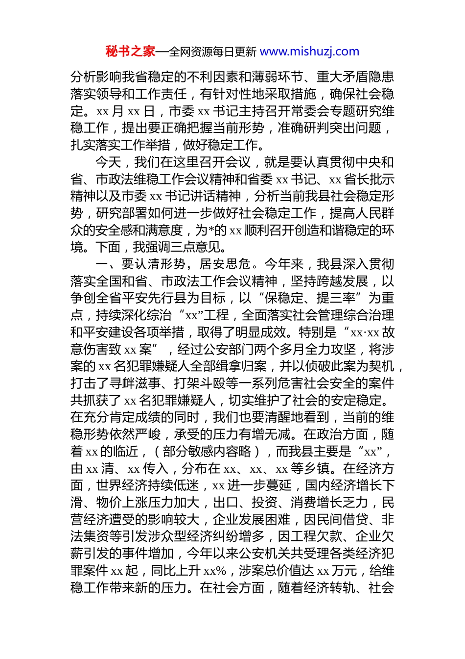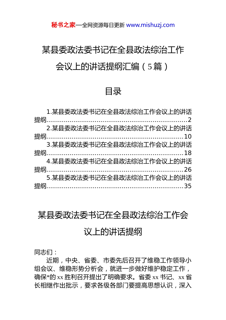 秘书之家—全网资源每日更新 www.mishuzj.com某县委政法委书记在全县政法综治工作会议上的讲话提纲汇编(5 篇)目录1.某县委政法委书记在全县政法综治工作会议上的讲话提纲.........................................................................22.某县委政法委书记在全县政法综治工作会议上的讲话提纲.......................................................................103.某县委政法委书记在全县政法综治工作会议上的讲话提纲.......................................................................184.某县委政法委书记在全县政法综治工作会议上的讲话提纲.......................................................................265.某县委政法委书记在全县政法综治工作会议上的讲话提纲.......................................................................35某县委政法委书记在全县政法综治工作会议上的讲话提纲同志们:近期,中央、省委、市委先后召开了维稳工作领导小组会议、维稳形势分析会,就进一步做好维护稳定工作,确保*的 xx 胜利召开提出了明确要求。省委 xx 书记、xx 省长相继作出批示,要求各级各部门要提高思想认识,深入秘书之家—全网资源每日更新 www.mishuzj.com分析影响我省稳定的不利因素和薄弱环节、重大矛盾隐患落实领导和工作责任,有针对性地采取措施,确保社会稳定。xx 月 xx 日,市委 xx 书记主持召开常委会专题研究维稳工作,提出要正确把握当前形势,准确研判突出问题,扎实落实工作举措,做好稳定工作。今天,我们在这里召开会议,就是要认真贯彻中央和省、市政法维稳工作会议精神和省委 xx 书记、xx 省长批示精神以及市委 xx 书记讲话精神,分析当前我县社会稳定形势,研究部署如何进一步做好社会稳定工作,提高人民群众的安全感和满意度,为*的 xx 顺利召开创造和谐稳定的环境。下面,我强调三点意见。一、要认清形势,居安思危。今年来,我县深入贯彻落实全国和省、市政法工作会议精神,坚持跨越发展,以争创全省平安先行县为目标,以“保稳定、提三率”为重点,持续深化综治“xx”工程,全面落实社会管理综合治理和平安建设各项举措,取得了明显成效。特别是“xx·xx 故意伤害致 xx 案”,经过公安部门两个多月全力攻坚,将涉案的 xx 名犯罪嫌疑人全部缉拿归案,并以侦破此案为契机,打击了寻衅滋事、打架斗殴等一系列危害社会安全的案件共抓获了 xx 名犯罪嫌疑人,切实维护了社会的安定稳定。在充分肯定成绩的同时,我们也要清醒地看到,当前的维稳形势依然严峻,承受的压力有增无减。在政治方面,随着 xx 的临近,(部分敏感内容略),而我县主要是“xx”,由 xx 清、xx 传入,分布在 xx、xx、xx 等乡镇。在经济方面,世界经济持续低迷,xx 进一步蔓延,国内经济增长下滑、物价上涨压力加大,出口、投资、消费增长乏力,民营经济遭受的影响较大,企业发展困难,因民间借贷、非法集资等引发涉众型经济纠纷增多,因工程欠款、企业欠薪引发的事件增加,今年以来公安机关共受理各类经济犯罪案件 xx 起,同比上升 xx%,涉案总价值达 xx 万元,给维稳工作带来新的压力。在社会方面,随着经济转轨、社会秘书之家—全网资源每日更新 www.mishuzj.com转型的加速和深化,各种社会矛盾集中显现,因征地拆迁矿产开发、山林利用、企业改制、社会保障、环境污染等引发了大量矛盾,社会潜藏诸多风险。xx-xx 月,全县信访部门受理群众来信来访 xx 件(人),同比上升 xx.xx%。另外,各种利益群体特别是 xx 群体借机表达诉求,xx 访、xx访和 xx 上访更加强烈。在治安方面,虽然各类刑事案件发案率同比均有下降,但仍在高位运行,八类犯罪案件有所上升,今年以来已发案 xx 起,同比上升 xx.xx%;xx 品犯罪形势严峻,贩 xx 刑事案件立案 xx 起,同比上升 xx%,查处涉 xx 行政案件 xx 起,同比上升 xx.xx%;赌博等违法问题依然突出,已查处各类赌博治安案件 xx 起,治安处罚 xx 人,查 处 案 数 、 人 数 分 别 占 治 安 发 案 、 查 处 人 ...