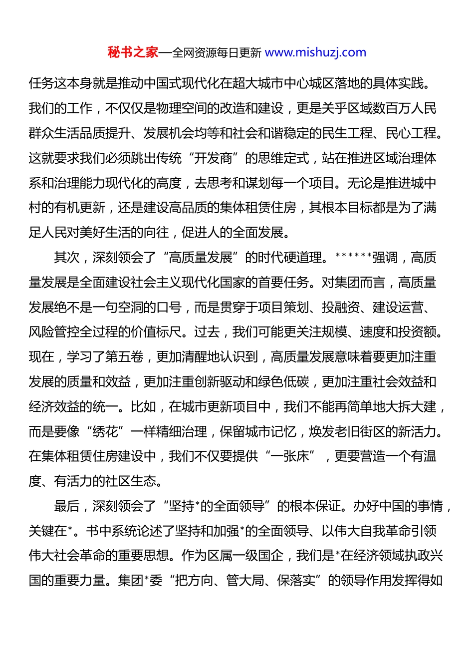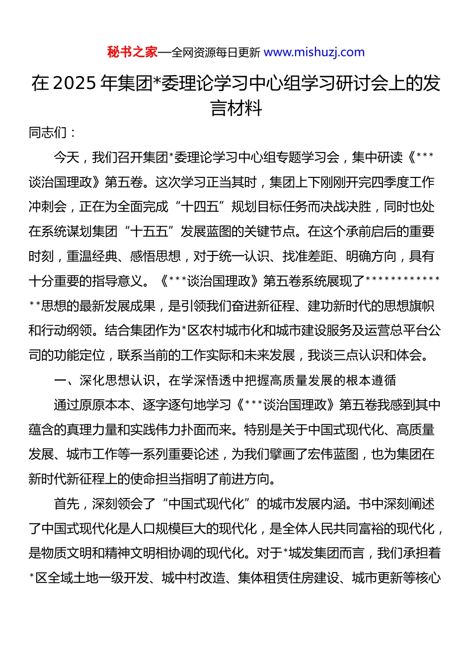秘书之家—全网资源每日更新 www.mishuzj.com在 2025 年集团*委理论学习中心组学习研讨会上的发言材料同志们:今天,我们召开集团*委理论学习中心组专题学习会,集中研读《***谈治国理政》第五卷。这次学习正当其时,集团上下刚刚开完四季度工作冲刺会,正在为全面完成“十四五”规划目标任务而决战决胜,同时也处在系统谋划集团“十五五”发展蓝图的关键节点。在这个承前启后的重要时刻,重温经典、感悟思想,对于统一认识、找准差距、明确方向,具有十分重要的指导意义。《***谈治国理政》第五卷系统展现了**************思想的最新发展成果,是引领我们奋进新征程、建功新时代的思想旗帜和行动纲领。结合集团作为*区农村城市化和城市建设服务及运营总平台公司的功能定位,联系当前的工作实际和未来发展,我谈三点认识和体会。一、深化思想认识,在学深悟透中把握高质量发展的根本遵循通过原原本本、逐字逐句地学习《***谈治国理政》第五卷我感到其中蕴含的真理力量和实践伟力扑面而来。特别是关于中国式现代化、高质量发展、城市工作等一系列重要论述,为我们擘画了宏伟蓝图,也为集团在新时代新征程上的使命担当指明了前进方向。首先,深刻领会了“中国式现代化”的城市发展内涵。书中深刻阐述了中国式现代化是人口规模巨大的现代化,是全体人民共同富裕的现代化,是物质文明和精神文明相协调的现代化。对于*城发集团而言,我们承担着*区全域土地一级开发、城中村改造、集体租赁住房建设、城市更新等核心秘书之家—全网资源每日更新 www.mishuzj.com任务这本身就是推动中国式现代化在超大城市中心城区落地的具体实践。我们的工作,不仅仅是物理空间的改造和建设,更是关乎区域数百万人民群众生活品质提升、发展机会均等和社会和谐稳定的民生工程、民心工程。这就要求我们必须跳出传统“开发商”的思维定式,站在推进区域治理体系和治理能力现代化的高度,去思考和谋划每一个项目。无论是推进城中村的有机更新,还是建设高品质的集体租赁住房,其根本目标都是为了满足人民对美好生活的向往,促进人的全面发展。其次,深刻领会了“高质量发展”的时代硬道理。******强调,高质量发展是全面建设社会主义现代化国家的首要任务。对集团而言,高质量发展绝不是一句空洞的口号,而是贯穿于项目策划、投融资、建设运营、风险管控全过程的价值标尺。过去,我们可能更关注规模、速度和投资额。现在,学习了第五卷,更加清醒地认识到,高质量发展意味着要更加注重发展的质量和效益,更加注重创新驱动和绿色低碳,更加注重社会效益和经济效益的统一。比如,在城市更新项目中,我们不能再简单地大拆大建,而是要像“绣花”一样精细治理,保留城市记忆,焕发老旧街区的新活力。在集体租赁住房建设中,我们不仅要提供“一张床”,更要营造一个有温度、有活力的社区生态。最后,深刻领会了“坚持*的全面领导”的根本保证。办好中国的事情,关键在*。书中系统论述了坚持和加强*的全面领导、以伟大自我革命引领伟大社会革命的重要思想。作为区属一级国企,我们是*在经济领域执政兴国的重要力量。集团*委“把方向、管大局、保落实”的领导作用发挥得如秘书之家—全网资源每日更新 www.mishuzj.com何,直接关系到区委、区政府的重大决策部署能否落地生根,关系到国有资产能否保值增值,关系到集团能否行稳致远。尤其是在当前业务领域不断拓展、项目类型日趋复杂、内外部风险挑战增多的新形势下,唯有坚持不懈地用*的创新理论武装头脑,持续加强*的政治建设,才能确保集团始终沿着正确的政治方向前进。二、坚持问题导向,在对标对表中查找存在的差距与不足以《***谈治国理政》第五卷中的新思想、新观点、新论断为镜,反躬自省,深刻检视集团在思想观念、工作方法、能力作风等方面存在的差距。这不是为了否定成绩,而是为了更好地走向未来。我认为,主要有以下三个方面的“不适应”。一是在战略思维和前瞻布局上存在“不适应”。对标“以中国式现代化全面推进中华民族伟大复兴”的宏大叙事,审视我们的“十五五”规划初步构想,感觉站位还不够高,格局还不够大。我们更多的是从完成区委、区政府...