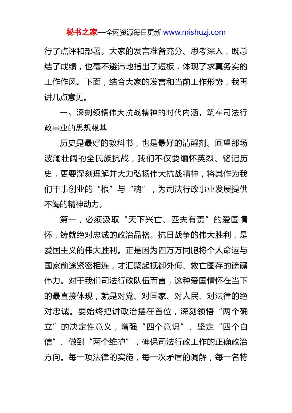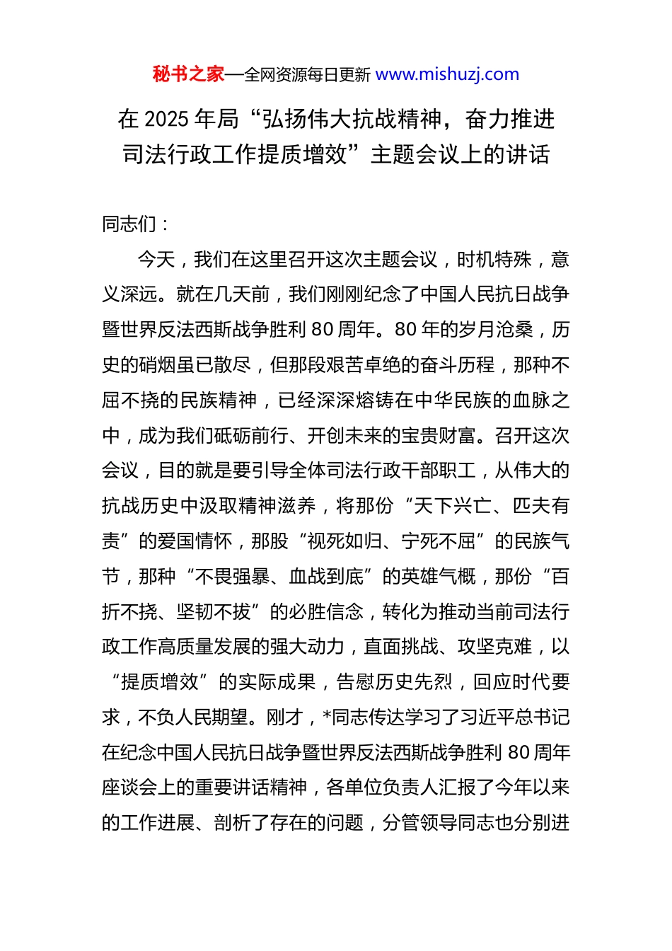 秘书之家—全网资源每日更新 www.mishuzj.com在 2025 年局“弘扬伟大抗战精神,奋力推进司法行政工作提质增效”主题会议上的讲话 同志们:今天,我们在这里召开这次主题会议,时机特殊,意义深远。就在几天前,我们刚刚纪念了中国人民抗日战争暨世界反法西斯战争胜利 80 周年。80 年的岁月沧桑,历史的硝烟虽已散尽,但那段艰苦卓绝的奋斗历程,那种不屈不挠的民族精神,已经深深熔铸在中华民族的血脉之中,成为我们砥砺前行、开创未来的宝贵财富。召开这次会议,目的就是要引导全体司法行政干部职工,从伟大的抗战历史中汲取精神滋养,将那份“天下兴亡、匹夫有责”的爱国情怀,那股“视死如归、宁死不屈”的民族气节,那种“不畏强暴、血战到底”的英雄气概,那份“百折不挠、坚韧不拔”的必胜信念,转化为推动当前司法行政工作高质量发展的强大动力,直面挑战、攻坚克难,以“提质增效”的实际成果,告慰历史先烈,回应时代要求,不负人民期望。刚才,*同志传达学习了习近平总书记在纪念中国人民抗日战争暨世界反法西斯战争胜利 80 周年座谈会上的重要讲话精神,各单位负责人汇报了今年以来的工作进展、剖析了存在的问题,分管领导同志也分别进秘书之家—全网资源每日更新 www.mishuzj.com行了点评和部署。大家的发言准备充分、思考深入,既总结了成绩,也毫不避讳地指出了短板,体现了求真务实的工作作风。下面,结合大家的发言和当前工作形势,我再讲几点意见。一、深刻领悟伟大抗战精神的时代内涵,筑牢司法行政事业的思想根基历史是最好的教科书,也是最好的清醒剂。回望那场波澜壮阔的全民族抗战,我们不仅要缅怀英烈、铭记历史,更要深刻理解并大力弘扬伟大抗战精神,将其作为我们干事创业的“根”与“魂”,为司法行政事业发展提供不竭的精神动力。第一,必须汲取“天下兴亡、匹夫有责”的爱国情怀,铸就绝对忠诚的政治品格。抗日战争的伟大胜利,是爱国主义的伟大胜利。正是因为四万万同胞将个人命运与国家前途紧密相连,才汇聚起抵御外侮、救亡图存的磅礴伟力。对于我们司法行政队伍而言,这种爱国情怀在当下的最直接体现,就是对党、对国家、对人民、对法律的绝对忠诚。要始终把讲政治摆在首位,深刻领悟“两个确立”的决定性意义,增强“四个意识”、坚定“四个自信”、做到“两个维护”,确保司法行政工作的正确政治方向。每一项法律的实施,每一次矛盾的调解,每一名特秘书之家—全网资源每日更新 www.mishuzj.com殊人员的管理,都不仅仅是业务工作,更是巩固党的执政基础、维护国家长治久安的政治任务。必须把忠诚刻在心上、融入血脉、见于行动,做到在大是大非面前旗帜鲜明,在风浪考验面前无所畏惧,在各种诱惑面前立场坚定。第二,必须弘扬“视死如归、宁死不屈”的民族气节,淬炼敢于担当的履职风骨。面对穷凶极恶的侵略者,无数中华儿女抱定“誓与山河共存亡”的决心,用血肉之躯筑起了新的长城。这种不屈的风骨,是中华民族精神的脊梁。新时代的司法行政工作,虽然没有了战火硝烟,但同样面临着各种风险挑战。法治建设进入深水区,改革任务艰巨繁重;社会矛盾复杂多样,调处化解难度加大;行政执法监督面临的阻力和压力前所未有。这就要求我们必须具备敢于担当的铁肩膀。在推进法治督察问题整改时,要敢于动真碰硬,不讲情面、不打折扣;在处理行政复议诉讼案件时,要敢于坚持原则,依法纠错,维护公平正义;在日常工作中,要敢于直面矛盾,迎难而上,不做“太平官”,不当“老好人”。要将这种民族气节内化为履职尽责的勇气和底气,在困难面前不退缩,在责任面前不推诿。第三,必须传承“不畏强暴、血战到底”的英雄气秘书之家—全网资源每日更新 www.mishuzj.com概,砥砺善于斗争的过硬本领。抗战的胜利,是斗争出来的。面对强敌,我们党领导人民以灵活机动的战略战术,开展了艰苦卓绝的斗争。当前,我们推进全面依法治国,同样是一场深刻的社会革命,必然会遇到各种阻力。与不作为、乱作为的行政行为作斗争;与部分群众陈旧的法律观念作斗争;与社会上损害公平正义的现象作斗争;与自身队伍中可能存在的形式主义、官僚主义作斗争。这种斗争...
