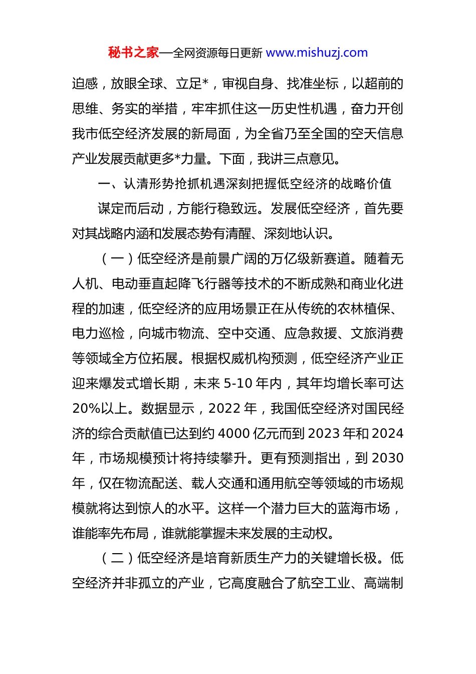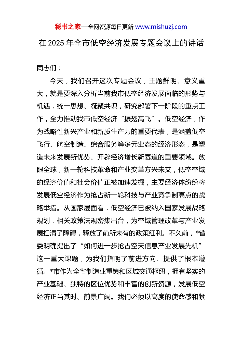 秘书之家—全网资源每日更新 www.mishuzj.com在 2025 年全市低空经济发展专题会议上的讲话 同志们:今天,我们召开这次专题会议,主题鲜明、意义重大,就是要深入分析当前我市低空经济发展面临的形势与机遇,统一思想、凝聚共识,研究部署下一阶段的重点工作,全力推动我市低空经济“振翅高飞”。低空经济,作为战略性新兴产业和新质生产力的重要代表,是涵盖低空飞行、航空制造、综合服务等多元业态的经济形态,是塑造未来发展新优势、开辟经济增长新赛道的重要领域。放眼全球,新一轮科技革命和产业变革方兴未艾,低空空域的经济价值和社会价值正被加速发掘,主要经济体纷纷将发展低空经济作为抢占新一轮科技与产业竞争制高点的战略举措。从国家层面看,低空经济已被纳入国家发展战略规划,相关政策法规密集出台,为空域管理改革与产业发展扫清了障碍,释放了前所未有的政策红利。不久前,*省委明确提出了“如何进一步抢占空天信息产业发展先机”这一重大课题,为我们指明了前进方向、提供了根本遵循。*市作为全省制造业重镇和区域交通枢纽,拥有坚实的产业基础、独特的区位优势和丰富的创新资源,发展低空经济正当其时、前景广阔。我们必须以高度的使命感和紧秘书之家—全网资源每日更新 www.mishuzj.com迫感,放眼全球、立足*,审视自身、找准坐标,以超前的思维、务实的举措,牢牢抓住这一历史性机遇,奋力开创我市低空经济发展的新局面,为全省乃至全国的空天信息产业发展贡献更多*力量。下面,我讲三点意见。一、认清形势抢抓机遇深刻把握低空经济的战略价值谋定而后动,方能行稳致远。发展低空经济,首先要对其战略内涵和发展态势有清醒、深刻地认识。(一)低空经济是前景广阔的万亿级新赛道。随着无人机、电动垂直起降飞行器等技术的不断成熟和商业化进程的加速,低空经济的应用场景正在从传统的农林植保、电力巡检,向城市物流、空中交通、应急救援、文旅消费等领域全方位拓展。根据权威机构预测,低空经济产业正迎来爆发式增长期,未来 5-10 年内,其年均增长率可达20%以上。数据显示,2022 年,我国低空经济对国民经济的综合贡献值已达到约 4000 亿元而到 2023 年和 2024年,市场规模预计将持续攀升。更有预测指出,到 2030年,仅在物流配送、载人交通和通用航空等领域的市场规模就将达到惊人的水平。这样一个潜力巨大的蓝海市场,谁能率先布局,谁就能掌握未来发展的主动权。(二)低空经济是培育新质生产力的关键增长极。低空经济并非孤立的产业,它高度融合了航空工业、高端制秘书之家—全网资源每日更新 www.mishuzj.com造、人工智能、大数据、物联网、新材料和新能源等众多前沿科技,是典型的技术密集型和资本密集型产业。发展低空经济,能够有效带动一系列高新技术产业的协同进步,促进产业链、创新链、资金链、人才链的深度融合。例如,在*市,去年全市通用航空和无人驾驶航空制造业产值已接近 20 亿元,展现了良好的发展势头。对标*、*等先进城市,其低空经济与空天产业在 2024 年均实现了超过27%的同比增长这充分证明了其作为经济增长新引擎的强大动能。我们必须将低空经济作为推动产业转型升级、培育新质生产力的重要抓手,加速形成新的经济增长点。(三)低空经济是提升城市能级与治理水平的有效途径。低空飞行网络的构建,将极大提升城市交通的立体化、智慧化水平,有效缓解地面交通压力,提高运行效率。在城市管理方面,无人机在环境监测、应急指挥、安全巡防等领域的应用,能够显著提升城市治理的精细化和智能化水平。在公共服务方面,空中医疗急救、物资投送等能够突破地理限制,为市民提供更高效、更便捷的服务。可以说,低空经济的发展水平,将成为衡量一个城市现代化程度和核心竞争力的重要标志。在肯定机遇和潜力的同时,我们也要清醒地看到自身存在的短板和面临的挑战。一是产业体系尚不完善。虽然秘书之家—全网资源每日更新 www.mishuzj.com我们有制造业基础,但在航空核心零部件、高端整机制造、飞控系统等关键环节,本土企业的竞争力仍有待提升,产业链存在“断点”“堵点”。二是场景应用亟待拓展。目前的应用多集中在...