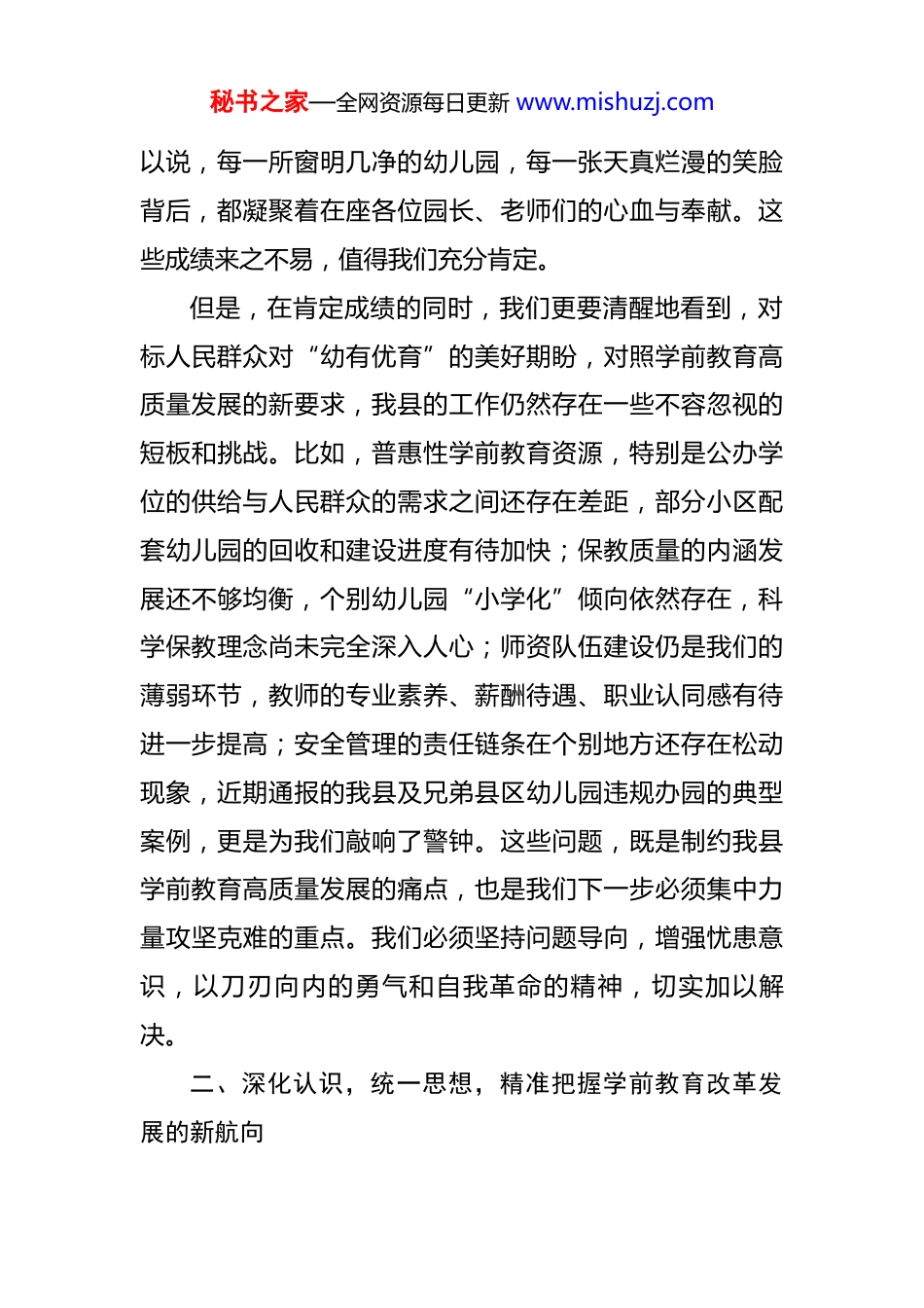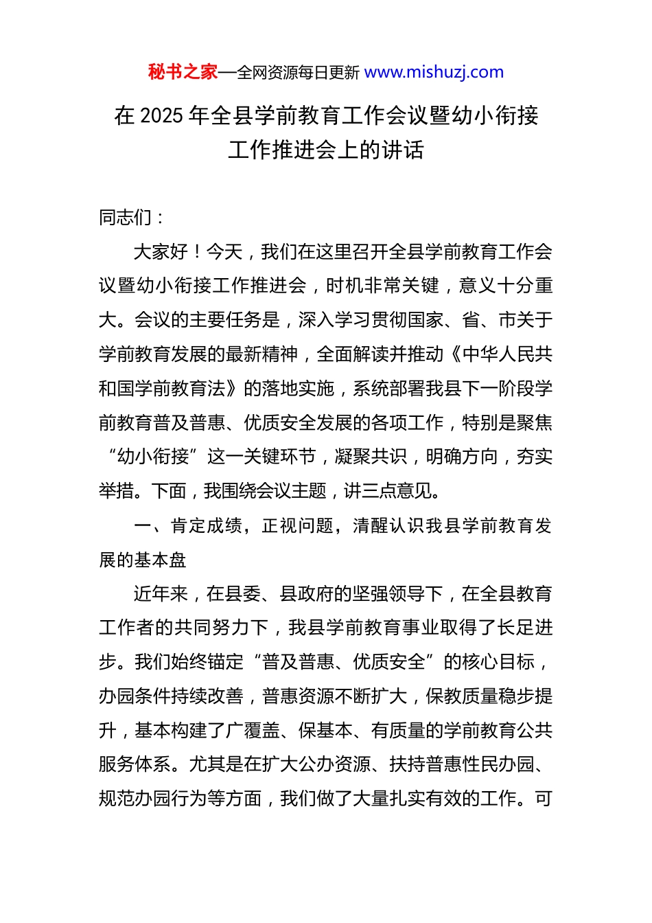 秘书之家—全网资源每日更新 www.mishuzj.com在 2025 年全县学前教育工作会议暨幼小衔接工作推进会上的讲话 同志们:大家好!今天,我们在这里召开全县学前教育工作会议暨幼小衔接工作推进会,时机非常关键,意义十分重大。会议的主要任务是,深入学习贯彻国家、省、市关于学前教育发展的最新精神,全面解读并推动《中华人民共和国学前教育法》的落地实施,系统部署我县下一阶段学前教育普及普惠、优质安全发展的各项工作,特别是聚焦“幼小衔接”这一关键环节,凝聚共识,明确方向,夯实举措。下面,我围绕会议主题,讲三点意见。一、肯定成绩,正视问题,清醒认识我县学前教育发展的基本盘近年来,在县委、县政府的坚强领导下,在全县教育工作者的共同努力下,我县学前教育事业取得了长足进步。我们始终锚定“普及普惠、优质安全”的核心目标,办园条件持续改善,普惠资源不断扩大,保教质量稳步提升,基本构建了广覆盖、保基本、有质量的学前教育公共服务体系。尤其是在扩大公办资源、扶持普惠性民办园、规范办园行为等方面,我们做了大量扎实有效的工作。可秘书之家—全网资源每日更新 www.mishuzj.com以说,每一所窗明几净的幼儿园,每一张天真烂漫的笑脸背后,都凝聚着在座各位园长、老师们的心血与奉献。这些成绩来之不易,值得我们充分肯定。但是,在肯定成绩的同时,我们更要清醒地看到,对标人民群众对“幼有优育”的美好期盼,对照学前教育高质量发展的新要求,我县的工作仍然存在一些不容忽视的短板和挑战。比如,普惠性学前教育资源,特别是公办学位的供给与人民群众的需求之间还存在差距,部分小区配套幼儿园的回收和建设进度有待加快;保教质量的内涵发展还不够均衡,个别幼儿园“小学化”倾向依然存在,科学保教理念尚未完全深入人心;师资队伍建设仍是我们的薄弱环节,教师的专业素养、薪酬待遇、职业认同感有待进一步提高;安全管理的责任链条在个别地方还存在松动现象,近期通报的我县及兄弟县区幼儿园违规办园的典型案例,更是为我们敲响了警钟。这些问题,既是制约我县学前教育高质量发展的痛点,也是我们下一步必须集中力量攻坚克难的重点。我们必须坚持问题导向,增强忧患意识,以刀刃向内的勇气和自我革命的精神,切实加以解决。二、深化认识,统一思想,精准把握学前教育改革发展的新航向秘书之家—全网资源每日更新 www.mishuzj.com学前教育是终身学习的开端,是国民教育体系的重要组成部分。办好学前教育,关系到亿万儿童的健康成长,关系到国家和民族的未来。进入新发展阶段,党和国家对学前教育的重视程度前所未有,人民群众对学前教育的期盼前所未有。我们必须站位全局,深化认识,把思想和行动统一到中央和省市的决策部署上来。(一)深刻领会《中华人民共和国学前教育法》的重大意义。今年 6 月 1 日正式施行的《中华人民共和国学前教育法》,是我国教育法治建设进程中的一座重要里程碑。它首次以国家法律的形式,明确了学前教育是国民教育体系的重要组成部分,确立了其公益普惠的基本属性,为学前教育的改革发展提供了最坚实的法治保障。刚才,学职股的*同志已经带领大家进行了专题学习。我要强调的是,学习法律,绝不能停留在纸面上,关键在于内化于心、外化于行。全县各级各类幼儿园、局机关各股室,都要把学习宣传和贯彻落实好这部法律作为当前和今后一个时期的重要政治任务。要准确把握法律的核心要义,特别是关于政府职责、幼儿园设立与管理、保育与教育、教师队伍建设以及投入与保障等方面的刚性规定。法律明确要求大力发展普惠性学前教育,纠正“小学化”倾向,并禁止利用财政性经费等举办营利性幼儿园,确保公办幼儿园秘书之家—全网资源每日更新 www.mishuzj.com性质不被改变。这些都是我们工作中必须坚守的底线和红线。(二)要准确把握逐步推行免费学前教育的政策导向。计财股的*同志刚刚解读了国家和省关于逐步推行免费学前教育的政策。我们要清楚地认识到,推进免费学前教育,是减轻家庭养育负担、促进教育公平、彰显社会进步的重要举措。根据《中华人民共和国学前教育法》的规定,国家鼓励和支持有条件的地方根据经济社...