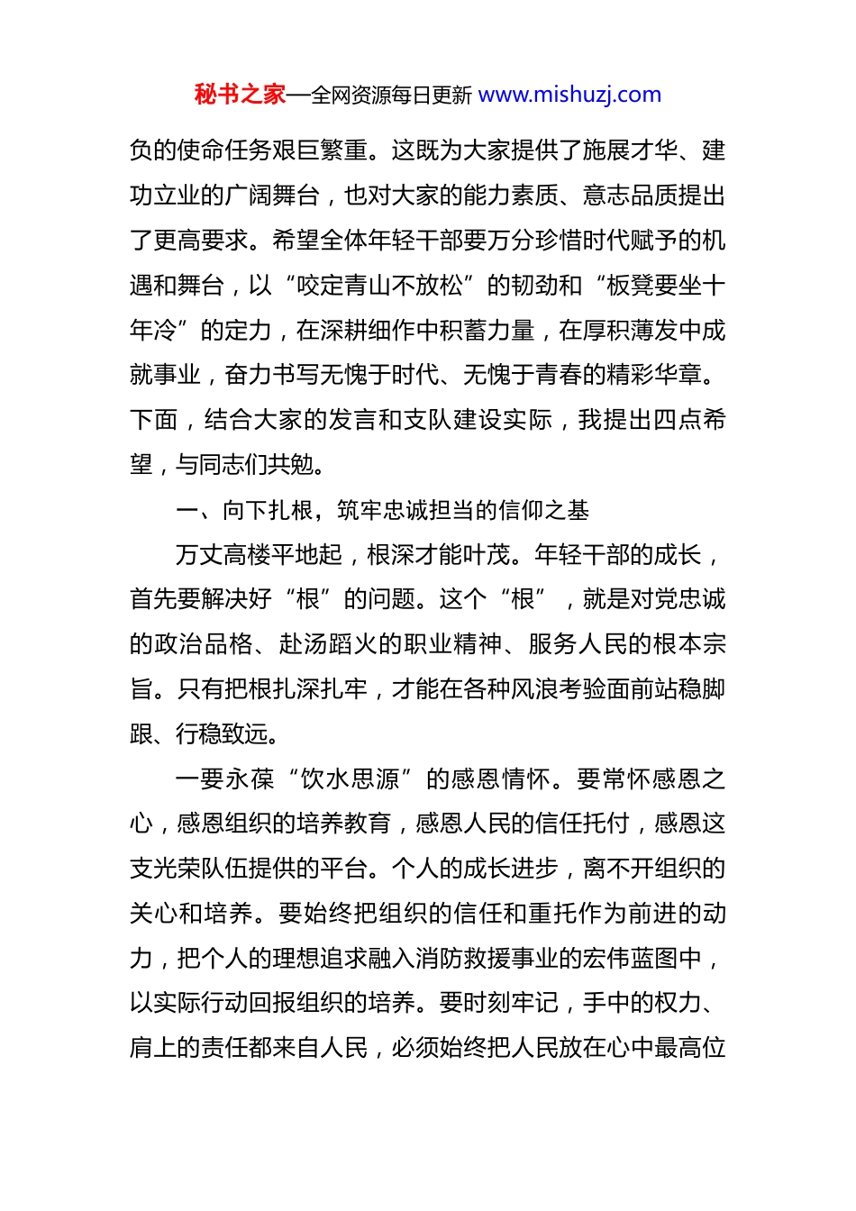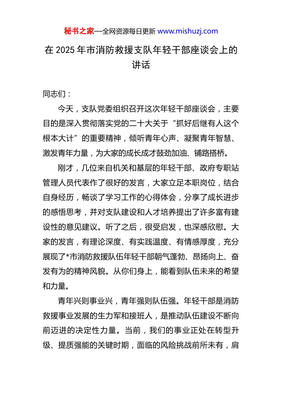 秘书之家—全网资源每日更新 www.mishuzj.com在 2025 年市消防救援支队年轻干部座谈会上的讲话 同志们:今天,支队党委组织召开这次年轻干部座谈会,主要目的是深入贯彻落实党的二十大关于“抓好后继有人这个根本大计”的重要精神,倾听青年心声、凝聚青年智慧、激发青年力量,为大家的成长成才鼓劲加油、铺路搭桥。刚才,几位来自机关和基层的年轻干部、政府专职站管理人员代表作了很好的发言,大家立足本职岗位,结合自身经历,畅谈了学习工作的心得体会,分享了成长进步的感悟思考,并对支队建设和人才培养提出了许多富有建设性的意见建议。听了之后,很受启发,也深感欣慰。大家的发言,有理论深度、有实践温度、有情感厚度,充分展现了*市消防救援队伍年轻干部朝气蓬勃、昂扬向上、奋发有为的精神风貌。从你们身上,能看到队伍未来的希望和力量。青年兴则事业兴,青年强则队伍强。年轻干部是消防救援事业发展的生力军和接班人,是推动队伍建设不断向前迈进的决定性力量。当前,我们的事业正处在转型升级、提质强能的关键时期,面临的风险挑战前所未有,肩秘书之家—全网资源每日更新 www.mishuzj.com负的使命任务艰巨繁重。这既为大家提供了施展才华、建功立业的广阔舞台,也对大家的能力素质、意志品质提出了更高要求。希望全体年轻干部要万分珍惜时代赋予的机遇和舞台,以“咬定青山不放松”的韧劲和“板凳要坐十年冷”的定力,在深耕细作中积蓄力量,在厚积薄发中成就事业,奋力书写无愧于时代、无愧于青春的精彩华章。下面,结合大家的发言和支队建设实际,我提出四点希望,与同志们共勉。一、向下扎根,筑牢忠诚担当的信仰之基万丈高楼平地起,根深才能叶茂。年轻干部的成长,首先要解决好“根”的问题。这个“根”,就是对党忠诚的政治品格、赴汤蹈火的职业精神、服务人民的根本宗旨。只有把根扎深扎牢,才能在各种风浪考验面前站稳脚跟、行稳致远。一要永葆“饮水思源”的感恩情怀。要常怀感恩之心,感恩组织的培养教育,感恩人民的信任托付,感恩这支光荣队伍提供的平台。个人的成长进步,离不开组织的关心和培养。要始终把组织的信任和重托作为前进的动力,把个人的理想追求融入消防救援事业的宏伟蓝图中,以实际行动回报组织的培养。要时刻牢记,手中的权力、肩上的责任都来自人民,必须始终把人民放在心中最高位秘书之家—全网资源每日更新 www.mishuzj.com置,在每一次警铃骤响的逆行中、在每一次赴汤蹈火的救援中,践行“人民消防为人民”的庄严承诺。二要永怀“如履薄冰”的敬畏情怀。心存敬畏,方能行有所止。要敬畏使命,深刻认识到消防救援工作“养兵千日、用兵千日”的特殊性,每一次出动都关系到人民群众的生命财产安全,容不得丝毫懈怠和马虎。要敬畏法纪,严格遵守国家的法律法规和队伍的条令条例,把纪律规矩挺在前面,做到知敬畏、存戒惧、守底线。要敬畏生命,无论是对待救援对象,还是对待身边的战友,都要以高度的责任心和严谨的科学态度,确保救援行动的安全高效。三要永怀“视若归家”的融入情怀。队伍是家,战友是亲人。要主动融入集体,把个人发展与队伍建设紧密相连,在集体中找准定位、发挥作用。去年以来,全市队伍共接处警 1685 起,营救疏散群众 313 人,抢救保护财产价值超过 1882 万元。这些成绩的取得,不是靠某一个人的单打独斗,而是全体指战员团结协作、共同奋斗的结果。特别是在处置*小区“1·18”高层住宅火灾、*高速“9·4”危化品运输车辆侧翻泄漏事故等急难险重任务中,正是依靠集体主义精神和无间的团队配合,才一次次化险为夷,守护了一方平安。希望大家在红色教育中淬炼思想,在破解秘书之家—全网资源每日更新 www.mishuzj.com难题中磨砺本领,在应对挑战中锤炼意志,努力成长为让组织放心、让人民满意的行家里手。二、向上生长,锻造能打胜仗的过硬本领消防救援是一门科学,也是一门艺术,专业性、实战性极强。新时代的消防救援任务呈现出多样化、复杂化的新特点,对干部的专业素养和综合能力提出了前所未有的挑战。只有不断向上生长,练就过硬本领,才能在关键时刻拉得出、冲得上、打得赢。一要立定“干就...