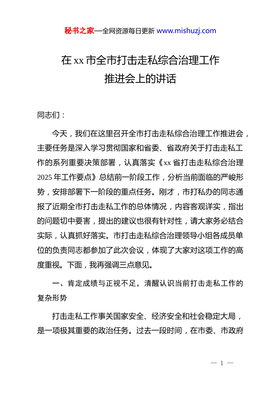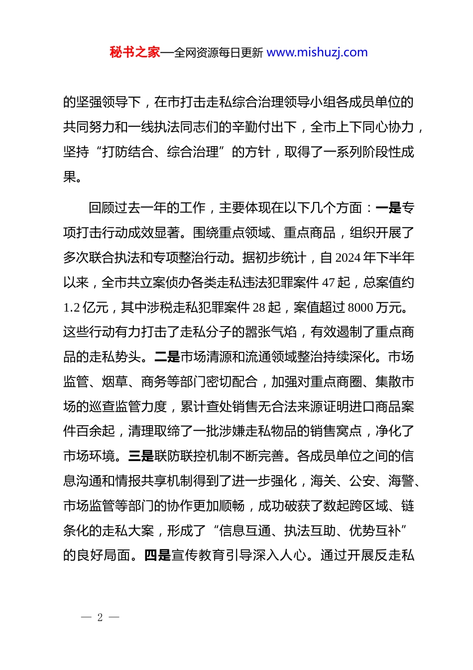 秘书之家—全网资源每日更新 www.mishuzj.com在 xx 市全市打击走私综合治理工作推进会上的讲话同志们:今天,我们在这里召开全市打击走私综合治理工作推进会,主要任务是深入学习贯彻国家和省委、省政府关于打击走私工作的系列重要决策部署,认真落实《xx 省打击走私综合治理2025 年工作要点》总结前一阶段工作,分析当前面临的严峻形势,安排部署下一阶段的重点任务。刚才,市打私办的同志通报了近期全市打击走私工作的总体情况,内容客观详实,指出的问题切中要害,提出的建议也很有针对性,请大家务必结合实际,认真抓好落实。市打击走私综合治理领导小组各成员单位的负责同志都参加了此次会议,体现了大家对这项工作的高度重视。下面,我再强调三点意见。一、肯定成绩与正视不足,清醒认识当前打击走私工作的复杂形势打击走私工作事关国家安全、经济安全和社会稳定大局,是一项极其重要的政治任务。过去一段时间,在市委、市政府— 1 —秘书之家—全网资源每日更新 www.mishuzj.com的坚强领导下,在市打击走私综合治理领导小组各成员单位的共同努力和一线执法同志们的辛勤付出下,全市上下同心协力,坚持“打防结合、综合治理”的方针,取得了一系列阶段性成果。回顾过去一年的工作,主要体现在以下几个方面:一是专项打击行动成效显著。围绕重点领域、重点商品,组织开展了多次联合执法和专项整治行动。据初步统计,自 2024 年下半年以来,全市共立案侦办各类走私违法犯罪案件 47 起,总案值约1.2 亿元,其中涉税走私犯罪案件 28 起,案值超过 8000 万元。这些行动有力打击了走私分子的嚣张气焰,有效遏制了重点商品的走私势头。二是市场清源和流通领域整治持续深化。市场监管、烟草、商务等部门密切配合,加强对重点商圈、集散市场的巡查监管力度,累计查处销售无合法来源证明进口商品案件百余起,清理取缔了一批涉嫌走私物品的销售窝点,净化了市场环境。三是联防联控机制不断完善。各成员单位之间的信息沟通和情报共享机制得到了进一步强化,海关、公安、海警、市场监管等部门的协作更加顺畅,成功破获了数起跨区域、链条化的走私大案,形成了“信息互通、执法互助、优势互补”的良好局面。四是宣传教育引导深入人心。通过开展反走私— 2 —秘书之家—全网资源每日更新 www.mishuzj.com“五进”活动,利用新媒体平台发布典型案例,畅通举报渠道,反走私的社会共识和群众基础得到进一步巩固。在肯定成绩的同时,我们更要以“时时放心不下”的责任感,清醒地看到当前我市打击走私工作面临的形势依然严峻复杂,工作中还存在一些不容忽视的短板和问题。首先,走私活动呈现出新的形态和趋势。随着全球化的深入和数字经济的飞速发展,传统的“蚂蚁搬家”、绕关设卡式走私依然存在,但利用跨境电商、寄递物流、网络直播等新业态进行走私的案件正快速增长。走私分子利用虚拟身份、加密通讯、数字货币等手段,使得走私活动更加隐蔽化、智能化和专业化,对我们的侦查打击能力提出了更高要求。走私的商品也从过去的烟、酒、冻品等传统领域,向新型电子产品、奢侈品、珍稀动植物及其制品,甚至是有害废弃物等非涉税领域扩散,这对我们的监管体系和法律适用构成了新的挑战。其次,综合治理的体系化水平有待提升。从现实情况看,“联席会议”和“领导小组”的机制在一些地方和部门还停留在“开会发文”的层面实质性的情报共享、案件协查、联合执法还不够深入、不够常态化。部门之间的数据壁垒尚未完全打破,信息共享平台的作用发挥不充分,导致“合成作战”的效— 3 —秘书之家—全网资源每日更新 www.mishuzj.com能打了折扣。在“打、防、管、控、宣”五个环节中,重“打击”轻“防治”的现象依然存在,对走私活动发生前的源头治理、市场监管和风险预警能力相对薄弱。再次,责任传导和基层基础依然存在薄弱环节。“属地管理”和“谁主管谁负责”的原则在一些基层单位还没有完全落到实处。有的乡镇、街道对反走私工作的重要性认识不足,认为这是海关、公安等专业部门的事,与己无关,导致监管存在盲区。部分行业主管部门对主管领域内的反走私风险排查不够主动、不...