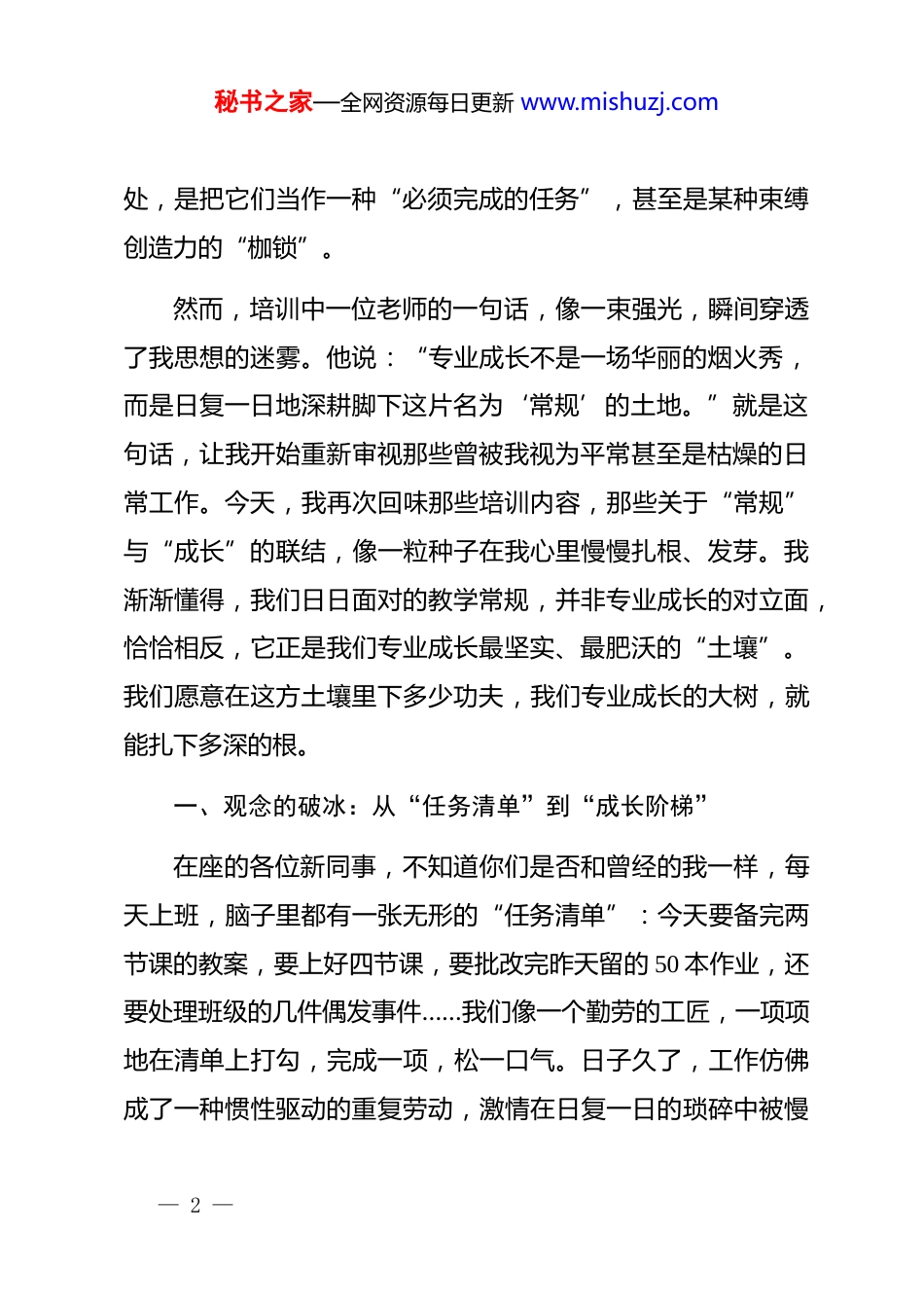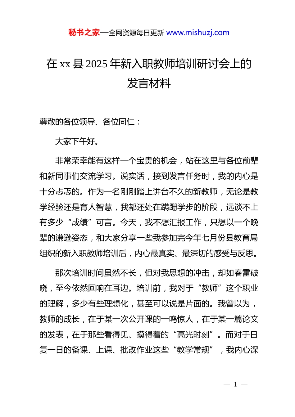 秘书之家—全网资源每日更新 www.mishuzj.com在 xx 县 2025 年新入职教师培训研讨会上的发言材料尊敬的各位领导、各位同仁:大家下午好。非常荣幸能有这样一个宝贵的机会,站在这里与各位前辈和新同事们交流学习。说实话,接到发言任务时,我的内心是十分忐忑的。作为一名刚刚踏上讲台不久的新教师,无论是教学经验还是育人智慧,我都还处在蹒跚学步的阶段,远谈不上有多少“成绩”可言。今天,我不想汇报工作,只想以一个晚辈的谦逊姿态,和大家分享一些我参加完今年七月份县教育局组织的新入职教师培训后,内心最真实、最深切的感受与反思。那次培训时间虽然不长,但对我思想的冲击,却如春雷破晓,至今依然回响在耳边。培训前,我对于“教师”这个职业的理解,多少有些理想化,甚至可以说是片面的。我曾以为,教师的成长,在于某一次公开课的一鸣惊人,在于某一篇论文的发表,在于那些看得见、摸得着的“高光时刻”。而对于日复一日的备课、上课、批改作业这些“教学常规”,我内心深— 1 —秘书之家—全网资源每日更新 www.mishuzj.com处,是把它们当作一种“必须完成的任务”,甚至是某种束缚创造力的“枷锁”。然而,培训中一位老师的一句话,像一束强光,瞬间穿透了我思想的迷雾。他说:“专业成长不是一场华丽的烟火秀,而是日复一日地深耕脚下这片名为‘常规’的土地。”就是这句话,让我开始重新审视那些曾被我视为平常甚至是枯燥的日常工作。今天,我再次回味那些培训内容,那些关于“常规”与“成长”的联结,像一粒种子在我心里慢慢扎根、发芽。我渐渐懂得,我们日日面对的教学常规,并非专业成长的对立面,恰恰相反,它正是我们专业成长最坚实、最肥沃的“土壤”。我们愿意在这方土壤里下多少功夫,我们专业成长的大树,就能扎下多深的根。一、观念的破冰:从“任务清单”到“成长阶梯”在座的各位新同事,不知道你们是否和曾经的我一样,每天上班,脑子里都有一张无形的“任务清单”:今天要备完两节课的教案,要上好四节课,要批改完昨天留的 50 本作业,还要处理班级的几件偶发事件……我们像一个勤劳的工匠,一项项地在清单上打勾,完成一项,松一口气。日子久了,工作仿佛成了一种惯性驱动的重复劳动,激情在日复一日的琐碎中被慢— 2 —秘书之家—全网资源每日更新 www.mishuzj.com慢消磨,我们离那个“优秀的自己”好像越来越远。过去,我就是这样的状态。我总认为,教学常规就是备课、上课、作业、辅导、反思这几个孤立的环节,它们是流程,是规定,是保证教学不出错的底线。培训彻底颠覆了我的认知。我才恍然大悟,优质的教学常规,从来都不是机械地执行流程,而是一项融入了教育理念、学情分析、创新思考与人文关怀的系统性工程。它不是我们专业成长的“天花板”,而是我们拾级而上、不断攀登的“阶梯”。比如备课,过去我更多的是在做“知识的搬运工”。我把教参上的知识点、案例、练习题,工工整整地誊写到我的教案本上,感觉满满当当,心里就踏实了。可一到课堂上,常常被学生的某个“突发问题”问得哑口无言,或者发现自己精心准备的内容,学生根本不感兴趣。培训中提到的“三维备得法”——拆解教材的“逻辑链”、摸清学生的“认知底”、搭建活动的“成长支架”,给了我醍醐灌顶般的启发。我开始明白,真正的备课,不是去预设“我要讲什么”,而是去探究“学生需要学什么”以及“他们如何才能学得会”。备课的起点,不应该是打开教参,而应该是深入到学生最近的作业本里、最近的课堂问答里,去寻找他们知识的断点、思维的堵点。— 3 —秘书之家—全网资源每日更新 www.mishuzj.com同样,对于作业的批改,我过去也只是扮演一个“对错的审判官”,用红笔画上对勾和叉,打上一个分数,工作便宣告结束。现在我才理解,每一次作业批改,都是一次与学生进行无声的深度对话,是一次宝贵的“学习诊断”。红叉的背后,究竟是计算失误,是概念混淆,还是审题不清?这些信息,远比一个冰冷的分数重要得多。它不仅是学生知识掌握情况的“晴雨表”,更是我们下一阶段教学调整的“导航仪”。当我对“教学常规”的理解,从“不得不做的任务清单”,转...