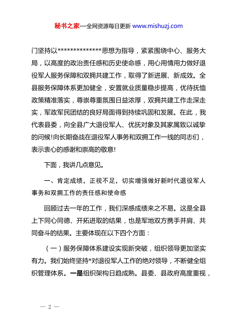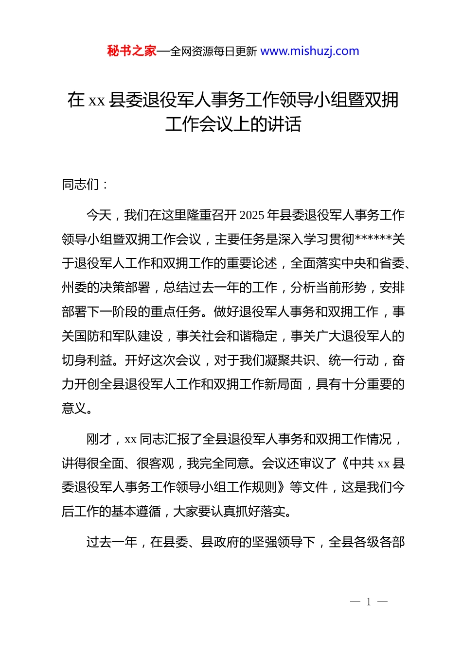 秘书之家—全网资源每日更新 www.mishuzj.com在 xx 县委退役军人事务工作领导小组暨双拥工作会议上的讲话同志们:今天,我们在这里隆重召开 2025 年县委退役军人事务工作领导小组暨双拥工作会议,主要任务是深入学习贯彻******关于退役军人工作和双拥工作的重要论述,全面落实中央和省委、州委的决策部署,总结过去一年的工作,分析当前形势,安排部署下一阶段的重点任务。做好退役军人事务和双拥工作,事关国防和军队建设,事关社会和谐稳定,事关广大退役军人的切身利益。开好这次会议,对于我们凝聚共识、统一行动,奋力开创全县退役军人工作和双拥工作新局面,具有十分重要的意义。刚才,xx 同志汇报了全县退役军人事务和双拥工作情况,讲得很全面、很客观,我完全同意。会议还审议了《中共 xx 县委退役军人事务工作领导小组工作规则》等文件,这是我们今后工作的基本遵循,大家要认真抓好落实。过去一年,在县委、县政府的坚强领导下,全县各级各部— 1 —秘书之家—全网资源每日更新 www.mishuzj.com门坚持以**************思想为指导,紧紧围绕中心、服务大局,以高度的政治责任感和历史使命感,用心用情用力做好退役军人服务保障和双拥共建工作,取得了新进展、新成效。全县服务保障体系更加健全,安置就业质量稳步提高,优待抚恤政策精准落实,尊崇尊重氛围日益浓厚,双拥共建工作走深走实,军政军民团结的良好局面得到持续巩固和发展。在此,我代表县委,向全县广大退役军人、优抚对象及其家属致以诚挚的问候!向长期奋战在退役军人事务和双拥工作一线的同志们,表示衷心的感谢和崇高的敬意!下面,我讲几点意见。一、肯定成绩,正视不足,切实增强做好新时代退役军人事务和双拥工作的责任感和使命感回顾过去一年的工作,我们深感成绩来之不易。这是全县上下同心同德、开拓进取的结果,也是军地双方携手并肩、共同奋斗的结果。主要体现在以下四个方面:(一)服务保障体系建设实现新突破,组织领导更加坚实有力。我们始终坚持*对退役军人工作的绝对领导,不断健全组织管理体系。一是组织架构日趋成熟。县委、县政府高度重视,— 2 —秘书之家—全网资源每日更新 www.mishuzj.com及时调整并充实了县委退役军人事务工作领导小组,由我担任组长,县长及相关县领导担任副组长,吸纳组织、宣传、人社、财政、公安、教育、卫健等三十余个部门为成员单位,形成了“*委统一领导、政府组织实施、退役军人事务部门牵头协调、相关部门支持配合”的强大工作合力。覆盖全县的“一中心两站”三级服务保障体系全面建成并高效运转,实现了服务网络纵向到底、横向到边,打通了服务退役军人的“最后一公里”。二是制度建设不断深化。我们坚持以制度建设固根本、利长远。今天会议审议的《xx 县委退役军人事务工作领导小组工作规则》,系统明确了领导小组的总体要求、组织架构、职责任务、议事规则和工作机制,为全县退役军人事务和双拥工作的科学决策、高效运行提供了根本制度保障。同时,我们还建立健全了联席会议、信息共享、督导检查等一系列配套制度,推动工作逐步走向规范化、精细化、长效化。(二)安置就业质量获得新提升,价值实现渠道更加宽广畅通。我们始终把退役军人就业创业作为一项重要的民生工程来抓,千方百计拓宽渠道、优化服务。截至 2024 年底,我县退役军人总数达 7200 余名,其中 60 岁以下具有劳动能力的退役军人约 6800 人。通过一系列扎实有效的工作,全县退役军人整— 3 —秘书之家—全网资源每日更新 www.mishuzj.com体就业率达到 86.1%,较上年提升了 2.3 个百分点。其中,进入各类企业就业的有 3500 余人,在机关事业单位等公共机构就业的有 1200 余人,自主创业人数达到 1500 余人,形成了多渠道、宽领域、高质量的就业新格局。一是就业岗位精准对接。我们坚持“输血”与“造血”并重,全年组织“军岗日”“老兵招聘月”等线上线下专场招聘会 12 场,累计组织 200 余家企业发布岗位近 2 万个,现场达成就业意向 439 人。我们还积极与县内重点企业、重大项目对接,开发“拥军岗位”,为 35 名符合条件的转业士官提供...