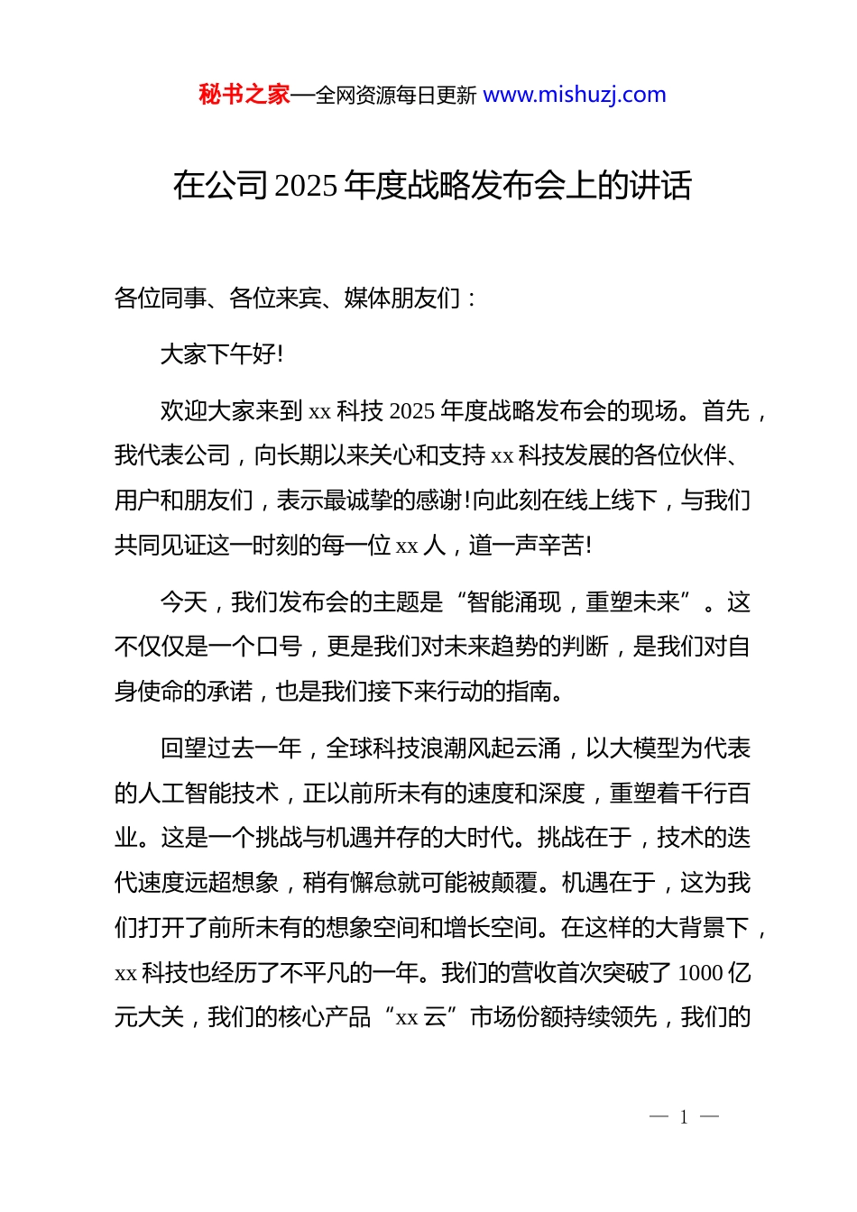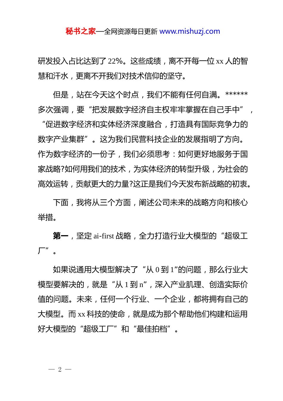 秘书之家—全网资源每日更新 www.mishuzj.com在公司 2025 年度战略发布会上的讲话各位同事、各位来宾、媒体朋友们:大家下午好!欢迎大家来到 xx 科技 2025 年度战略发布会的现场。首先,我代表公司,向长期以来关心和支持 xx 科技发展的各位伙伴、用户和朋友们,表示最诚挚的感谢!向此刻在线上线下,与我们共同见证这一时刻的每一位 xx 人,道一声辛苦!今天,我们发布会的主题是“智能涌现,重塑未来”。这不仅仅是一个口号,更是我们对未来趋势的判断,是我们对自身使命的承诺,也是我们接下来行动的指南。回望过去一年,全球科技浪潮风起云涌,以大模型为代表的人工智能技术,正以前所未有的速度和深度,重塑着千行百业。这是一个挑战与机遇并存的大时代。挑战在于,技术的迭代速度远超想象,稍有懈怠就可能被颠覆。机遇在于,这为我们打开了前所未有的想象空间和增长空间。在这样的大背景下,xx 科技也经历了不平凡的一年。我们的营收首次突破了 1000 亿元大关,我们的核心产品“xx 云”市场份额持续领先,我们的— 1 —秘书之家—全网资源每日更新 www.mishuzj.com研发投入占比达到了 22%。这些成绩,离不开每一位 xx 人的智慧和汗水,更离不开我们对技术信仰的坚守。但是,站在今天这个时点,我们不能有任何自满。******多次强调,要“把发展数字经济自主权牢牢掌握在自己手中”,“促进数字经济和实体经济深度融合,打造具有国际竞争力的数字产业集群”。这为我们民营科技企业的发展指明了方向。作为数字经济的一份子,我们必须思考:如何更好地服务于国家战略?如何用我们的技术,为实体经济的转型升级,为社会的高效运转,贡献更大的力量?这正是我们今天发布新战略的初衷。下面,我将从三个方面,阐述公司未来的战略方向和核心举措。第一,坚定 ai-first 战略,全力打造行业大模型的“超级工厂”。如果说通用大模型解决了“从 0 到 1”的问题,那么行业大模型要解决的,就是“从 1 到 n”,深入产业肌理、创造实际价值的问题。未来,任何一个行业、一个企业,都将拥有自己的大模型。而 xx 科技的使命,就是成为那个帮助他们构建和运用好大模型的“超级工厂”和“最佳拍档”。— 2 —秘书之家—全网资源每日更新 www.mishuzj.com为此,我们将实施“启航”计划:一是在技术上,持续加大对底层算法、算力平台和 ai 芯片的投入。未来三年,我们将再投入 500 亿元用于 ai 领域的研发,目标是打造一个自主可控、性能领先的 ai 基础设施底座。二是在产品上,我们将推出“xx 企业级大模型套件”,提供从数据处理、模型训练、精调优化到应用部署的全栈式工具链,让企业客户能够像搭积木一样,低成本、高效率地构建自己的专属模型。三是在生态上,我们将启动“百业千模”赋能计划,面向金融、制造、能源、交通、医疗等 20 个重点行业,联合 1000家头部合作伙伴,共同开发行业大模型解决方案,并将我们的模型能力向中小企业开放,让 ai 普惠化。第二,深耕产业数字化,做实体经济转型升级的“数字化合伙人”。数字经济的根基在实体经济。我们坚信,技术只有与场景深度结合,才能释放出最大的能量。未来,xx 科技将不仅仅是技术提供商,更要成为客户身边的“数字化合伙人”。我们将聚焦三大赛道:一是智能制造。我们将把 ai、大数据、物联网技术深度融— 3 —秘书之家—全网资源每日更新 www.mishuzj.com入到制造业的研发设计、生产制造、经营管理等全流程,帮助制造企业实现柔性生产、降本增效和产品创新。我们的目标是,在未来三年内,服务超过 1 万家规模以上制造企业,打造 100个“黑灯工厂”标杆。二是智慧能源。我们将利用 ai 技术优化电网调度、预测新能源发电功率、管理碳排放,助力国家“双碳”目标的实现。三是智慧交通。我们将致力于用 ai 改善城市交通拥堵,提升物流运输效率,并积极探索自动驾驶在特定场景的商业化落地。为了做好“数字化合伙人”,我们必须离炮火更近,离客户更近。我要求,公司所有 m5 级别以上的管理者,每年必须有至少一个月的时间深入客户一线,去倾听他们的痛点,去理解他们的业务。...
