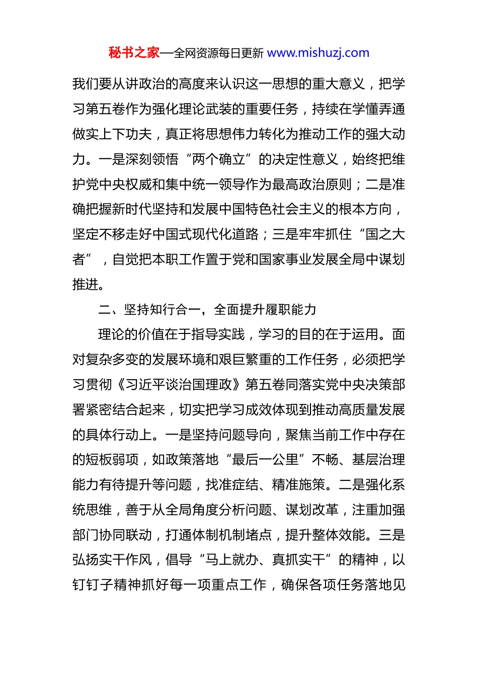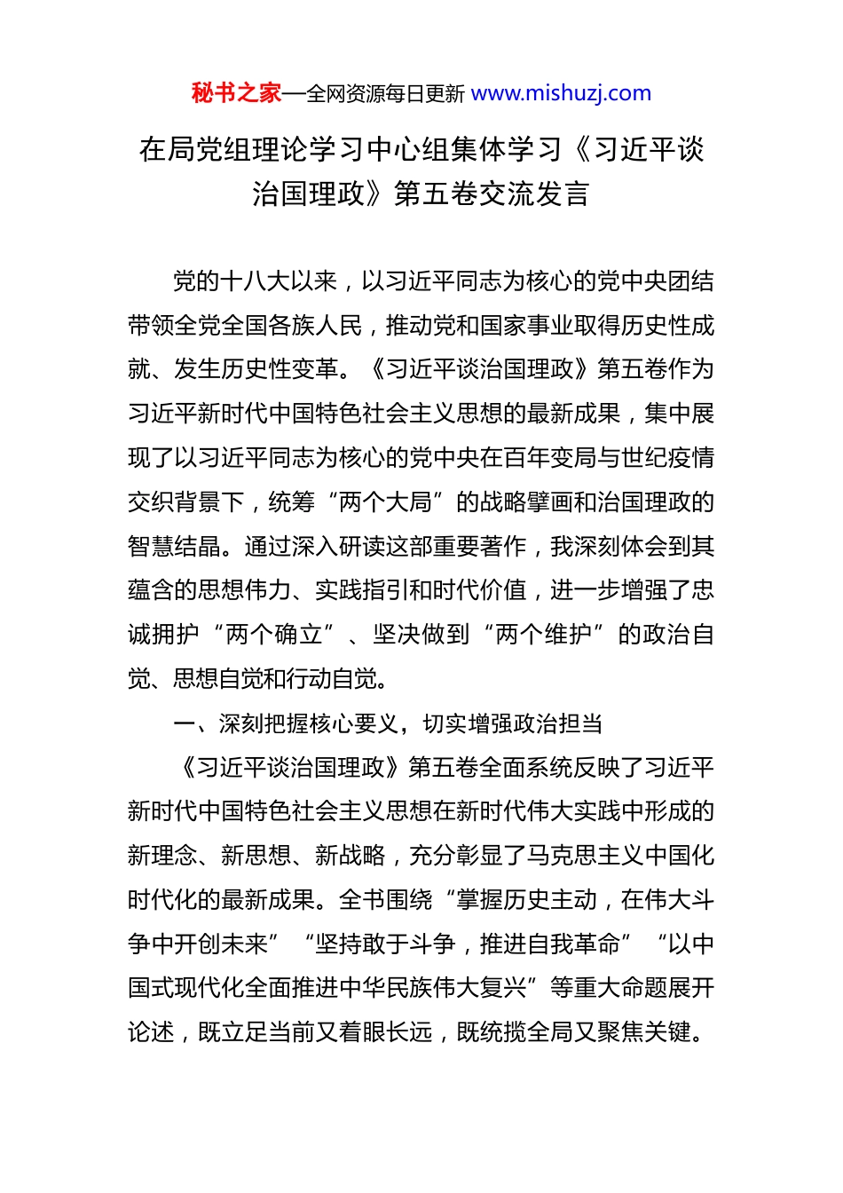 秘书之家—全网资源每日更新 www.mishuzj.com在局党组理论学习中心组集体学习《习近平谈治国理政》第五卷交流发言 党的十八大以来,以习近平同志为核心的党中央团结带领全党全国各族人民,推动党和国家事业取得历史性成就、发生历史性变革。《习近平谈治国理政》第五卷作为习近平新时代中国特色社会主义思想的最新成果,集中展现了以习近平同志为核心的党中央在百年变局与世纪疫情交织背景下,统筹“两个大局”的战略擘画和治国理政的智慧结晶。通过深入研读这部重要著作,我深刻体会到其蕴含的思想伟力、实践指引和时代价值,进一步增强了忠诚拥护“两个确立”、坚决做到“两个维护”的政治自觉、思想自觉和行动自觉。一、深刻把握核心要义,切实增强政治担当《习近平谈治国理政》第五卷全面系统反映了习近平新时代中国特色社会主义思想在新时代伟大实践中形成的新理念、新思想、新战略,充分彰显了马克思主义中国化时代化的最新成果。全书围绕“掌握历史主动,在伟大斗争中开创未来”“坚持敢于斗争,推进自我革命”“以中国式现代化全面推进中华民族伟大复兴”等重大命题展开论述,既立足当前又着眼长远,既统揽全局又聚焦关键。秘书之家—全网资源每日更新 www.mishuzj.com我们要从讲政治的高度来认识这一思想的重大意义,把学习第五卷作为强化理论武装的重要任务,持续在学懂弄通做实上下功夫,真正将思想伟力转化为推动工作的强大动力。一是深刻领悟“两个确立”的决定性意义,始终把维护党中央权威和集中统一领导作为最高政治原则;二是准确把握新时代坚持和发展中国特色社会主义的根本方向,坚定不移走好中国式现代化道路;三是牢牢抓住“国之大者”,自觉把本职工作置于党和国家事业发展全局中谋划推进。二、坚持知行合一,全面提升履职能力理论的价值在于指导实践,学习的目的在于运用。面对复杂多变的发展环境和艰巨繁重的工作任务,必须把学习贯彻《习近平谈治国理政》第五卷同落实党中央决策部署紧密结合起来,切实把学习成效体现到推动高质量发展的具体行动上。一是坚持问题导向,聚焦当前工作中存在的短板弱项,如政策落地“最后一公里”不畅、基层治理能力有待提升等问题,找准症结、精准施策。二是强化系统思维,善于从全局角度分析问题、谋划改革,注重加强部门协同联动,打通体制机制堵点,提升整体效能。三是弘扬实干作风,倡导“马上就办、真抓实干”的精神,以钉钉子精神抓好每一项重点工作,确保各项任务落地见秘书之家—全网资源每日更新 www.mishuzj.com效。比如在推进重点项目建设过程中,既要严控风险,又要加快进度,做到稳中求进、务求实效。三、厚植为民情怀,不断增进民生福祉。人民至上是贯穿《习近平谈治国理政》第五卷的一条鲜明主线。无论是关于“江山就是人民,人民就是江山”的深情告白,还是对“共同富裕”乡村振兴“教育公平”“健康中国”等民生议题的深切关怀,都体现了我们党一切工作的出发点和落脚点都是为了保障和改善民生。我们必须始终站稳人民立场,把群众满意不满意、高兴不高兴、答应不答应作为检验工作的根本标准。一是要倾听群众呼声,畅通民意反馈渠道,广泛开展调研走访,把一线情况摸清、把真实诉求搞准。二是要办好惠民实事,围绕群众关心的就业、养老、住房、医疗等现实难题,推出更多可感可及的政策措施,让发展成果更多更公平惠及全体人民。三是要健全长效机制,推动解决群众急难愁盼问题从“一时解决”向“长效治理”转变,不断增强人民群众获得感、幸福感、安全感。四、勇于自我革命,持续涵养清朗政治生态全面从严治党永远在路上,党的自我革命永远在路上。《习近平谈治国理政》第五卷对深入推进全面从严治党作出一系列重要部署,强调“打铁还须自身硬”,要求秘书之家—全网资源每日更新 www.mishuzj.com各级党组织和党员干部始终绷紧纪律规矩这根弦。我们要以更高标准、更严要求加强自身建设,切实扛起管党治党政治责任。一是严格落实主体责任,把党建工作与业务工作同研究、同部署、同推进、同考核,防止“两张皮”。二是加强党风廉政教育,用身边事教育身边人,常态化开展警示教育,筑牢拒腐防变的思想防线...