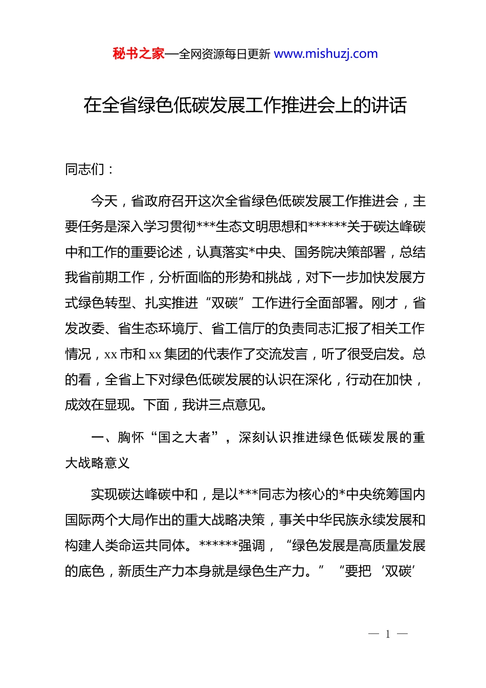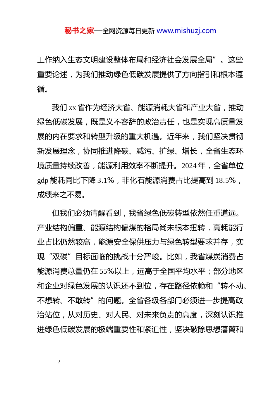 秘书之家—全网资源每日更新 www.mishuzj.com在全省绿色低碳发展工作推进会上的讲话同志们:今天,省政府召开这次全省绿色低碳发展工作推进会,主要任务是深入学习贯彻***生态文明思想和******关于碳达峰碳中和工作的重要论述,认真落实*中央、国务院决策部署,总结我省前期工作,分析面临的形势和挑战,对下一步加快发展方式绿色转型、扎实推进“双碳”工作进行全面部署。刚才,省发改委、省生态环境厅、省工信厅的负责同志汇报了相关工作情况,xx 市和 xx 集团的代表作了交流发言,听了很受启发。总的看,全省上下对绿色低碳发展的认识在深化,行动在加快,成效在显现。下面,我讲三点意见。一、胸怀“国之大者”,深刻认识推进绿色低碳发展的重大战略意义实现碳达峰碳中和,是以***同志为核心的*中央统筹国内国际两个大局作出的重大战略决策,事关中华民族永续发展和构建人类命运共同体。******强调,“绿色发展是高质量发展的底色,新质生产力本身就是绿色生产力。”“要把‘双碳’— 1 —秘书之家—全网资源每日更新 www.mishuzj.com工作纳入生态文明建设整体布局和经济社会发展全局”。这些重要论述,为我们推动绿色低碳发展提供了方向指引和根本遵循。我们 xx 省作为经济大省、能源消耗大省和产业大省,推动绿色低碳发展,既是义不容辞的政治责任,也是实现高质量发展的内在要求和转型升级的重大机遇。近年来,我们坚决贯彻新发展理念,协同推进降碳、减污、扩绿、增长,全省生态环境质量持续改善,能源利用效率不断提升。2024 年,全省单位gdp 能耗同比下降 3.1%,非化石能源消费占比提高到 18.5%,成绩来之不易。但我们必须清醒看到,我省绿色低碳转型依然任重道远。产业结构偏重、能源结构偏煤的格局尚未根本扭转,高耗能行业占比仍然较高,能源安全保供压力与绿色转型要求并存,实现“双碳”目标面临的挑战十分严峻。比如,我省煤炭消费占能源消费总量仍在 55%以上,远高于全国平均水平;部分地区和企业对绿色发展的认识还不到位,存在路径依赖和“转不动、不想转、不敢转”的问题。全省各级各部门必须进一步提高政治站位,从对历史、对人民、对未来负责的高度,深刻认识推进绿色低碳发展的极端重要性和紧迫性,坚决破除思想藩篱和— 2 —秘书之家—全网资源每日更新 www.mishuzj.com路径依赖,以壮士断腕的决心、抓铁有痕的劲头,坚定不移走生态优先、绿色低碳的高质量发展道路。二、坚持系统推进,以更高标准和更实举措加快发展方式绿色转型推动绿色低碳发展是一场广泛而深刻的经济社会系统性变革,不是轻轻松松就能实现的。必须坚持先立后破、通盘谋划,处理好发展和减排、整体和局部、短期和中长期的关系,有计划分步骤实施碳达峰行动。第一,大力推动能源革命,构建清洁低碳安全高效的能源体系。能源是“双碳”工作的主战场。一要全力发展非化石能源。要坚持集中式与分布式并举,大力发展风电、光伏发电,高标准建设 xx 海上风电基地、xx 沿海光伏带。要因地制宜发展生物质能、地热能,安全有序发展核电,加快构建多能互补的新能源供给体系。力争到 2030 年,非化石能源发电量占比达到45%。二要推动煤炭清洁高效利用。要统筹做好煤炭清洁高效利用这篇大文章,加快现役煤电机组节能降碳改造、灵活性改造、供热改造“三改联动”,大力发展煤电联营和煤炭-新能源联营。要坚决遏制高耗能、高排放、低水平项目盲目发展。三要确保能源安全可靠供应。要加强能源产供储销体系建设,提— 3 —秘书之家—全网资源每日更新 www.mishuzj.com升电网对高比例新能源的消纳和调控能力,确保在绿色转型的过程中,能源的饭碗牢牢端在自己手里。第二,加快产业结构优化升级,打造绿色低碳的现代产业集群。产业是碳排放的主要领域。一要坚决调整优化产业结构。要加快淘汰落后产能,严控“两高”行业新增产能。要大力发展战略性新兴产业,聚焦新能源、新材料、高端装备、节能环保等绿色产业,培育壮大一批龙头企业和产业集群,让“绿色”成为我省产业的核心竞争力。二要推动重点行业绿色改造。要聚焦钢铁、石化、建材等重点行业,全面开展节能降碳诊断,推广应...