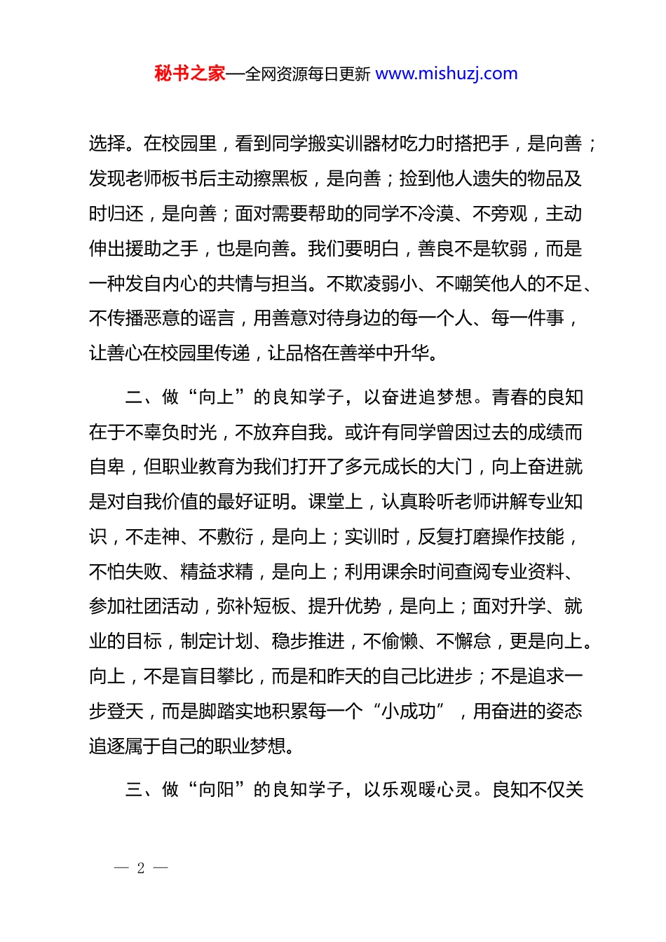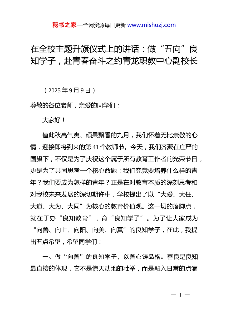 秘书之家—全网资源每日更新 www.mishuzj.com在全校主题升旗仪式上的讲话:做“五向”良知学子,赴青春奋斗之约青龙职教中心副校长(2025 年 9 月 9 日)尊敬的各位老师,亲爱的同学们:大家好!值此秋高气爽、硕果飘香的九月,我们怀着无比崇敬的心情,迎接即将到来的第 41 个教师节。今天,我们齐聚在庄严的国旗下,不仅是为了庆祝这个属于所有教育工作者的光荣节日,更是为了共同思考一个核心命题:我们究竟要培养什么样的青年?我们要成为怎样的青年?正是在对教育本质的深刻思考和对我校未来发展的深切期许中,学校提出了以“大爱、大任、大道、大为、大同”为核心的教育价值观。这一切的落脚点,就在于办“良知教育”,育“良知学子”。为了让大家成为“向善、向上、向阳、向美、向真”的良知学子,在此,我提出五点希望,希望同学们:一、做“向善”的良知学子,以善心铸品格。善良是良知最直接的体现,它不是惊天动地的壮举,而是融入日常的点滴— 1 —秘书之家—全网资源每日更新 www.mishuzj.com选择。在校园里,看到同学搬实训器材吃力时搭把手,是向善;发现老师板书后主动擦黑板,是向善;捡到他人遗失的物品及时归还,是向善;面对需要帮助的同学不冷漠、不旁观,主动伸出援助之手,也是向善。我们要明白,善良不是软弱,而是一种发自内心的共情与担当。不欺凌弱小、不嘲笑他人的不足、不传播恶意的谣言,用善意对待身边的每一个人、每一件事,让善心在校园里传递,让品格在善举中升华。二、做“向上”的良知学子,以奋进追梦想。青春的良知在于不辜负时光,不放弃自我。或许有同学曾因过去的成绩而自卑,但职业教育为我们打开了多元成长的大门,向上奋进就是对自我价值的最好证明。课堂上,认真聆听老师讲解专业知识,不走神、不敷衍,是向上;实训时,反复打磨操作技能,不怕失败、精益求精,是向上;利用课余时间查阅专业资料、参加社团活动,弥补短板、提升优势,是向上;面对升学、就业的目标,制定计划、稳步推进,不偷懒、不懈怠,更是向上。向上,不是盲目攀比,而是和昨天的自己比进步;不是追求一步登天,而是脚踏实地积累每一个“小成功”,用奋进的姿态追逐属于自己的职业梦想。三、做“向阳”的良知学子,以乐观暖心灵。良知不仅关— 2 —秘书之家—全网资源每日更新 www.mishuzj.com乎对他人、对自我的态度,更关乎对生活的认知。向阳而生的心态,是良知赋予我们的心理力量。学习中遇到难题时,不焦虑、不退缩,相信“办法总比困难多”,是向阳;和同学产生小摩擦时,不记仇、不纠结,主动沟通化解矛盾,是向阳;面对生活中的不如意,不抱怨、不消沉,多看到身边的美好与温暖,是向阳。我们要多走进操场,在奔跑跳跃中释放压力;多和老师同学交流,在真诚互动中收获快乐;多关注校园里的蓝天白云、花草树木,让阳光住进心里,用乐观的心态感染身边人,让校园充满积极向上的正能量。四、做“向美”的良知学子,以发现育情怀。爱美之心,人皆有之,而良知指引我们的“向美”,是对真善美的深刻感知与主动追求。在青职的校园里,美无处不在,赛场上,同学们专注操作、精益求精,用精湛技艺展现“工匠精神”之美;上课时,师生间的默契配合、同学间的互助协作,是和谐互动的美;校园里,整洁的教室、有序的队列、文明的言行,是规则规范的美;生活中,尊重他人的劳动成果、爱护公共设施、保持环境整洁,是品德修养的美。向美,就是要学会发现这些美,更要主动创造美——规范自己的言行举止,让文明成为一种习惯;用心打磨每一件实训作品,让专业技能展现美;真诚— 3 —秘书之家—全网资源每日更新 www.mishuzj.com对待身边的人和事,让善意传递美,用对美的追求培育高尚的人文情怀。五、做“向真”的良知学子,以诚信立根本。真诚与诚信是良知的底线,也是为人处世的根本准则。在学习中,独立完成作业、认真对待考试,不抄袭、不作弊,是向真;在实训中,如实记录操作过程、不隐瞒失误、不伪造数据,是向真;在与他人交往中,说话算数、信守承诺,不撒谎、不欺瞒,是向真;在面对问题时,敢于承认错误、勇于承担责任,不推诿、不逃避,...