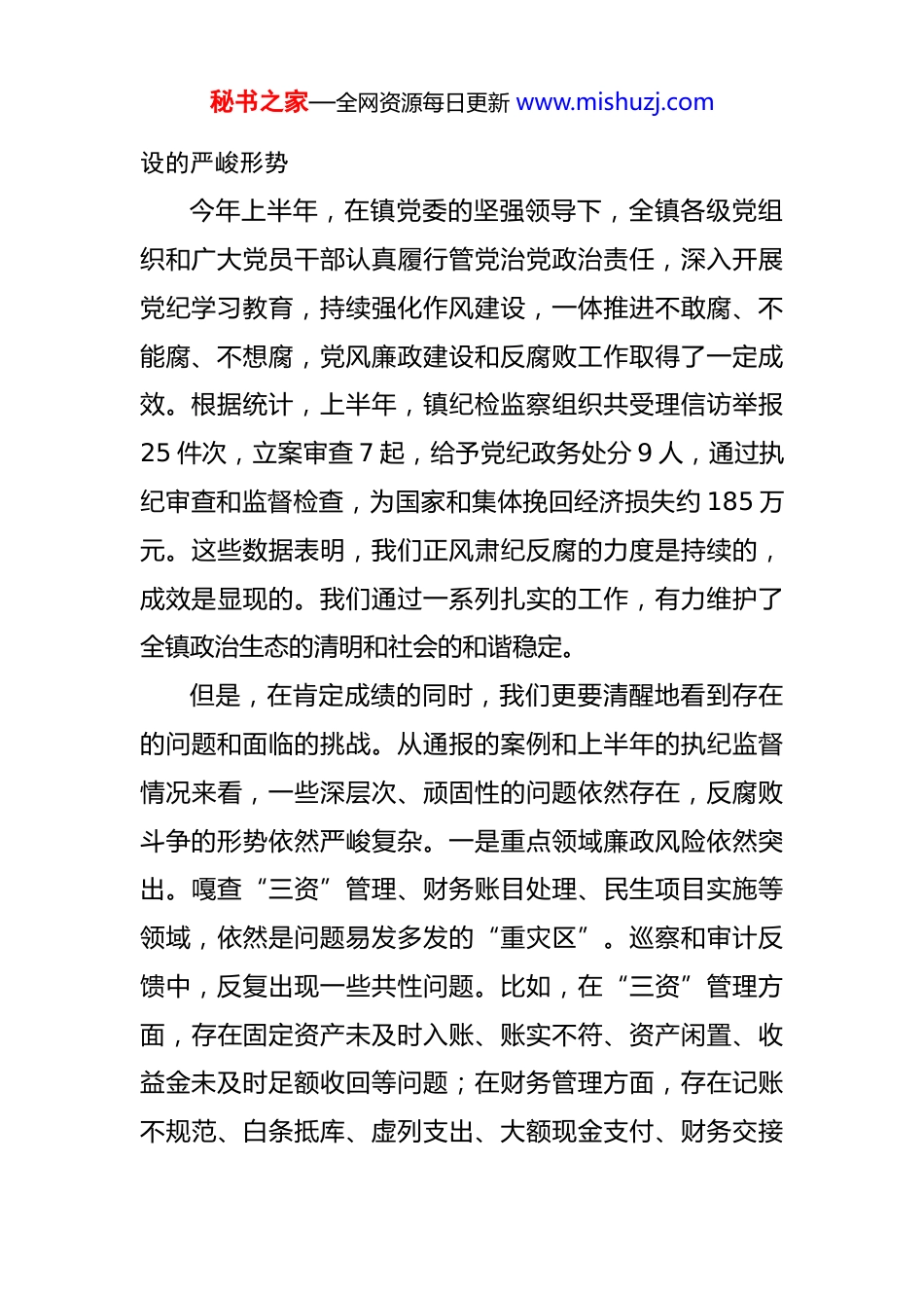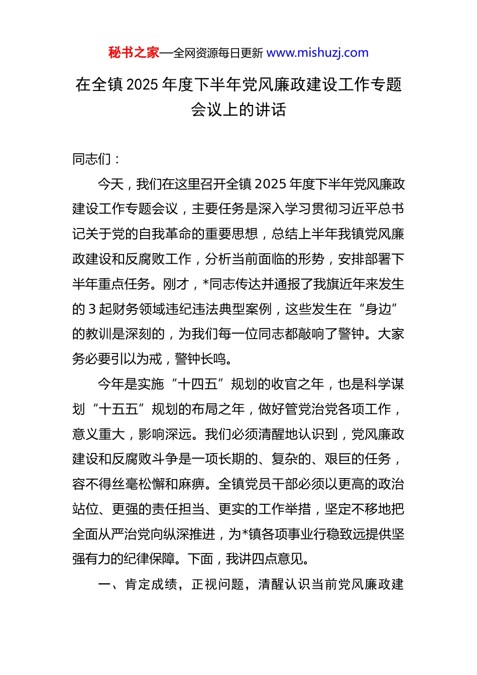 秘书之家—全网资源每日更新 www.mishuzj.com在全镇 2025 年度下半年党风廉政建设工作专题会议上的讲话 同志们:今天,我们在这里召开全镇 2025 年度下半年党风廉政建设工作专题会议,主要任务是深入学习贯彻习近平总书记关于党的自我革命的重要思想,总结上半年我镇党风廉政建设和反腐败工作,分析当前面临的形势,安排部署下半年重点任务。刚才,*同志传达并通报了我旗近年来发生的 3 起财务领域违纪违法典型案例,这些发生在“身边”的教训是深刻的,为我们每一位同志都敲响了警钟。大家务必要引以为戒,警钟长鸣。今年是实施“十四五”规划的收官之年,也是科学谋划“十五五”规划的布局之年,做好管党治党各项工作,意义重大,影响深远。我们必须清醒地认识到,党风廉政建设和反腐败斗争是一项长期的、复杂的、艰巨的任务,容不得丝毫松懈和麻痹。全镇党员干部必须以更高的政治站位、更强的责任担当、更实的工作举措,坚定不移地把全面从严治党向纵深推进,为*镇各项事业行稳致远提供坚强有力的纪律保障。下面,我讲四点意见。一、肯定成绩,正视问题,清醒认识当前党风廉政建秘书之家—全网资源每日更新 www.mishuzj.com设的严峻形势今年上半年,在镇党委的坚强领导下,全镇各级党组织和广大党员干部认真履行管党治党政治责任,深入开展党纪学习教育,持续强化作风建设,一体推进不敢腐、不能腐、不想腐,党风廉政建设和反腐败工作取得了一定成效。根据统计,上半年,镇纪检监察组织共受理信访举报25 件次,立案审查 7 起,给予党纪政务处分 9 人,通过执纪审查和监督检查,为国家和集体挽回经济损失约 185 万元。这些数据表明,我们正风肃纪反腐的力度是持续的,成效是显现的。我们通过一系列扎实的工作,有力维护了全镇政治生态的清明和社会的和谐稳定。但是,在肯定成绩的同时,我们更要清醒地看到存在的问题和面临的挑战。从通报的案例和上半年的执纪监督情况来看,一些深层次、顽固性的问题依然存在,反腐败斗争的形势依然严峻复杂。一是重点领域廉政风险依然突出。嘎查“三资”管理、财务账目处理、民生项目实施等领域,依然是问题易发多发的“重灾区”。巡察和审计反馈中,反复出现一些共性问题。比如,在“三资”管理方面,存在固定资产未及时入账、账实不符、资产闲置、收益金未及时足额收回等问题;在财务管理方面,存在记账不规范、白条抵库、虚列支出、大额现金支付、财务交接秘书之家—全网资源每日更新 www.mishuzj.com不清、私设“小金库”等现象;在民生项目实施方面,一些项目的前期论证不充分、程序不规范、监管不到位,导致资金使用效益不高,甚至存在廉政风险。这些问题不仅侵蚀了集体利益,损害了群众的切身利益,更败坏了党和政府的形象。二是少数干部纪律规矩意识依然淡薄。“不收敛、不收手”的现象在个别干部身上依然存在。有的人心存侥幸,认为只要手段隐蔽就不会被发现;有的人把个人利益凌驾于集体利益之上,利用职务之便优亲厚友、吃拿卡要;有的人对中央八项规定精神置若罔闻,违规接受宴请、收送礼品礼金等问题时有发生。刚才*同志通报的 3起案例,就是发生在我们身边的活生生的例子,涉案人员过去也曾是我们的同事,如今却沦为阶下囚,教训何其惨痛!这充分说明,纪律的“高压线”必须时刻通电,作风的“防火墙”必须层层加固。三是监督执纪问责的力度仍需加强。虽然我们不断强调要压实“两个责任”,但在实际操作中,“上热中温下冷”的现象依然存在。有的单位党组织负责人对党风廉政建设主体责任认识不到位,满足于开会发文,对分管领域干部的日常监督管理“失之于宽、失之于软”;有的纪检干部业务能力有待提升,面对复杂案件时存在畏难情绪,监督的精准性和有效性不足。此外,群众监督的作用还没有得到充分发挥,“三务公秘书之家—全网资源每日更新 www.mishuzj.com开”“四议两公开”等制度在一些嘎查(社区)执行得还不够规范、不够透明,群众的知情权、参与权、监督权没有得到完全保障。这些问题的存在,警示我们全面从严治党永远在路上,党的自我革命永远在路上。全镇上下必须保持高度的政治警觉,以“零容忍”...