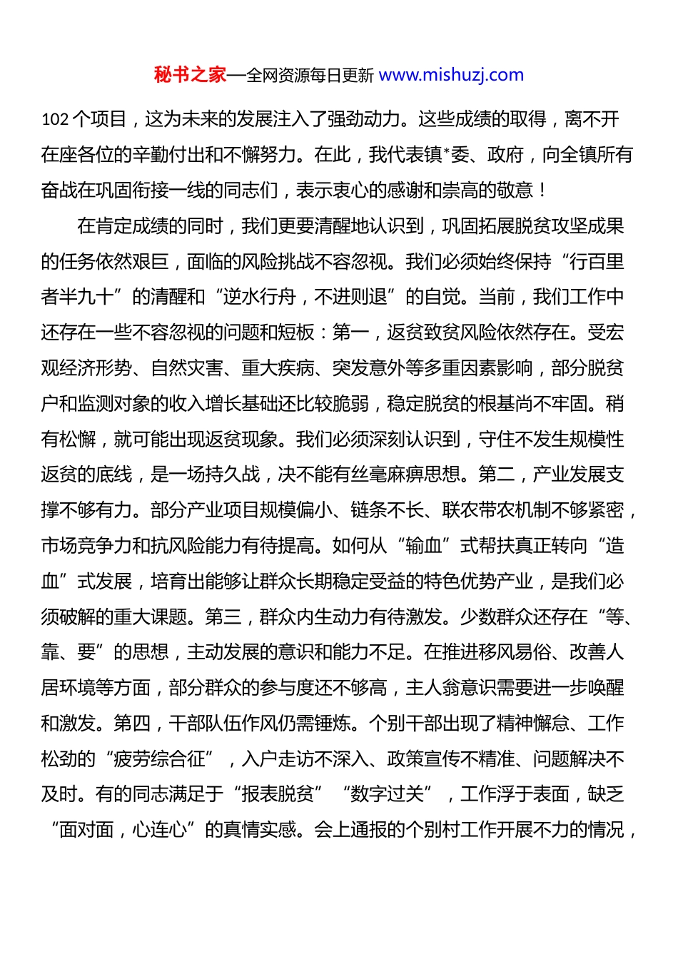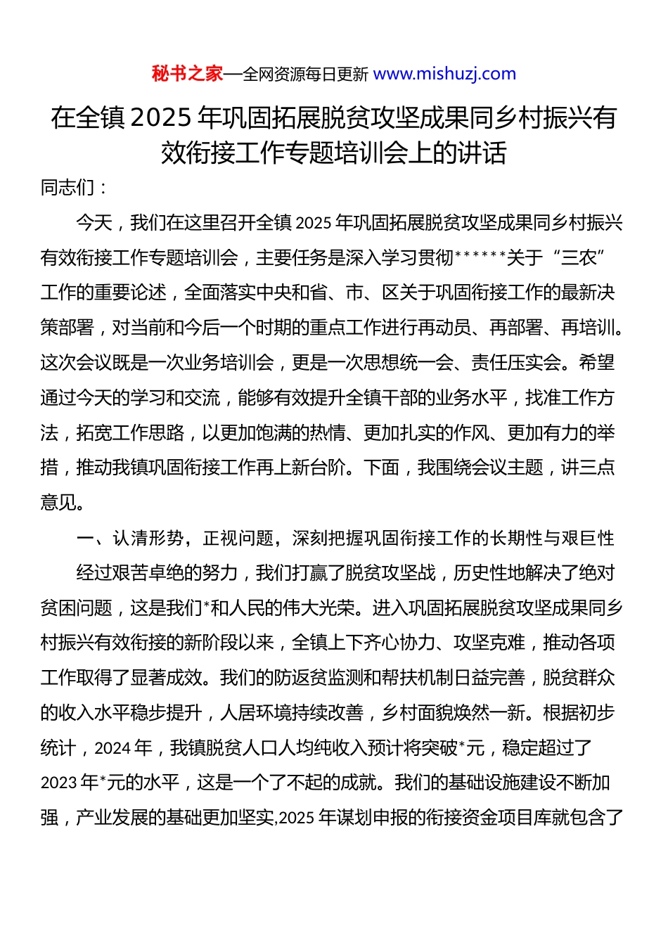 秘书之家—全网资源每日更新 www.mishuzj.com在全镇 2025 年巩固拓展脱贫攻坚成果同乡村振兴有效衔接工作专题培训会上的讲话同志们:今天,我们在这里召开全镇 2025 年巩固拓展脱贫攻坚成果同乡村振兴有效衔接工作专题培训会,主要任务是深入学习贯彻******关于“三农”工作的重要论述,全面落实中央和省、市、区关于巩固衔接工作的最新决策部署,对当前和今后一个时期的重点工作进行再动员、再部署、再培训。这次会议既是一次业务培训会,更是一次思想统一会、责任压实会。希望通过今天的学习和交流,能够有效提升全镇干部的业务水平,找准工作方法,拓宽工作思路,以更加饱满的热情、更加扎实的作风、更加有力的举措,推动我镇巩固衔接工作再上新台阶。下面,我围绕会议主题,讲三点意见。一、认清形势,正视问题,深刻把握巩固衔接工作的长期性与艰巨性经过艰苦卓绝的努力,我们打赢了脱贫攻坚战,历史性地解决了绝对贫困问题,这是我们*和人民的伟大光荣。进入巩固拓展脱贫攻坚成果同乡村振兴有效衔接的新阶段以来,全镇上下齐心协力、攻坚克难,推动各项工作取得了显著成效。我们的防返贫监测和帮扶机制日益完善,脱贫群众的收入水平稳步提升,人居环境持续改善,乡村面貌焕然一新。根据初步统计,2024 年,我镇脱贫人口人均纯收入预计将突破*元,稳定超过了2023 年*元的水平,这是一个了不起的成就。我们的基础设施建设不断加强,产业发展的基础更加坚实,2025 年谋划申报的衔接资金项目库就包含了秘书之家—全网资源每日更新 www.mishuzj.com102 个项目,这为未来的发展注入了强劲动力。这些成绩的取得,离不开在座各位的辛勤付出和不懈努力。在此,我代表镇*委、政府,向全镇所有奋战在巩固衔接一线的同志们,表示衷心的感谢和崇高的敬意!在肯定成绩的同时,我们更要清醒地认识到,巩固拓展脱贫攻坚成果的任务依然艰巨,面临的风险挑战不容忽视。我们必须始终保持“行百里者半九十”的清醒和“逆水行舟,不进则退”的自觉。当前,我们工作中还存在一些不容忽视的问题和短板:第一,返贫致贫风险依然存在。受宏观经济形势、自然灾害、重大疾病、突发意外等多重因素影响,部分脱贫户和监测对象的收入增长基础还比较脆弱,稳定脱贫的根基尚不牢固。稍有松懈,就可能出现返贫现象。我们必须深刻认识到,守住不发生规模性返贫的底线,是一场持久战,决不能有丝毫麻痹思想。第二,产业发展支撑不够有力。部分产业项目规模偏小、链条不长、联农带农机制不够紧密,市场竞争力和抗风险能力有待提高。如何从“输血”式帮扶真正转向“造血”式发展,培育出能够让群众长期稳定受益的特色优势产业,是我们必须破解的重大课题。第三,群众内生动力有待激发。少数群众还存在“等、靠、要”的思想,主动发展的意识和能力不足。在推进移风易俗、改善人居环境等方面,部分群众的参与度还不够高,主人翁意识需要进一步唤醒和激发。第四,干部队伍作风仍需锤炼。个别干部出现了精神懈怠、工作松劲的“疲劳综合征”,入户走访不深入、政策宣传不精准、问题解决不及时。有的同志满足于“报表脱贫”“数字过关”,工作浮于表面,缺乏“面对面,心连心”的真情实感。会上通报的个别村工作开展不力的情况,秘书之家—全网资源每日更新 www.mishuzj.com就是给我们所有人敲响的警钟。这些问题,是前进中的问题,也是我们下一步工作中必须着力解决的重点和难点。全镇上下必须把思想和行动统一到*中央决策部署上来,充分认识做好巩固衔接工作的极端重要性,以“时时放心不下”的责任感和“事事落实到位”的执行力,打好这场持久战。二、聚焦重点,精准发力,全面提升巩固衔接工作的质量与成效做好新阶段的巩固衔接工作,必须坚持问题导向、目标导向、结果导向,精准施策、靶向发力,确保实现我们提出的“两好两升两确保”目标。所谓“两好”,就是产业发展基础好、农村人居环境好;“两升”,就是群众收入水平稳步提升、群众满意认可度稳步提升;“两确保”,就是确保不发生规模性返贫、确保脱贫攻坚与乡村振兴的平稳过渡和有效衔接。为实现这一目标,我们必须在以下五个方面下足功夫:第一,...