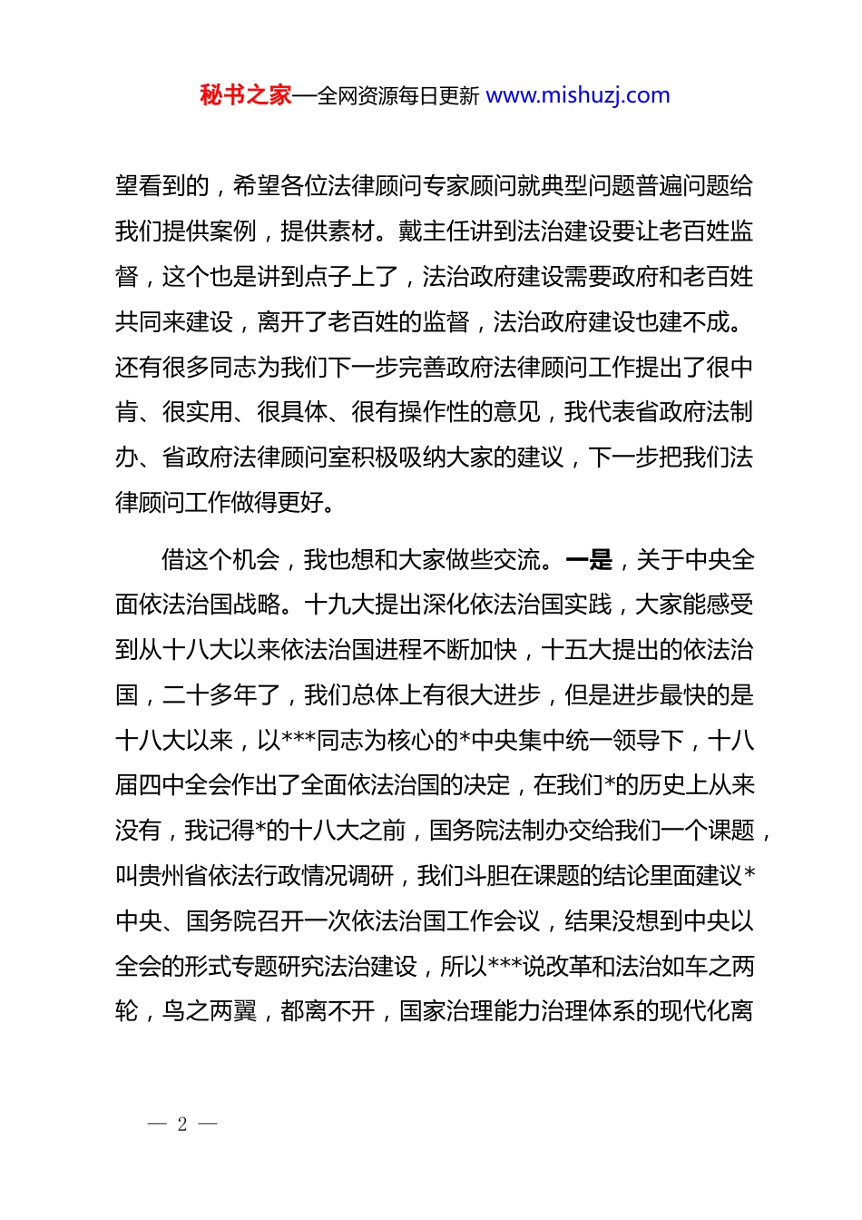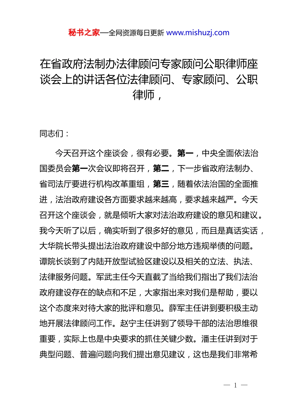 秘书之家—全网资源每日更新 www.mishuzj.com在省政府法制办法律顾问专家顾问公职律师座谈会上的讲话各位法律顾问、专家顾问、公职律师,同志们:今天召开这个座谈会,很有必要。第一,中央全面依法治国委员会第一次会议即将召开,第二,下一步省政府法制办、省司法厅要进行机构改革重组,第三,随着依法治国的全面推进,法治政府建设各方面要求越来越高,要求越来越严。今天召开这个座谈会,就是倾听大家对法治政府建设的意见和建议。我今天听了以后,确实听到了很多好的意见,而且是真话实话,大华院长带头提出法治政府建设中部分地方违规举债的问题。谭院长谈到了内陆开放型试验区建设以及相关的立法、执法、法律服务问题。军武主任今天直截了当给我们指出了我们法治政府建设存在的缺点和不足,大家指出来对我们是帮助,要以这个态度来对待大家的批评和意见。薛军主任讲到要积极主动地开展法律顾问工作。赵宁主任讲到了领导干部的法治思维很重要,实际上也是中央要求的抓住关键少数。潘主任讲到对于典型问题、普遍问题向我们提出意见建议,这也是我们非常希— 1 —秘书之家—全网资源每日更新 www.mishuzj.com望看到的,希望各位法律顾问专家顾问就典型问题普遍问题给我们提供案例,提供素材。戴主任讲到法治建设要让老百姓监督,这个也是讲到点子上了,法治政府建设需要政府和老百姓共同来建设,离开了老百姓的监督,法治政府建设也建不成。还有很多同志为我们下一步完善政府法律顾问工作提出了很中肯、很实用、很具体、很有操作性的意见,我代表省政府法制办、省政府法律顾问室积极吸纳大家的建议,下一步把我们法律顾问工作做得更好。借这个机会,我也想和大家做些交流。一是,关于中央全面依法治国战略。十九大提出深化依法治国实践,大家能感受到从十八大以来依法治国进程不断加快,十五大提出的依法治国,二十多年了,我们总体上有很大进步,但是进步最快的是十八大以来,以***同志为核心的*中央集中统一领导下,十八届四中全会作出了全面依法治国的决定,在我们*的历史上从来没有,我记得*的十八大之前,国务院法制办交给我们一个课题,叫贵州省依法行政情况调研,我们斗胆在课题的结论里面建议*中央、国务院召开一次依法治国工作会议,结果没想到中央以全会的形式专题研究法治建设,所以***说改革和法治如车之两轮,鸟之两翼,都离不开,国家治理能力治理体系的现代化离— 2 —秘书之家—全网资源每日更新 www.mishuzj.com不开法治。如果离开了,今天有繁荣,明天也会毁灭。我们大家也是赶上了好时候,我们迎来了法治建设的快车道,大家能够感受到,十八大以来,我们一直在努力做这个事情,虽然我们还有很多困难和不足,但是这项工作只会加强,不会削弱。我们作为政府法律顾问更要坚定信心,法治政府建设一定能实现,这是我们事业所在,也是我们奋斗的目标,只要我们努力干下去,法治政府一定能够建成。二是,关于原国务院法制办和原司法部重新组建新的司法部。重新组建的司法部履行中央全面依法治国委员会办公室职责,今天我看到了新组建的司法部的三定方案。新组建的司法部从依法治国到具体的法律服务、法律宣传每项职能都涉及,科学立法、严格执法、公正司法、全民守法方方面面都涉及。下一步,重组以后对我们的工作、事业发展来说也是重大的机遇,司法部上个星期召开了全国司法厅(局)长和法制办主任座谈会,从会上传来的信息,今年司法部要做几件大事,第一是今年内制定《重大行政决策程序条例》,刚才很多同志讲到决策,决策是政府依法行政的源头,就像扣扣子如果第一粒扣歪了,后面都是错的,所以关于决策必须要国家立法。第二是刚才讲到的三项制度改革,去年我省毕节市和贵安新区是三项— 3 —秘书之家—全网资源每日更新 www.mishuzj.com制度的试点单位,今年不是没有推了,在总结前期开展的情况后,司法部正在草拟在全国全面推行的文件,征求意见稿我们已经拿到并反馈了意见。第三是中央要在全国开展法治政府试点,以点带面,在全国找几个榜样,大家都去学,现在法治政府还没有一个现成的标准。第四是完善行政裁决制度。第五是抓规范性文件管理,...