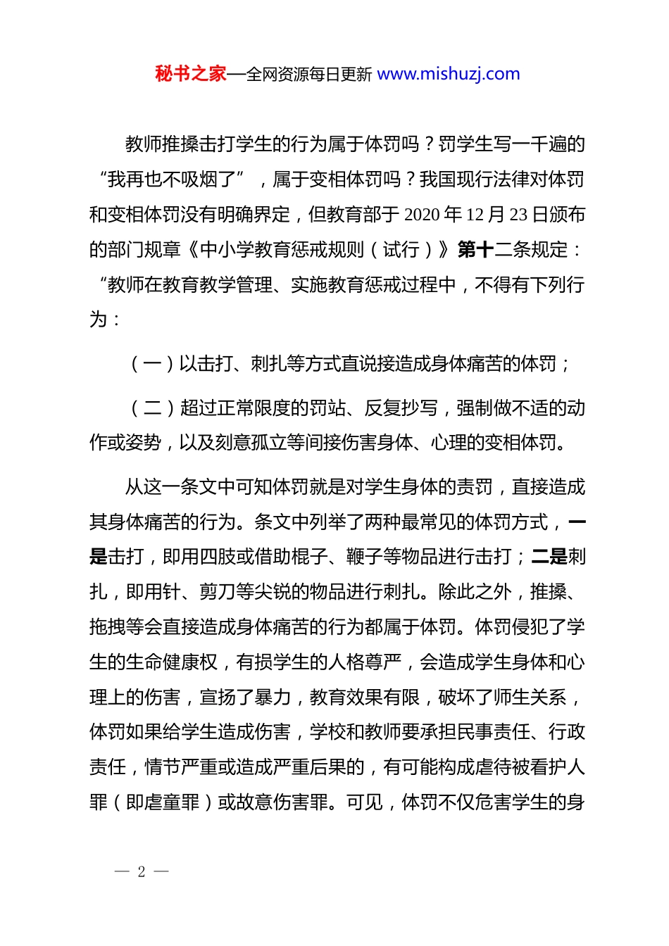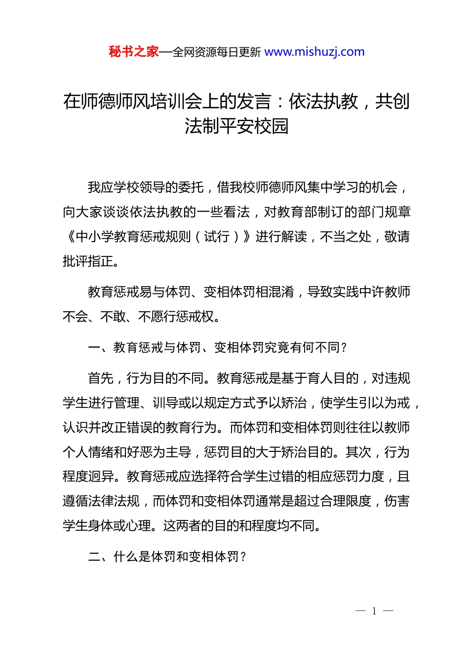 秘书之家—全网资源每日更新 www.mishuzj.com在师德师风培训会上的发言:依法执教,共创法制平安校园我应学校领导的委托,借我校师德师风集中学习的机会,向大家谈谈依法执教的一些看法,对教育部制订的部门规章《中小学教育惩戒规则(试行)》进行解读,不当之处,敬请批评指正。教育惩戒易与体罚、变相体罚相混淆,导致实践中许教师不会、不敢、不愿行惩戒权。一、教育惩戒与体罚、变相体罚究竟有何不同?首先,行为目的不同。教育惩戒是基于育人目的,对违规学生进行管理、训导或以规定方式予以矫治,使学生引以为戒,认识并改正错误的教育行为。而体罚和变相体罚则往往以教师个人情绪和好恶为主导,惩罚目的大于矫治目的。其次,行为程度迥异。教育惩戒应选择符合学生过错的相应惩罚力度,且遵循法律法规,而体罚和变相体罚通常是超过合理限度,伤害学生身体或心理。这两者的目的和程度均不同。二、什么是体罚和变相体罚?— 1 —秘书之家—全网资源每日更新 www.mishuzj.com教师推搡击打学生的行为属于体罚吗?罚学生写一千遍的“我再也不吸烟了”,属于变相体罚吗?我国现行法律对体罚和变相体罚没有明确界定,但教育部于 2020 年 12 月 23 日颁布的部门规章《中小学教育惩戒规则(试行)》第十二条规定:“教师在教育教学管理、实施教育惩戒过程中,不得有下列行为:(一)以击打、刺扎等方式直说接造成身体痛苦的体罚;(二)超过正常限度的罚站、反复抄写,强制做不适的动作或姿势,以及刻意孤立等间接伤害身体、心理的变相体罚。从这一条文中可知体罚就是对学生身体的责罚,直接造成其身体痛苦的行为。条文中列举了两种最常见的体罚方式,一是击打,即用四肢或借助棍子、鞭子等物品进行击打;二是刺扎,即用针、剪刀等尖锐的物品进行刺扎。除此之外,推搡、拖拽等会直接造成身体痛苦的行为都属于体罚。体罚侵犯了学生的生命健康权,有损学生的人格尊严,会造成学生身体和心理上的伤害,宣扬了暴力,教育效果有限,破坏了师生关系,体罚如果给学生造成伤害,学校和教师要承担民事责任、行政责任,情节严重或造成严重后果的,有可能构成虐待被看护人罪(即虐童罪)或故意伤害罪。可见,体罚不仅危害学生的身— 2 —秘书之家—全网资源每日更新 www.mishuzj.com心健康,也会给教师自己带来不利的法律后果。切忌体罚学生,动手你就输了!三百个下蹲,罚抄作业,写一千遍“我再也不打同学了”,属于什么性质的行为?这种行为教师没有直接实施暴力,没有跟学生发生身体接触,肯定不是体罚。实际上是一种变相体罚的行为。我们很多老师都在用,有些还用得得心应手。根据《中小学惩戒规则(试行)》第十二条第二款可知变相体罚有四种常见形式。第一种、超过正常限度的罚站。可以不超过一节课的教室内站立的惩戒,如果让学生在教室门口连站一天,就构成了变相体罚。第二种、超过正常限度的反复抄写。如一数学老师因为学生回答不出一个数字公式,就罚学生把这个公式抄 300 遍,就是变相体罚。第三种、强制做不适的动作或者姿势,如罚学生做 300 个下蹲;学生犯了错误又顶嘴,罚全班同学下跪;罚学生顶着课本站一节课,课本掉下,再罚一节课。像这种让一般人感觉不适的动作或姿势的行为,就属于变相体罚。第四种、刻意孤立学生。如罚学生独坐教室角落、讲台左— 3 —秘书之家—全网资源每日更新 www.mishuzj.com右,要求班上学生孤立、远离某个学生;故意冷落、不理睬学生,对其正常需要不予回应。此外,还有故意不让学生在正常时间上厕所,不让学生正常吃饭,这种剥夺学生正常的生理生活需求的行为,也是变相体罚。以上变相体罚跟实施体罚一样,也应承担相应的法律责任。今年四月十七日,浙江瑞安 59 岁的林老师对喷他水枪学生实施了惩戒不当行为,他受到行政拘留的处罚,这实在应该引起我们深思。对违规违纪学生,学校和教师应当依法依规实施教育惩戒促使学生认识和改正错误。实施教育惩戒应当符合教育规律,注重育人效果;遵循法治原则,做到客观公正;选择适当措施,与学生过错程度相适应。1.教育惩戒权的内容。根据《中小学教育惩戒规则》八至十一条的规...