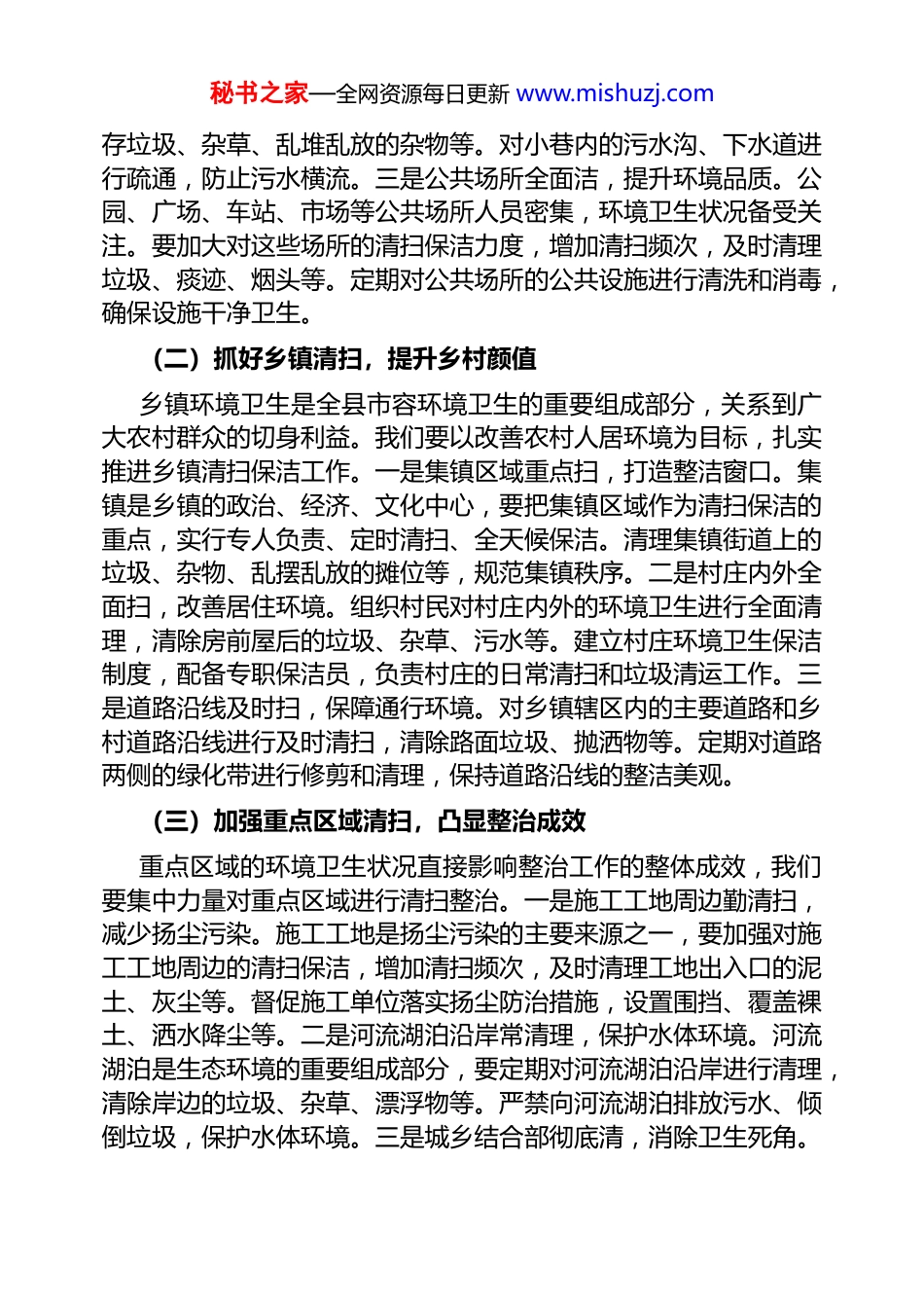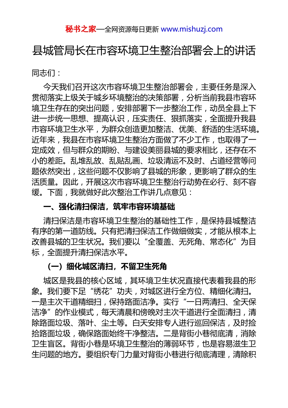 秘书之家—全网资源每日更新 www.mishuzj.com县城管局长在市容环境卫生整治部署会上的讲话同志们:今天我们召开这次市容环境卫生整治部署会,主要任务是深入贯彻落实上级关于城乡环境整治的决策部署,分析当前我县市容环境卫生存在的突出问题,安排部署下一步整治工作,动员全县上下进一步统一思想、提高认识,压实责任、狠抓落实,全面提升我县市容环境卫生水平,为群众创造更加整洁、优美、舒适的生活环境。近年来,我县在市容环境卫生整治方面做了不少工作,也取得了一定成效,但与群众的期盼、与建设美丽县城的要求相比,还存在不小的差距。乱堆乱放、乱贴乱画、垃圾清运不及时、占道经营等问题依然突出,这些问题不仅影响了县城的形象,更影响了群众的生活质量。因此,开展这次市容环境卫生整治行动势在必行、刻不容缓。下面,我就做好此次整治工作讲几点意见:一、强化清扫保洁,筑牢市容环境基础清扫保洁是市容环境卫生整治的基础性工作,是保持县城整洁有序的第一道防线。只有把清扫保洁工作做细做实,才能从根本上改善县城的卫生状况。我们要以“全覆盖、无死角、常态化”为目标,全面提升清扫保洁水平。(一)细化城区清扫,不留卫生死角城区是我县的核心区域,其环境卫生状况直接代表着我县的形象。我们要下足“绣花”功夫,对城区进行全方位、精细化清扫。一是主次干道精细扫,保持路面洁净。实行“一日两清扫、全天保洁净”的作业模式,每天清晨和傍晚对主次干道进行全面清扫,清除路面垃圾、落叶、尘土等。白天安排专人进行巡回保洁,及时捡拾路面垃圾,确保路面始终干净整洁。二是背街小巷彻底清,消除卫生盲区。背街小巷是环境卫生整治的薄弱环节,也是容易滋生卫生问题的地方。要组织专门力量对背街小巷进行彻底清理,清除积秘书之家—全网资源每日更新 www.mishuzj.com存垃圾、杂草、乱堆乱放的杂物等。对小巷内的污水沟、下水道进行疏通,防止污水横流。三是公共场所全面洁,提升环境品质。公园、广场、车站、市场等公共场所人员密集,环境卫生状况备受关注。要加大对这些场所的清扫保洁力度,增加清扫频次,及时清理垃圾、痰迹、烟头等。定期对公共场所的公共设施进行清洗和消毒,确保设施干净卫生。(二)抓好乡镇清扫,提升乡村颜值乡镇环境卫生是全县市容环境卫生的重要组成部分,关系到广大农村群众的切身利益。我们要以改善农村人居环境为目标,扎实推进乡镇清扫保洁工作。一是集镇区域重点扫,打造整洁窗口。集镇是乡镇的政治、经济、文化中心,要把集镇区域作为清扫保洁的重点,实行专人负责、定时清扫、全天候保洁。清理集镇街道上的垃圾、杂物、乱摆乱放的摊位等,规范集镇秩序。二是村庄内外全面扫,改善居住环境。组织村民对村庄内外的环境卫生进行全面清理,清除房前屋后的垃圾、杂草、污水等。建立村庄环境卫生保洁制度,配备专职保洁员,负责村庄的日常清扫和垃圾清运工作。三是道路沿线及时扫,保障通行环境。对乡镇辖区内的主要道路和乡村道路沿线进行及时清扫,清除路面垃圾、抛洒物等。定期对道路两侧的绿化带进行修剪和清理,保持道路沿线的整洁美观。(三)加强重点区域清扫,凸显整治成效重点区域的环境卫生状况直接影响整治工作的整体成效,我们要集中力量对重点区域进行清扫整治。一是施工工地周边勤清扫,减少扬尘污染。施工工地是扬尘污染的主要来源之一,要加强对施工工地周边的清扫保洁,增加清扫频次,及时清理工地出入口的泥土、灰尘等。督促施工单位落实扬尘防治措施,设置围挡、覆盖裸土、洒水降尘等。二是河流湖泊沿岸常清理,保护水体环境。河流湖泊是生态环境的重要组成部分,要定期对河流湖泊沿岸进行清理,清除岸边的垃圾、杂草、漂浮物等。严禁向河流湖泊排放污水、倾倒垃圾,保护水体环境。三是城乡结合部彻底清,消除卫生死角。秘书之家—全网资源每日更新 www.mishuzj.com城乡结合部是环境卫生管理的难点区域,容易出现垃圾积存、乱搭乱建等问题。要组织力量对城乡结合部进行彻底清理,清除积存垃圾、拆除乱搭乱建的建筑物和构筑物等。建立健全城乡结合部环境卫生管理长效机制,防止问题反弹。(四)规范清扫人员...