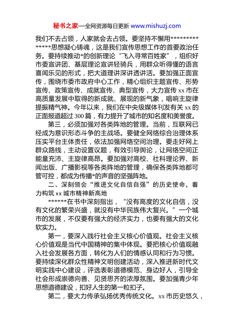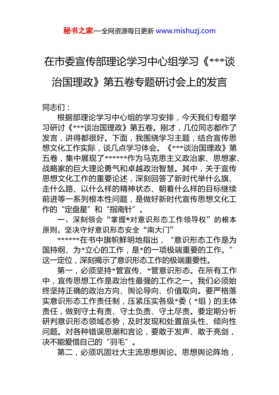 秘书之家—全网资源每日更新 www.mishuzj.com在市委宣传部理论学习中心组学习《***谈治国理政》第五卷专题研讨会上的发言同志们:根据部理论学习中心组的学习安排,今天我们专题学习研讨《***谈治国理政》第五卷。刚才,几位同志都作了发言,讲得都很好。下面,我围绕学习主题,结合宣传思想文化工作实际,谈几点学习体会。《***谈治国理政》第五卷,集中展现了******作为马克思主义政治家、思想家、战略家的巨大理论勇气和卓越政治智慧。其中,关于宣传思想文化工作的重要论述,深刻回答了新时代举什么旗、走什么路、以什么样的精神状态、朝着什么样的目标继续前进等一系列根本性问题,是做好新时代宣传思想文化工作的“定盘星”和“指南针”。一、深刻领会“掌握*对意识形态工作领导权”的根本原则,坚决守好意识形态安全“南大门”******在书中旗帜鲜明地指出,“意识形态工作是为国持纲、为*立心的工作,是*的一项极端重要的工作。”这一定位,深刻揭示了意识形态工作的极端重要性。第一,必须坚持*管宣传、*管意识形态。在所有工作中,宣传思想工作是政治性最强的工作之一。我们必须始终坚持正确的政治方向、舆论导向、价值取向。要严格落实意识形态工作责任制,压紧压实各级*委(*组)的主体责任,做到守土有责、守土负责、守土尽责。要定期分析研判意识形态领域态势,及时发现和处置苗头性、倾向性问题。对各种错误思潮和言论,要敢于发声、敢于亮剑,决不能爱惜自己的“羽毛”。第二,必须巩固壮大主流思想舆论。思想舆论阵地,秘书之家—全网资源每日更新 www.mishuzj.com我们不去占领,人家就会去占领。要坚持不懈用**************思想凝心铸魂,这是我们宣传思想工作的首要政治任务。要持续推动*的创新理论“飞入寻常百姓家”,组织好市委宣讲团、基层理论宣讲轻骑兵,用群众听得懂的语言喜闻乐见的形式,把大道理讲深讲透讲活。要加强正面宣传,围绕市委市政府中心工作,精心组织主题宣传、形势宣传、政策宣传、成就宣传、典型宣传,大力宣传 xx 市在高质量发展中取得的新成就、展现的新气象,唱响主旋律提振精气神。今年以来,我们在中央级媒体刊发有关 xx 的正面报道超过 300 篇,有力提升了城市的知名度和美誉度。第三,必须加强对各类阵地的管理。当前,互联网已经成为意识形态斗争的主战场。要健全网络综合治理体系压实平台主体责任,依法加强网络空间治理。要走好网上群众路线,主动设置议题,有效引导舆论,让网络空间正能量充沛、主旋律高昂。要加强对高校、社科理论界、新闻出版、广播影视等各类阵地的管理,确保各类阵地都可管可控,都成为传播*的声音的坚强阵地。二、深刻领会“推进文化自信自强”的历史使命,着力构筑 xx 城市精神新高地******在书中深刻指出,“没有高度的文化自信,没有文化的繁荣兴盛,就没有中华民族伟大复兴。”一个城市的发展,不仅要有强大的经济实力,也要有强大的文化软实力。第一,要深入践行社会主义核心价值观。社会主义核心价值观是当代中国精神的集中体现。要把核心价值观融入社会发展各方面,转化为人们的情感认同和行为习惯。要持续深化群众性精神文明创建活动,深入推进新时代文明实践中心建设,评选表彰道德模范、身边好人,引导全社会形成崇德向善、见贤思齐的浓厚氛围。要加强青少年思想道德建设,扣好人生的第一粒扣子。第二,要大力传承弘扬优秀传统文化。xx 市历史悠久,秘书之家—全网资源每日更新 www.mishuzj.com文化底蕴深厚。这是我们最宝贵的精神财富。要做好历史文化遗产的保护、传承和利用工作,深入挖掘 xx 红色文化、工业文化、地域文化的时代价值。要推动中华优秀传统文化创造性转化、创新性发展,让收藏在博物馆里的文物、陈列在广阔大地上的遗产、书写在古籍里的文字都活起来我们策划的“xx 古城文化节”系列活动,吸引了超过 500万市民和游客参与,就是一个很好的例子。第三,要繁荣发展文化事业和文化产业。人民对美好生活的向往,包含着丰富的精神文化需求。要坚持以人民为中心的创作导向,推出更多增强人民精神力量的优秀文艺作品。要完善现代公共文化服务体系,加强市、区、街...