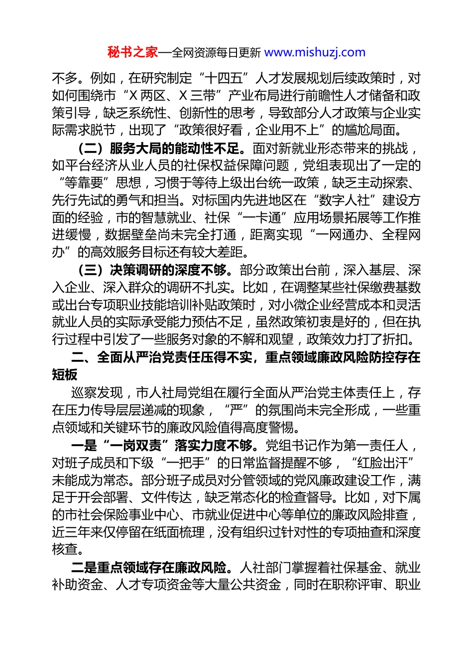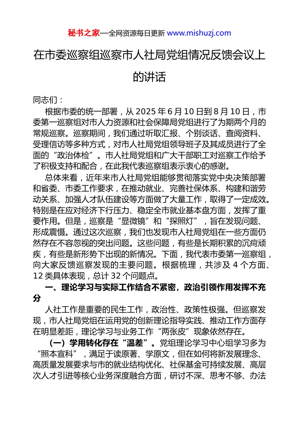 秘书之家—全网资源每日更新 www.mishuzj.com在市委巡察组巡察市人社局党组情况反馈会议上的讲话同志们:根据市委的统一部署,从 2025 年 6 月 10 日到 8 月 10 日,市委第一巡察组对市人力资源和社会保障局党组进行了为期两个月的常规巡察。巡察期间,我们通过听取汇报、个别谈话、查阅资料、受理信访等多种方式,对市人社局党组领导班子及其成员进行了全面的“政治体检”。市人社局党组和广大干部职工对巡察工作给予了积极支持和配合,在此我代表巡察组表示衷心的感谢。总体来看,近年来市人社局党组能够贯彻落实党中央决策部署和省委、市委工作要求,在推动就业、完善社保体系、构建和谐劳动关系、加强人才队伍建设等方面做了大量工作,取得了一定成效。特别是在应对经济下行压力、稳定全市就业基本盘方面,发挥了重要作用。但是,巡察是“显微镜”和“探照灯”,旨在发现问题、形成震慑。通过这次巡察,我们也发现市人社局党组在一些方面仍然存在不容忽视的突出问题。这些问题,有些是长期积累的沉疴顽疾,有些是新形势下出现的新情况。下面,我代表市委第一巡察组,向大家反馈巡察发现的主要问题。根据梳理,共涉及 4 个方面、12 类具体表现,总计 32 个问题点。一、理论学习与实际工作结合不紧密,政治引领作用发挥不充分人社工作是重要的民生工作,政治性、政策性极强。但巡察发现,市人社局党组在运用党的创新理论指导实践、推动工作方面存在明显差距,理论学习与业务工作“两张皮”现象依然存在。(一)学用转化存在“温差”。党组理论学习中心组学习多为“照本宣科”,满足于读原著、学原文,但在如何将新发展理念、高质量发展要求与市的就业结构优化、社保基金可持续发展、高层次人才引进等核心业务深度融合方面,研讨不深、思考不够、办法秘书之家—全网资源每日更新 www.mishuzj.com不多。例如,在研究制定“十四五”人才发展规划后续政策时,对如何围绕市“X 两区、X 三带”产业布局进行前瞻性人才储备和政策引导,缺乏系统性、创新性的思考,导致部分人才政策与企业实际需求脱节,出现了“政策很好看,企业用不上”的尴尬局面。(二)服务大局的能动性不足。面对新就业形态带来的挑战,如平台经济从业人员的社保权益保障问题,党组表现出了一定的“等靠要”思想,习惯于等待上级出台统一政策,缺乏主动探索、先行先试的勇气和担当。对标国内先进地区在“数字人社”建设方面的经验,市的智慧就业、社保“一卡通”应用场景拓展等工作推进缓慢,数据壁垒尚未完全打通,距离实现“一网通办、全程网办”的高效服务目标还有较大差距。(三)决策调研的深度不够。部分政策出台前,深入基层、深入企业、深入群众的调研不扎实。比如,在调整某些社保缴费基数或出台专项职业技能培训补贴政策时,对小微企业经营成本和灵活就业人员的实际承受能力预估不足,虽然政策初衷是好的,但在执行过程中引发了一些服务对象的不解和观望,政策效力打了折扣。二、全面从严治党责任压得不实,重点领域廉政风险防控存在短板巡察发现,市人社局党组在履行全面从严治党主体责任上,存在压力传导层层递减的现象,“严”的氛围尚未完全形成,一些重点领域和关键环节的廉政风险值得高度警惕。一是“一岗双责”落实力度不够。党组书记作为第一责任人,对班子成员和下级“一把手”的日常监督提醒不够,“红脸出汗”未能成为常态。部分班子成员对分管领域的党风廉政建设工作,满足于开会部署、文件传达,缺乏常态化的检查督导。比如,对下属的市社会保险事业中心、市就业促进中心等单位的廉政风险排查,近三年来仅停留在纸面梳理,没有组织过针对性的专项抽查和深度核查。二是重点领域存在廉政风险。人社部门掌握着社保基金、就业补助资金、人才专项资金等大量公共资金,同时在职称评审、职业秘书之家—全网资源每日更新 www.mishuzj.com资格认定、工伤认定等方面拥有一定的自由裁量权。巡察发现,在部分资金的审批和发放环节,审核把关不严。例如,在对 2023 年度“X 技能提升补贴资金”的抽查审计中发现,有高达 15%的资金拨付存在申报材料不全、培训过程记录缺失等程序性...