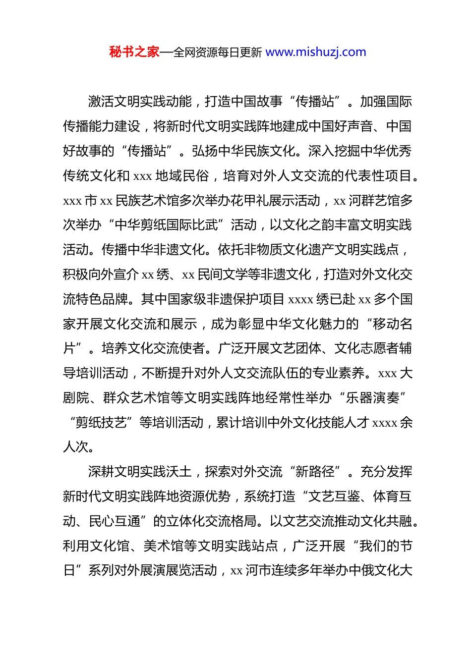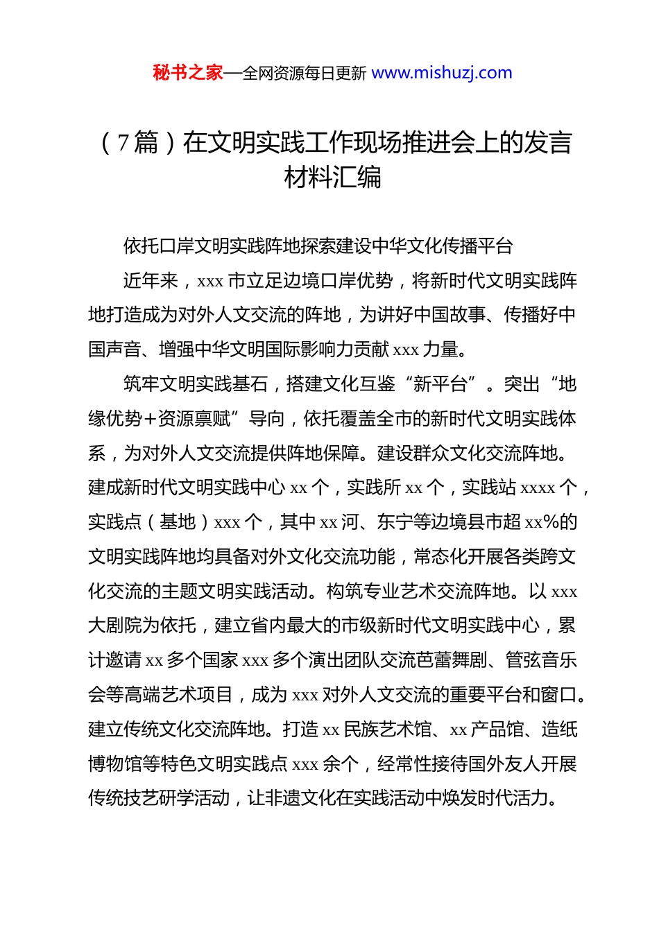 秘书之家—全网资源每日更新 www.mishuzj.com(7 篇)在文明实践工作现场推进会上的发言材料汇编依托口岸文明实践阵地探索建设中华文化传播平台近年来,xxx 市立足边境口岸优势,将新时代文明实践阵地打造成为对外人文交流的阵地,为讲好中国故事、传播好中国声音、增强中华文明国际影响力贡献 xxx 力量。筑牢文明实践基石,搭建文化互鉴“新平台”。突出“地缘优势+资源禀赋”导向,依托覆盖全市的新时代文明实践体系,为对外人文交流提供阵地保障。建设群众文化交流阵地。建成新时代文明实践中心 xx 个,实践所 xx 个,实践站 xxxx 个,实践点(基地)xxx 个,其中 xx 河、东宁等边境县市超 xx%的文明实践阵地均具备对外文化交流功能,常态化开展各类跨文化交流的主题文明实践活动。构筑专业艺术交流阵地。以 xxx大剧院为依托,建立省内最大的市级新时代文明实践中心,累计邀请 xx 多个国家 xxx 多个演出团队交流芭蕾舞剧、管弦音乐会等高端艺术项目,成为 xxx 对外人文交流的重要平台和窗口。建立传统文化交流阵地。打造 xx 民族艺术馆、xx 产品馆、造纸博物馆等特色文明实践点 xxx 余个,经常性接待国外友人开展传统技艺研学活动,让非遗文化在实践活动中焕发时代活力。秘书之家—全网资源每日更新 www.mishuzj.com激活文明实践动能,打造中国故事“传播站”。加强国际传播能力建设,将新时代文明实践阵地建成中国好声音、中国好故事的“传播站”。弘扬中华民族文化。深入挖掘中华优秀传统文化和 xxx 地域民俗,培育对外人文交流的代表性项目。xxx 市 xx 民族艺术馆多次举办花甲礼展示活动,xx 河群艺馆多次举办“中华剪纸国际比武”活动,以文化之韵丰富文明实践活动。传播中华非遗文化。依托非物质文化遗产文明实践点,积极向外宣介 xx 绣、xx 民间文学等非遗文化,打造对外文化交流特色品牌。其中国家级非遗保护项目 xxxx 绣已赴 xx 多个国家开展文化交流和展示,成为彰显中华文化魅力的“移动名片”。培养文化交流使者。广泛开展文艺团体、文化志愿者辅导培训活动,不断提升对外人文交流队伍的专业素养。xxx 大剧院、群众艺术馆等文明实践阵地经常性举办“乐器演奏”“剪纸技艺”等培训活动,累计培训中外文化技能人才 xxxx 余人次。深耕文明实践沃土,探索对外交流“新路径”。充分发挥新时代文明实践阵地资源优势,系统打造“文艺互鉴、体育互动、民心互通”的立体化交流格局。以文艺交流推动文化共融。利用文化馆、美术馆等文明实践站点,广泛开展“我们的节日”系列对外展演展览活动,xx 河市连续多年举办中俄文化大秘书之家—全网资源每日更新 www.mishuzj.com集、中俄油画展,东宁市每年邀请外国友人到新时代文明实践中心参加节庆晚会,以文艺联欢搭建中外友谊桥梁。以赛事交流推动文化传递。利用体育场、活动中心等文明实践站点,举办国际拳击擂台赛、速度滑冰赛等体育活动,xx 河市连续多年举办中俄体育大会,xx 市举办冰球运动爱好者互访交流活动,以体育赛事激扬睦邻合作风采。以人员交流推动文化传播。依托图书馆、青少年活动中心等文明实践阵地,广泛开展访问交流、国际研学等活动,目前已组织 xxxx 余人次俄罗斯“小套娃”到 xxx、xx 河等地开展研学,让文明互鉴的种子在青少年心中生根发芽,为中外友好谱写新的时代篇章。下一步,xxx 市将以“身在最北方、心向*中央”的政治忠诚,更好发挥新时代文明实践阵地对外文化交流辐射带动作用,为扩大文化交流、促进文明互鉴、推动构建人类命运共同体添砖加瓦。创新引领融合共享积极探索新时代文明实践“xx 路径”近年来,在省委宣传部的精心指导下,xx 市立足实际,探索新时代文明实践新路径,在精准谋划中构建联动格局,在载体创新中破解实践难题,在为民服务中筑牢群众基础,为推进城市文明建设注入了强劲动力。一、加强资源整合,阵地全域覆盖“活起来”秘书之家—全网资源每日更新 www.mishuzj.com一是强化顶层设计,绘制“一张蓝图”。在全省率先设立市、县两级新时代文明实践中心工作机构,配备专职人员 xx 名,形成上下贯通、左右协同的工作体系...